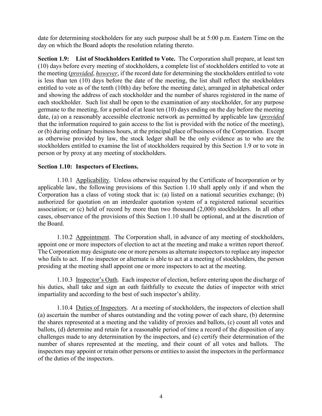 4 date for determining stockholders for any such purpose shall be at 5:00 p.m. Eastern Time on the day on which the Board adopts the resolution relating thereto. Section 1.9: List of Stockholders Entitled to Vote. The Corporation shall prepare, at least ten (10) days before every meeting of stockholders, a complete list of stockholders entitled to vote at the meeting (provided, however, if the record date for determining the stockholders entitled to vote is less than ten (10) days before the date of the meeting, the list shall reflect the stockholders entitled to vote as of the tenth (10th) day before the meeting date), arranged in alphabetical order and showing the address of each stockholder and the number of shares registered in the name of each stockholder. Such list shall be open to the examination of any stockholder, for any purpose germane to the meeting, for a period of at least ten (10) days ending on the day before the meeting date, (a) on a reasonably accessible electronic network as permitted by applicable law (provided that the information required to gain access to the list is provided with the notice of the meeting), or (b) during ordinary business hours, at the principal place of business of the Corporation. Except as otherwise provided by law, the stock ledger shall be the only evidence as to who are the stockholders entitled to examine the list of stockholders required by this Section 1.9 or to vote in person or by proxy at any meeting of stockholders. Section 1.10: Inspectors of Elections. 1.10.1 Applicability. Unless otherwise required by the Certificate of Incorporation or by applicable law, the following provisions of this Section 1.10 shall apply only if and when the Corporation has a class of voting stock that is: (a) listed on a national securities exchange; (b) authorized for quotation on an interdealer quotation system of a registered national securities association; or (c) held of record by more than two thousand (2,000) stockholders. In all other cases, observance of the provisions of this Section 1.10 shall be optional, and at the discretion of the Board. 1.10.2 Appointment. The Corporation shall, in advance of any meeting of stockholders, appoint one or more inspectors of election to act at the meeting and make a written report thereof. The Corporation may designate one or more persons as alternate inspectors to replace any inspector who fails to act. If no inspector or alternate is able to act at a meeting of stockholders, the person presiding at the meeting shall appoint one or more inspectors to act at the meeting. 1.10.3 Inspector’s Oath. Each inspector of election, before entering upon the discharge of his duties, shall take and sign an oath faithfully to execute the duties of inspector with strict impartiality and according to the best of such inspector’s ability. 1.10.4 Duties of Inspectors. At a meeting of stockholders, the inspectors of election shall (a) ascertain the number of shares outstanding and the voting power of each share, (b) determine the shares represented at a meeting and the validity of proxies and ballots, (c) count all votes and ballots, (d) determine and retain for a reasonable period of time a record of the disposition of any challenges made to any determination by the inspectors, and (e) certify their determination of the number of shares represented at the meeting, and their count of all votes and ballots. The inspectors may appoint or retain other persons or entities to assist the inspectors in the performance of the duties of the inspectors.