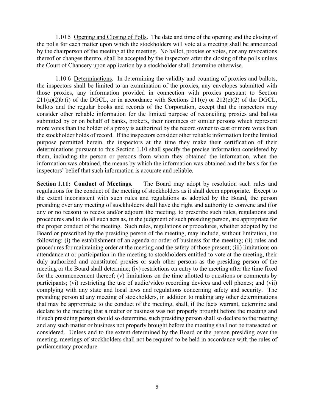 5 1.10.5 Opening and Closing of Polls. The date and time of the opening and the closing of the polls for each matter upon which the stockholders will vote at a meeting shall be announced by the chairperson of the meeting at the meeting. No ballot, proxies or votes, nor any revocations thereof or changes thereto, shall be accepted by the inspectors after the closing of the polls unless the Court of Chancery upon application by a stockholder shall determine otherwise. 1.10.6 Determinations. In determining the validity and counting of proxies and ballots, the inspectors shall be limited to an examination of the proxies, any envelopes submitted with those proxies, any information provided in connection with proxies pursuant to Section 211(a)(2)b.(i) of the DGCL, or in accordance with Sections 211(e) or 212(c)(2) of the DGCL, ballots and the regular books and records of the Corporation, except that the inspectors may consider other reliable information for the limited purpose of reconciling proxies and ballots submitted by or on behalf of banks, brokers, their nominees or similar persons which represent more votes than the holder of a proxy is authorized by the record owner to cast or more votes than the stockholder holds of record. If the inspectors consider other reliable information for the limited purpose permitted herein, the inspectors at the time they make their certification of their determinations pursuant to this Section 1.10 shall specify the precise information considered by them, including the person or persons from whom they obtained the information, when the information was obtained, the means by which the information was obtained and the basis for the inspectors’ belief that such information is accurate and reliable. Section 1.11: Conduct of Meetings. The Board may adopt by resolution such rules and regulations for the conduct of the meeting of stockholders as it shall deem appropriate. Except to the extent inconsistent with such rules and regulations as adopted by the Board, the person presiding over any meeting of stockholders shall have the right and authority to convene and (for any or no reason) to recess and/or adjourn the meeting, to prescribe such rules, regulations and procedures and to do all such acts as, in the judgment of such presiding person, are appropriate for the proper conduct of the meeting. Such rules, regulations or procedures, whether adopted by the Board or prescribed by the presiding person of the meeting, may include, without limitation, the following: (i) the establishment of an agenda or order of business for the meeting; (ii) rules and procedures for maintaining order at the meeting and the safety of those present; (iii) limitations on attendance at or participation in the meeting to stockholders entitled to vote at the meeting, their duly authorized and constituted proxies or such other persons as the presiding person of the meeting or the Board shall determine; (iv) restrictions on entry to the meeting after the time fixed for the commencement thereof; (v) limitations on the time allotted to questions or comments by participants; (vi) restricting the use of audio/video recording devices and cell phones; and (vii) complying with any state and local laws and regulations concerning safety and security. The presiding person at any meeting of stockholders, in addition to making any other determinations that may be appropriate to the conduct of the meeting, shall, if the facts warrant, determine and declare to the meeting that a matter or business was not properly brought before the meeting and if such presiding person should so determine, such presiding person shall so declare to the meeting and any such matter or business not properly brought before the meeting shall not be transacted or considered. Unless and to the extent determined by the Board or the person presiding over the meeting, meetings of stockholders shall not be required to be held in accordance with the rules of parliamentary procedure.