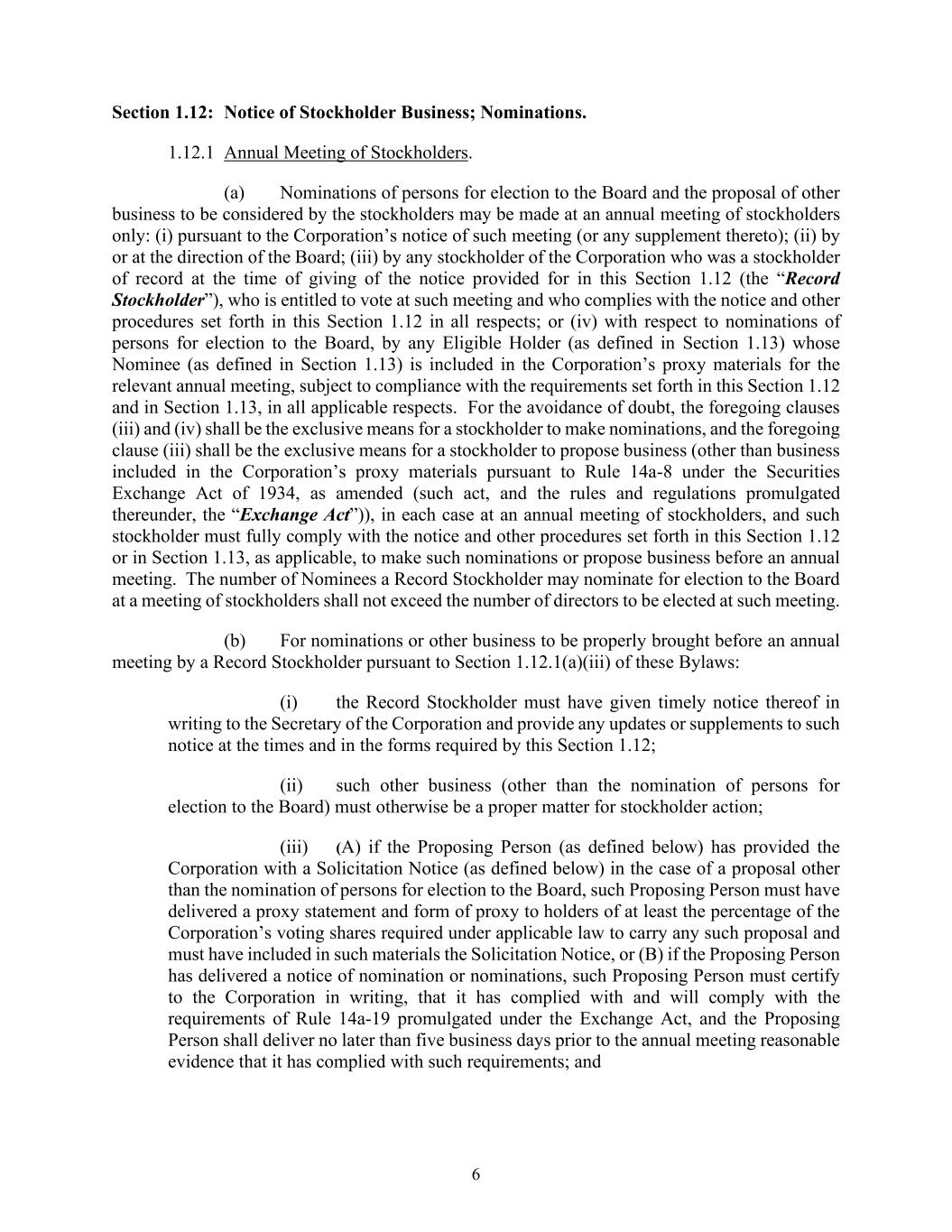 6 Section 1.12: Notice of Stockholder Business; Nominations. 1.12.1 Annual Meeting of Stockholders. (a) Nominations of persons for election to the Board and the proposal of other business to be considered by the stockholders may be made at an annual meeting of stockholders only: (i) pursuant to the Corporation’s notice of such meeting (or any supplement thereto); (ii) by or at the direction of the Board; (iii) by any stockholder of the Corporation who was a stockholder of record at the time of giving of the notice provided for in this Section 1.12 (the “Record Stockholder”), who is entitled to vote at such meeting and who complies with the notice and other procedures set forth in this Section 1.12 in all respects; or (iv) with respect to nominations of persons for election to the Board, by any Eligible Holder (as defined in Section 1.13) whose Nominee (as defined in Section 1.13) is included in the Corporation’s proxy materials for the relevant annual meeting, subject to compliance with the requirements set forth in this Section 1.12 and in Section 1.13, in all applicable respects. For the avoidance of doubt, the foregoing clauses (iii) and (iv) shall be the exclusive means for a stockholder to make nominations, and the foregoing clause (iii) shall be the exclusive means for a stockholder to propose business (other than business included in the Corporation’s proxy materials pursuant to Rule 14a-8 under the Securities Exchange Act of 1934, as amended (such act, and the rules and regulations promulgated thereunder, the “Exchange Act”)), in each case at an annual meeting of stockholders, and such stockholder must fully comply with the notice and other procedures set forth in this Section 1.12 or in Section 1.13, as applicable, to make such nominations or propose business before an annual meeting. The number of Nominees a Record Stockholder may nominate for election to the Board at a meeting of stockholders shall not exceed the number of directors to be elected at such meeting. (b) For nominations or other business to be properly brought before an annual meeting by a Record Stockholder pursuant to Section 1.12.1(a)(iii) of these Bylaws: (i) the Record Stockholder must have given timely notice thereof in writing to the Secretary of the Corporation and provide any updates or supplements to such notice at the times and in the forms required by this Section 1.12; (ii) such other business (other than the nomination of persons for election to the Board) must otherwise be a proper matter for stockholder action; (iii) (A) if the Proposing Person (as defined below) has provided the Corporation with a Solicitation Notice (as defined below) in the case of a proposal other than the nomination of persons for election to the Board, such Proposing Person must have delivered a proxy statement and form of proxy to holders of at least the percentage of the Corporation’s voting shares required under applicable law to carry any such proposal and must have included in such materials the Solicitation Notice, or (B) if the Proposing Person has delivered a notice of nomination or nominations, such Proposing Person must certify to the Corporation in writing, that it has complied with and will comply with the requirements of Rule 14a-19 promulgated under the Exchange Act, and the Proposing Person shall deliver no later than five business days prior to the annual meeting reasonable evidence that it has complied with such requirements; and