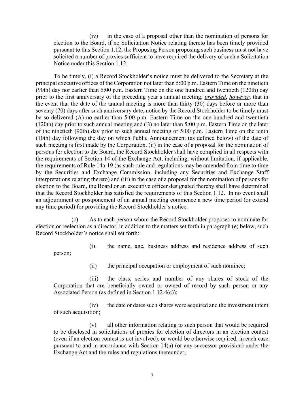 7 (iv) in the case of a proposal other than the nomination of persons for election to the Board, if no Solicitation Notice relating thereto has been timely provided pursuant to this Section 1.12, the Proposing Person proposing such business must not have solicited a number of proxies sufficient to have required the delivery of such a Solicitation Notice under this Section 1.12. To be timely, (i) a Record Stockholder’s notice must be delivered to the Secretary at the principal executive offices of the Corporation not later than 5:00 p.m. Eastern Time on the ninetieth (90th) day nor earlier than 5:00 p.m. Eastern Time on the one hundred and twentieth (120th) day prior to the first anniversary of the preceding year’s annual meeting; provided, however, that in the event that the date of the annual meeting is more than thirty (30) days before or more than seventy (70) days after such anniversary date, notice by the Record Stockholder to be timely must be so delivered (A) no earlier than 5:00 p.m. Eastern Time on the one hundred and twentieth (120th) day prior to such annual meeting and (B) no later than 5:00 p.m. Eastern Time on the later of the ninetieth (90th) day prior to such annual meeting or 5:00 p.m. Eastern Time on the tenth (10th) day following the day on which Public Announcement (as defined below) of the date of such meeting is first made by the Corporation, (ii) in the case of a proposal for the nomination of persons for election to the Board, the Record Stockholder shall have complied in all respects with the requirements of Section 14 of the Exchange Act, including, without limitation, if applicable, the requirements of Rule 14a-19 (as such rule and regulations may be amended from time to time by the Securities and Exchange Commission, including any Securities and Exchange Staff interpretations relating thereto) and (iii) in the case of a proposal for the nomination of persons for election to the Board, the Board or an executive officer designated thereby shall have determined that the Record Stockholder has satisfied the requirements of this Section 1.12. In no event shall an adjournment or postponement of an annual meeting commence a new time period (or extend any time period) for providing the Record Stockholder’s notice. (c) As to each person whom the Record Stockholder proposes to nominate for election or reelection as a director, in addition to the matters set forth in paragraph (e) below, such Record Stockholder’s notice shall set forth: (i) the name, age, business address and residence address of such person; (ii) the principal occupation or employment of such nominee; (iii) the class, series and number of any shares of stock of the Corporation that are beneficially owned or owned of record by such person or any Associated Person (as defined in Section 1.12.4(c)); (iv) the date or dates such shares were acquired and the investment intent of such acquisition; (v) all other information relating to such person that would be required to be disclosed in solicitations of proxies for election of directors in an election contest (even if an election contest is not involved), or would be otherwise required, in each case pursuant to and in accordance with Section 14(a) (or any successor provision) under the Exchange Act and the rules and regulations thereunder;