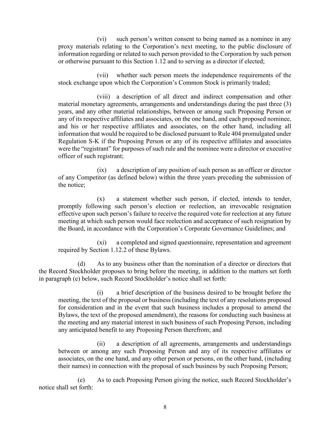 8 (vi) such person’s written consent to being named as a nominee in any proxy materials relating to the Corporation’s next meeting, to the public disclosure of information regarding or related to such person provided to the Corporation by such person or otherwise pursuant to this Section 1.12 and to serving as a director if elected; (vii) whether such person meets the independence requirements of the stock exchange upon which the Corporation’s Common Stock is primarily traded; (viii) a description of all direct and indirect compensation and other material monetary agreements, arrangements and understandings during the past three (3) years, and any other material relationships, between or among such Proposing Person or any of its respective affiliates and associates, on the one hand, and each proposed nominee, and his or her respective affiliates and associates, on the other hand, including all information that would be required to be disclosed pursuant to Rule 404 promulgated under Regulation S-K if the Proposing Person or any of its respective affiliates and associates were the “registrant” for purposes of such rule and the nominee were a director or executive officer of such registrant; (ix) a description of any position of such person as an officer or director of any Competitor (as defined below) within the three years preceding the submission of the notice; (x) a statement whether such person, if elected, intends to tender, promptly following such person’s election or reelection, an irrevocable resignation effective upon such person’s failure to receive the required vote for reelection at any future meeting at which such person would face reelection and acceptance of such resignation by the Board, in accordance with the Corporation’s Corporate Governance Guidelines; and (xi) a completed and signed questionnaire, representation and agreement required by Section 1.12.2 of these Bylaws. (d) As to any business other than the nomination of a director or directors that the Record Stockholder proposes to bring before the meeting, in addition to the matters set forth in paragraph (e) below, such Record Stockholder’s notice shall set forth: (i) a brief description of the business desired to be brought before the meeting, the text of the proposal or business (including the text of any resolutions proposed for consideration and in the event that such business includes a proposal to amend the Bylaws, the text of the proposed amendment), the reasons for conducting such business at the meeting and any material interest in such business of such Proposing Person, including any anticipated benefit to any Proposing Person therefrom; and (ii) a description of all agreements, arrangements and understandings between or among any such Proposing Person and any of its respective affiliates or associates, on the one hand, and any other person or persons, on the other hand, (including their names) in connection with the proposal of such business by such Proposing Person; (e) As to each Proposing Person giving the notice, such Record Stockholder’s notice shall set forth: