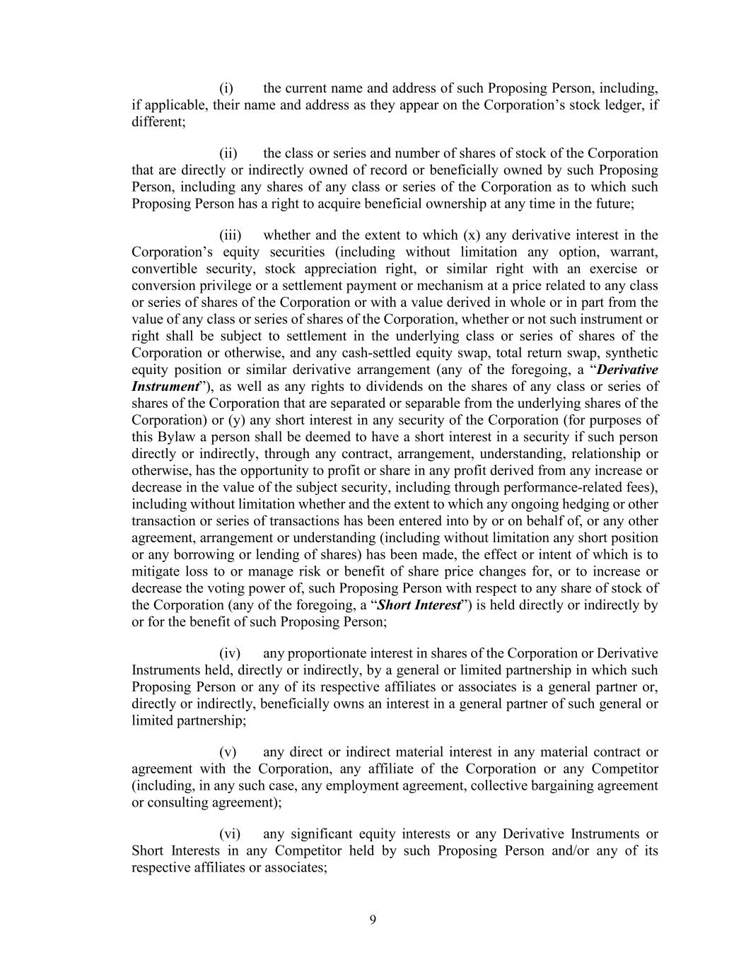 9 (i) the current name and address of such Proposing Person, including, if applicable, their name and address as they appear on the Corporation’s stock ledger, if different; (ii) the class or series and number of shares of stock of the Corporation that are directly or indirectly owned of record or beneficially owned by such Proposing Person, including any shares of any class or series of the Corporation as to which such Proposing Person has a right to acquire beneficial ownership at any time in the future; (iii) whether and the extent to which (x) any derivative interest in the Corporation’s equity securities (including without limitation any option, warrant, convertible security, stock appreciation right, or similar right with an exercise or conversion privilege or a settlement payment or mechanism at a price related to any class or series of shares of the Corporation or with a value derived in whole or in part from the value of any class or series of shares of the Corporation, whether or not such instrument or right shall be subject to settlement in the underlying class or series of shares of the Corporation or otherwise, and any cash-settled equity swap, total return swap, synthetic equity position or similar derivative arrangement (any of the foregoing, a “Derivative Instrument”), as well as any rights to dividends on the shares of any class or series of shares of the Corporation that are separated or separable from the underlying shares of the Corporation) or (y) any short interest in any security of the Corporation (for purposes of this Bylaw a person shall be deemed to have a short interest in a security if such person directly or indirectly, through any contract, arrangement, understanding, relationship or otherwise, has the opportunity to profit or share in any profit derived from any increase or decrease in the value of the subject security, including through performance-related fees), including without limitation whether and the extent to which any ongoing hedging or other transaction or series of transactions has been entered into by or on behalf of, or any other agreement, arrangement or understanding (including without limitation any short position or any borrowing or lending of shares) has been made, the effect or intent of which is to mitigate loss to or manage risk or benefit of share price changes for, or to increase or decrease the voting power of, such Proposing Person with respect to any share of stock of the Corporation (any of the foregoing, a “Short Interest”) is held directly or indirectly by or for the benefit of such Proposing Person; (iv) any proportionate interest in shares of the Corporation or Derivative Instruments held, directly or indirectly, by a general or limited partnership in which such Proposing Person or any of its respective affiliates or associates is a general partner or, directly or indirectly, beneficially owns an interest in a general partner of such general or limited partnership; (v) any direct or indirect material interest in any material contract or agreement with the Corporation, any affiliate of the Corporation or any Competitor (including, in any such case, any employment agreement, collective bargaining agreement or consulting agreement); (vi) any significant equity interests or any Derivative Instruments or Short Interests in any Competitor held by such Proposing Person and/or any of its respective affiliates or associates;