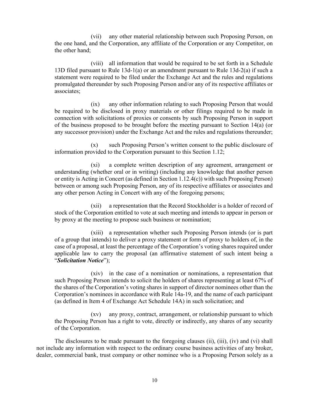 10 (vii) any other material relationship between such Proposing Person, on the one hand, and the Corporation, any affiliate of the Corporation or any Competitor, on the other hand; (viii) all information that would be required to be set forth in a Schedule 13D filed pursuant to Rule 13d-1(a) or an amendment pursuant to Rule 13d-2(a) if such a statement were required to be filed under the Exchange Act and the rules and regulations promulgated thereunder by such Proposing Person and/or any of its respective affiliates or associates; (ix) any other information relating to such Proposing Person that would be required to be disclosed in proxy materials or other filings required to be made in connection with solicitations of proxies or consents by such Proposing Person in support of the business proposed to be brought before the meeting pursuant to Section 14(a) (or any successor provision) under the Exchange Act and the rules and regulations thereunder; (x) such Proposing Person’s written consent to the public disclosure of information provided to the Corporation pursuant to this Section 1.12; (xi) a complete written description of any agreement, arrangement or understanding (whether oral or in writing) (including any knowledge that another person or entity is Acting in Concert (as defined in Section 1.12.4(c)) with such Proposing Person) between or among such Proposing Person, any of its respective affiliates or associates and any other person Acting in Concert with any of the foregoing persons; (xii) a representation that the Record Stockholder is a holder of record of stock of the Corporation entitled to vote at such meeting and intends to appear in person or by proxy at the meeting to propose such business or nomination; (xiii) a representation whether such Proposing Person intends (or is part of a group that intends) to deliver a proxy statement or form of proxy to holders of, in the case of a proposal, at least the percentage of the Corporation’s voting shares required under applicable law to carry the proposal (an affirmative statement of such intent being a “Solicitation Notice”); (xiv) in the case of a nomination or nominations, a representation that such Proposing Person intends to solicit the holders of shares representing at least 67% of the shares of the Corporation’s voting shares in support of director nominees other than the Corporation’s nominees in accordance with Rule 14a-19, and the name of each participant (as defined in Item 4 of Exchange Act Schedule 14A) in such solicitation; and (xv) any proxy, contract, arrangement, or relationship pursuant to which the Proposing Person has a right to vote, directly or indirectly, any shares of any security of the Corporation. The disclosures to be made pursuant to the foregoing clauses (ii), (iii), (iv) and (vi) shall not include any information with respect to the ordinary course business activities of any broker, dealer, commercial bank, trust company or other nominee who is a Proposing Person solely as a