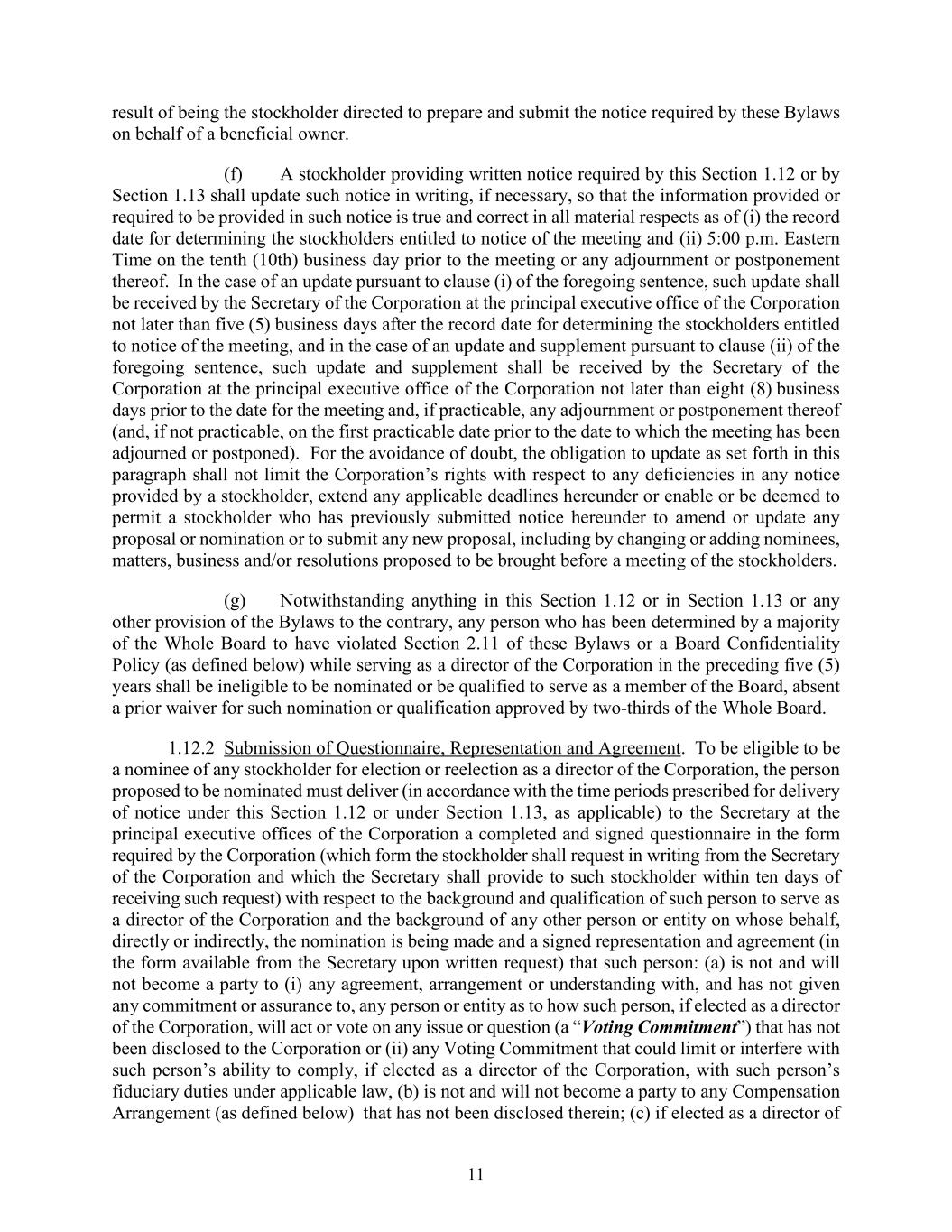 11 result of being the stockholder directed to prepare and submit the notice required by these Bylaws on behalf of a beneficial owner. (f) A stockholder providing written notice required by this Section 1.12 or by Section 1.13 shall update such notice in writing, if necessary, so that the information provided or required to be provided in such notice is true and correct in all material respects as of (i) the record date for determining the stockholders entitled to notice of the meeting and (ii) 5:00 p.m. Eastern Time on the tenth (10th) business day prior to the meeting or any adjournment or postponement thereof. In the case of an update pursuant to clause (i) of the foregoing sentence, such update shall be received by the Secretary of the Corporation at the principal executive office of the Corporation not later than five (5) business days after the record date for determining the stockholders entitled to notice of the meeting, and in the case of an update and supplement pursuant to clause (ii) of the foregoing sentence, such update and supplement shall be received by the Secretary of the Corporation at the principal executive office of the Corporation not later than eight (8) business days prior to the date for the meeting and, if practicable, any adjournment or postponement thereof (and, if not practicable, on the first practicable date prior to the date to which the meeting has been adjourned or postponed). For the avoidance of doubt, the obligation to update as set forth in this paragraph shall not limit the Corporation’s rights with respect to any deficiencies in any notice provided by a stockholder, extend any applicable deadlines hereunder or enable or be deemed to permit a stockholder who has previously submitted notice hereunder to amend or update any proposal or nomination or to submit any new proposal, including by changing or adding nominees, matters, business and/or resolutions proposed to be brought before a meeting of the stockholders. (g) Notwithstanding anything in this Section 1.12 or in Section 1.13 or any other provision of the Bylaws to the contrary, any person who has been determined by a majority of the Whole Board to have violated Section 2.11 of these Bylaws or a Board Confidentiality Policy (as defined below) while serving as a director of the Corporation in the preceding five (5) years shall be ineligible to be nominated or be qualified to serve as a member of the Board, absent a prior waiver for such nomination or qualification approved by two-thirds of the Whole Board. 1.12.2 Submission of Questionnaire, Representation and Agreement. To be eligible to be a nominee of any stockholder for election or reelection as a director of the Corporation, the person proposed to be nominated must deliver (in accordance with the time periods prescribed for delivery of notice under this Section 1.12 or under Section 1.13, as applicable) to the Secretary at the principal executive offices of the Corporation a completed and signed questionnaire in the form required by the Corporation (which form the stockholder shall request in writing from the Secretary of the Corporation and which the Secretary shall provide to such stockholder within ten days of receiving such request) with respect to the background and qualification of such person to serve as a director of the Corporation and the background of any other person or entity on whose behalf, directly or indirectly, the nomination is being made and a signed representation and agreement (in the form available from the Secretary upon written request) that such person: (a) is not and will not become a party to (i) any agreement, arrangement or understanding with, and has not given any commitment or assurance to, any person or entity as to how such person, if elected as a director of the Corporation, will act or vote on any issue or question (a “Voting Commitment”) that has not been disclosed to the Corporation or (ii) any Voting Commitment that could limit or interfere with such person’s ability to comply, if elected as a director of the Corporation, with such person’s fiduciary duties under applicable law, (b) is not and will not become a party to any Compensation Arrangement (as defined below) that has not been disclosed therein; (c) if elected as a director of