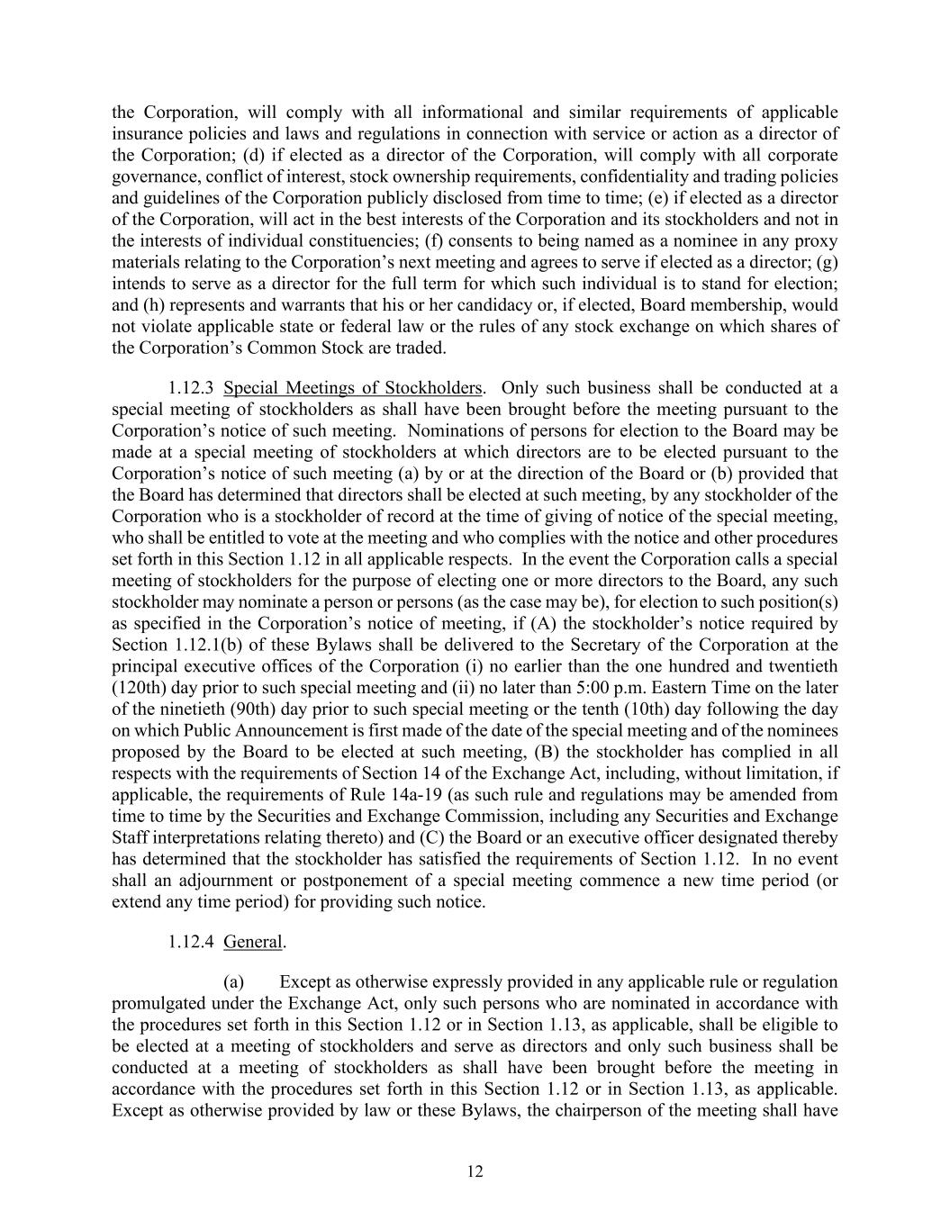 12 the Corporation, will comply with all informational and similar requirements of applicable insurance policies and laws and regulations in connection with service or action as a director of the Corporation; (d) if elected as a director of the Corporation, will comply with all corporate governance, conflict of interest, stock ownership requirements, confidentiality and trading policies and guidelines of the Corporation publicly disclosed from time to time; (e) if elected as a director of the Corporation, will act in the best interests of the Corporation and its stockholders and not in the interests of individual constituencies; (f) consents to being named as a nominee in any proxy materials relating to the Corporation’s next meeting and agrees to serve if elected as a director; (g) intends to serve as a director for the full term for which such individual is to stand for election; and (h) represents and warrants that his or her candidacy or, if elected, Board membership, would not violate applicable state or federal law or the rules of any stock exchange on which shares of the Corporation’s Common Stock are traded. 1.12.3 Special Meetings of Stockholders. Only such business shall be conducted at a special meeting of stockholders as shall have been brought before the meeting pursuant to the Corporation’s notice of such meeting. Nominations of persons for election to the Board may be made at a special meeting of stockholders at which directors are to be elected pursuant to the Corporation’s notice of such meeting (a) by or at the direction of the Board or (b) provided that the Board has determined that directors shall be elected at such meeting, by any stockholder of the Corporation who is a stockholder of record at the time of giving of notice of the special meeting, who shall be entitled to vote at the meeting and who complies with the notice and other procedures set forth in this Section 1.12 in all applicable respects. In the event the Corporation calls a special meeting of stockholders for the purpose of electing one or more directors to the Board, any such stockholder may nominate a person or persons (as the case may be), for election to such position(s) as specified in the Corporation’s notice of meeting, if (A) the stockholder’s notice required by Section 1.12.1(b) of these Bylaws shall be delivered to the Secretary of the Corporation at the principal executive offices of the Corporation (i) no earlier than the one hundred and twentieth (120th) day prior to such special meeting and (ii) no later than 5:00 p.m. Eastern Time on the later of the ninetieth (90th) day prior to such special meeting or the tenth (10th) day following the day on which Public Announcement is first made of the date of the special meeting and of the nominees proposed by the Board to be elected at such meeting, (B) the stockholder has complied in all respects with the requirements of Section 14 of the Exchange Act, including, without limitation, if applicable, the requirements of Rule 14a-19 (as such rule and regulations may be amended from time to time by the Securities and Exchange Commission, including any Securities and Exchange Staff interpretations relating thereto) and (C) the Board or an executive officer designated thereby has determined that the stockholder has satisfied the requirements of Section 1.12. In no event shall an adjournment or postponement of a special meeting commence a new time period (or extend any time period) for providing such notice. 1.12.4 General. (a) Except as otherwise expressly provided in any applicable rule or regulation promulgated under the Exchange Act, only such persons who are nominated in accordance with the procedures set forth in this Section 1.12 or in Section 1.13, as applicable, shall be eligible to be elected at a meeting of stockholders and serve as directors and only such business shall be conducted at a meeting of stockholders as shall have been brought before the meeting in accordance with the procedures set forth in this Section 1.12 or in Section 1.13, as applicable. Except as otherwise provided by law or these Bylaws, the chairperson of the meeting shall have