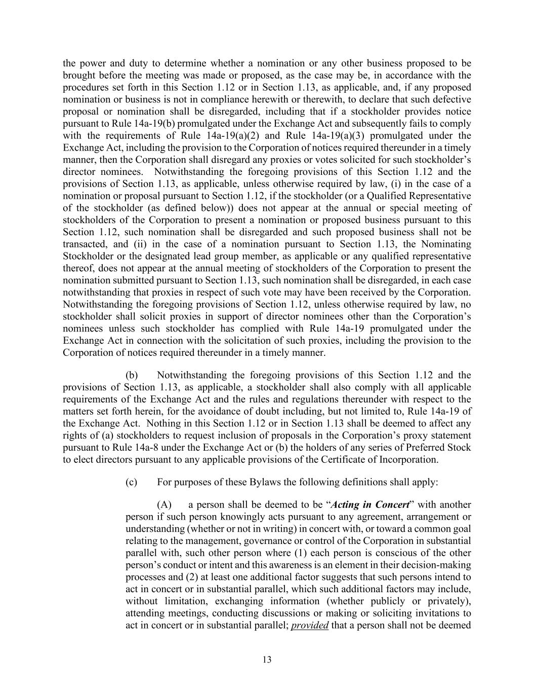13 the power and duty to determine whether a nomination or any other business proposed to be brought before the meeting was made or proposed, as the case may be, in accordance with the procedures set forth in this Section 1.12 or in Section 1.13, as applicable, and, if any proposed nomination or business is not in compliance herewith or therewith, to declare that such defective proposal or nomination shall be disregarded, including that if a stockholder provides notice pursuant to Rule 14a-19(b) promulgated under the Exchange Act and subsequently fails to comply with the requirements of Rule 14a-19(a)(2) and Rule 14a-19(a)(3) promulgated under the Exchange Act, including the provision to the Corporation of notices required thereunder in a timely manner, then the Corporation shall disregard any proxies or votes solicited for such stockholder’s director nominees. Notwithstanding the foregoing provisions of this Section 1.12 and the provisions of Section 1.13, as applicable, unless otherwise required by law, (i) in the case of a nomination or proposal pursuant to Section 1.12, if the stockholder (or a Qualified Representative of the stockholder (as defined below)) does not appear at the annual or special meeting of stockholders of the Corporation to present a nomination or proposed business pursuant to this Section 1.12, such nomination shall be disregarded and such proposed business shall not be transacted, and (ii) in the case of a nomination pursuant to Section 1.13, the Nominating Stockholder or the designated lead group member, as applicable or any qualified representative thereof, does not appear at the annual meeting of stockholders of the Corporation to present the nomination submitted pursuant to Section 1.13, such nomination shall be disregarded, in each case notwithstanding that proxies in respect of such vote may have been received by the Corporation. Notwithstanding the foregoing provisions of Section 1.12, unless otherwise required by law, no stockholder shall solicit proxies in support of director nominees other than the Corporation’s nominees unless such stockholder has complied with Rule 14a-19 promulgated under the Exchange Act in connection with the solicitation of such proxies, including the provision to the Corporation of notices required thereunder in a timely manner. (b) Notwithstanding the foregoing provisions of this Section 1.12 and the provisions of Section 1.13, as applicable, a stockholder shall also comply with all applicable requirements of the Exchange Act and the rules and regulations thereunder with respect to the matters set forth herein, for the avoidance of doubt including, but not limited to, Rule 14a-19 of the Exchange Act. Nothing in this Section 1.12 or in Section 1.13 shall be deemed to affect any rights of (a) stockholders to request inclusion of proposals in the Corporation’s proxy statement pursuant to Rule 14a-8 under the Exchange Act or (b) the holders of any series of Preferred Stock to elect directors pursuant to any applicable provisions of the Certificate of Incorporation. (c) For purposes of these Bylaws the following definitions shall apply: (A) a person shall be deemed to be “Acting in Concert” with another person if such person knowingly acts pursuant to any agreement, arrangement or understanding (whether or not in writing) in concert with, or toward a common goal relating to the management, governance or control of the Corporation in substantial parallel with, such other person where (1) each person is conscious of the other person’s conduct or intent and this awareness is an element in their decision-making processes and (2) at least one additional factor suggests that such persons intend to act in concert or in substantial parallel, which such additional factors may include, without limitation, exchanging information (whether publicly or privately), attending meetings, conducting discussions or making or soliciting invitations to act in concert or in substantial parallel; provided that a person shall not be deemed