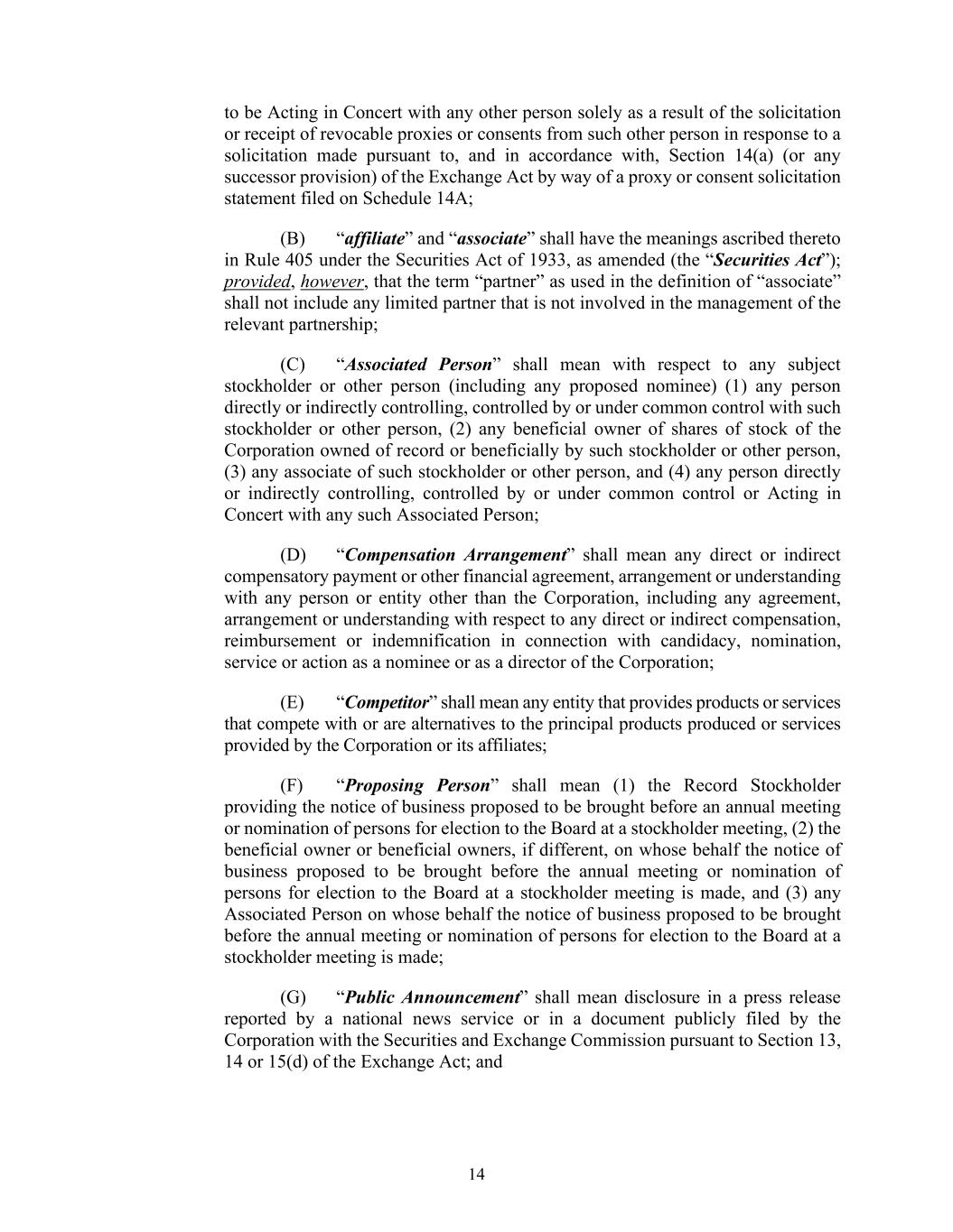 14 to be Acting in Concert with any other person solely as a result of the solicitation or receipt of revocable proxies or consents from such other person in response to a solicitation made pursuant to, and in accordance with, Section 14(a) (or any successor provision) of the Exchange Act by way of a proxy or consent solicitation statement filed on Schedule 14A; (B) “affiliate” and “associate” shall have the meanings ascribed thereto in Rule 405 under the Securities Act of 1933, as amended (the “Securities Act”); provided, however, that the term “partner” as used in the definition of “associate” shall not include any limited partner that is not involved in the management of the relevant partnership; (C) “Associated Person” shall mean with respect to any subject stockholder or other person (including any proposed nominee) (1) any person directly or indirectly controlling, controlled by or under common control with such stockholder or other person, (2) any beneficial owner of shares of stock of the Corporation owned of record or beneficially by such stockholder or other person, (3) any associate of such stockholder or other person, and (4) any person directly or indirectly controlling, controlled by or under common control or Acting in Concert with any such Associated Person; (D) “Compensation Arrangement” shall mean any direct or indirect compensatory payment or other financial agreement, arrangement or understanding with any person or entity other than the Corporation, including any agreement, arrangement or understanding with respect to any direct or indirect compensation, reimbursement or indemnification in connection with candidacy, nomination, service or action as a nominee or as a director of the Corporation; (E) “Competitor” shall mean any entity that provides products or services that compete with or are alternatives to the principal products produced or services provided by the Corporation or its affiliates; (F) “Proposing Person” shall mean (1) the Record Stockholder providing the notice of business proposed to be brought before an annual meeting or nomination of persons for election to the Board at a stockholder meeting, (2) the beneficial owner or beneficial owners, if different, on whose behalf the notice of business proposed to be brought before the annual meeting or nomination of persons for election to the Board at a stockholder meeting is made, and (3) any Associated Person on whose behalf the notice of business proposed to be brought before the annual meeting or nomination of persons for election to the Board at a stockholder meeting is made; (G) “Public Announcement” shall mean disclosure in a press release reported by a national news service or in a document publicly filed by the Corporation with the Securities and Exchange Commission pursuant to Section 13, 14 or 15(d) of the Exchange Act; and