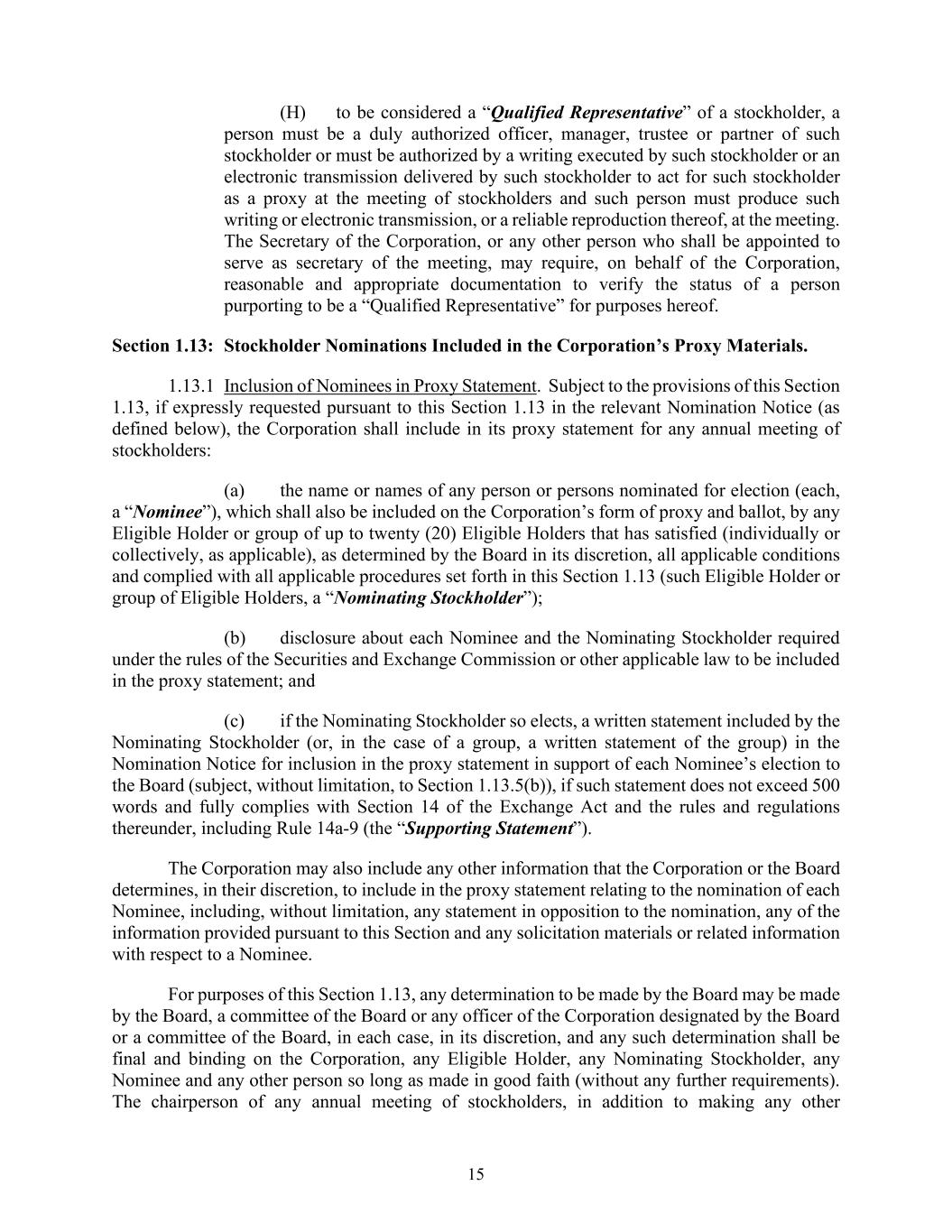 15 (H) to be considered a “Qualified Representative” of a stockholder, a person must be a duly authorized officer, manager, trustee or partner of such stockholder or must be authorized by a writing executed by such stockholder or an electronic transmission delivered by such stockholder to act for such stockholder as a proxy at the meeting of stockholders and such person must produce such writing or electronic transmission, or a reliable reproduction thereof, at the meeting. The Secretary of the Corporation, or any other person who shall be appointed to serve as secretary of the meeting, may require, on behalf of the Corporation, reasonable and appropriate documentation to verify the status of a person purporting to be a “Qualified Representative” for purposes hereof. Section 1.13: Stockholder Nominations Included in the Corporation’s Proxy Materials. 1.13.1 Inclusion of Nominees in Proxy Statement. Subject to the provisions of this Section 1.13, if expressly requested pursuant to this Section 1.13 in the relevant Nomination Notice (as defined below), the Corporation shall include in its proxy statement for any annual meeting of stockholders: (a) the name or names of any person or persons nominated for election (each, a “Nominee”), which shall also be included on the Corporation’s form of proxy and ballot, by any Eligible Holder or group of up to twenty (20) Eligible Holders that has satisfied (individually or collectively, as applicable), as determined by the Board in its discretion, all applicable conditions and complied with all applicable procedures set forth in this Section 1.13 (such Eligible Holder or group of Eligible Holders, a “Nominating Stockholder”); (b) disclosure about each Nominee and the Nominating Stockholder required under the rules of the Securities and Exchange Commission or other applicable law to be included in the proxy statement; and (c) if the Nominating Stockholder so elects, a written statement included by the Nominating Stockholder (or, in the case of a group, a written statement of the group) in the Nomination Notice for inclusion in the proxy statement in support of each Nominee’s election to the Board (subject, without limitation, to Section 1.13.5(b)), if such statement does not exceed 500 words and fully complies with Section 14 of the Exchange Act and the rules and regulations thereunder, including Rule 14a-9 (the “Supporting Statement”). The Corporation may also include any other information that the Corporation or the Board determines, in their discretion, to include in the proxy statement relating to the nomination of each Nominee, including, without limitation, any statement in opposition to the nomination, any of the information provided pursuant to this Section and any solicitation materials or related information with respect to a Nominee. For purposes of this Section 1.13, any determination to be made by the Board may be made by the Board, a committee of the Board or any officer of the Corporation designated by the Board or a committee of the Board, in each case, in its discretion, and any such determination shall be final and binding on the Corporation, any Eligible Holder, any Nominating Stockholder, any Nominee and any other person so long as made in good faith (without any further requirements). The chairperson of any annual meeting of stockholders, in addition to making any other