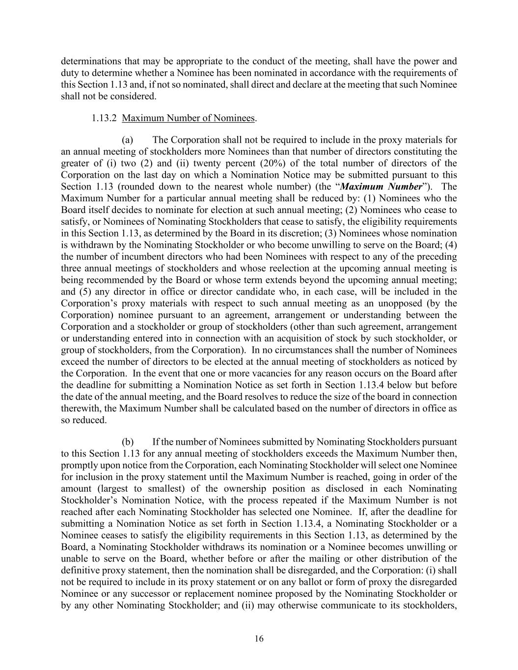 16 determinations that may be appropriate to the conduct of the meeting, shall have the power and duty to determine whether a Nominee has been nominated in accordance with the requirements of this Section 1.13 and, if not so nominated, shall direct and declare at the meeting that such Nominee shall not be considered. 1.13.2 Maximum Number of Nominees. (a) The Corporation shall not be required to include in the proxy materials for an annual meeting of stockholders more Nominees than that number of directors constituting the greater of (i) two (2) and (ii) twenty percent (20%) of the total number of directors of the Corporation on the last day on which a Nomination Notice may be submitted pursuant to this Section 1.13 (rounded down to the nearest whole number) (the “Maximum Number”). The Maximum Number for a particular annual meeting shall be reduced by: (1) Nominees who the Board itself decides to nominate for election at such annual meeting; (2) Nominees who cease to satisfy, or Nominees of Nominating Stockholders that cease to satisfy, the eligibility requirements in this Section 1.13, as determined by the Board in its discretion; (3) Nominees whose nomination is withdrawn by the Nominating Stockholder or who become unwilling to serve on the Board; (4) the number of incumbent directors who had been Nominees with respect to any of the preceding three annual meetings of stockholders and whose reelection at the upcoming annual meeting is being recommended by the Board or whose term extends beyond the upcoming annual meeting; and (5) any director in office or director candidate who, in each case, will be included in the Corporation’s proxy materials with respect to such annual meeting as an unopposed (by the Corporation) nominee pursuant to an agreement, arrangement or understanding between the Corporation and a stockholder or group of stockholders (other than such agreement, arrangement or understanding entered into in connection with an acquisition of stock by such stockholder, or group of stockholders, from the Corporation). In no circumstances shall the number of Nominees exceed the number of directors to be elected at the annual meeting of stockholders as noticed by the Corporation. In the event that one or more vacancies for any reason occurs on the Board after the deadline for submitting a Nomination Notice as set forth in Section 1.13.4 below but before the date of the annual meeting, and the Board resolves to reduce the size of the board in connection therewith, the Maximum Number shall be calculated based on the number of directors in office as so reduced. (b) If the number of Nominees submitted by Nominating Stockholders pursuant to this Section 1.13 for any annual meeting of stockholders exceeds the Maximum Number then, promptly upon notice from the Corporation, each Nominating Stockholder will select one Nominee for inclusion in the proxy statement until the Maximum Number is reached, going in order of the amount (largest to smallest) of the ownership position as disclosed in each Nominating Stockholder’s Nomination Notice, with the process repeated if the Maximum Number is not reached after each Nominating Stockholder has selected one Nominee. If, after the deadline for submitting a Nomination Notice as set forth in Section 1.13.4, a Nominating Stockholder or a Nominee ceases to satisfy the eligibility requirements in this Section 1.13, as determined by the Board, a Nominating Stockholder withdraws its nomination or a Nominee becomes unwilling or unable to serve on the Board, whether before or after the mailing or other distribution of the definitive proxy statement, then the nomination shall be disregarded, and the Corporation: (i) shall not be required to include in its proxy statement or on any ballot or form of proxy the disregarded Nominee or any successor or replacement nominee proposed by the Nominating Stockholder or by any other Nominating Stockholder; and (ii) may otherwise communicate to its stockholders,