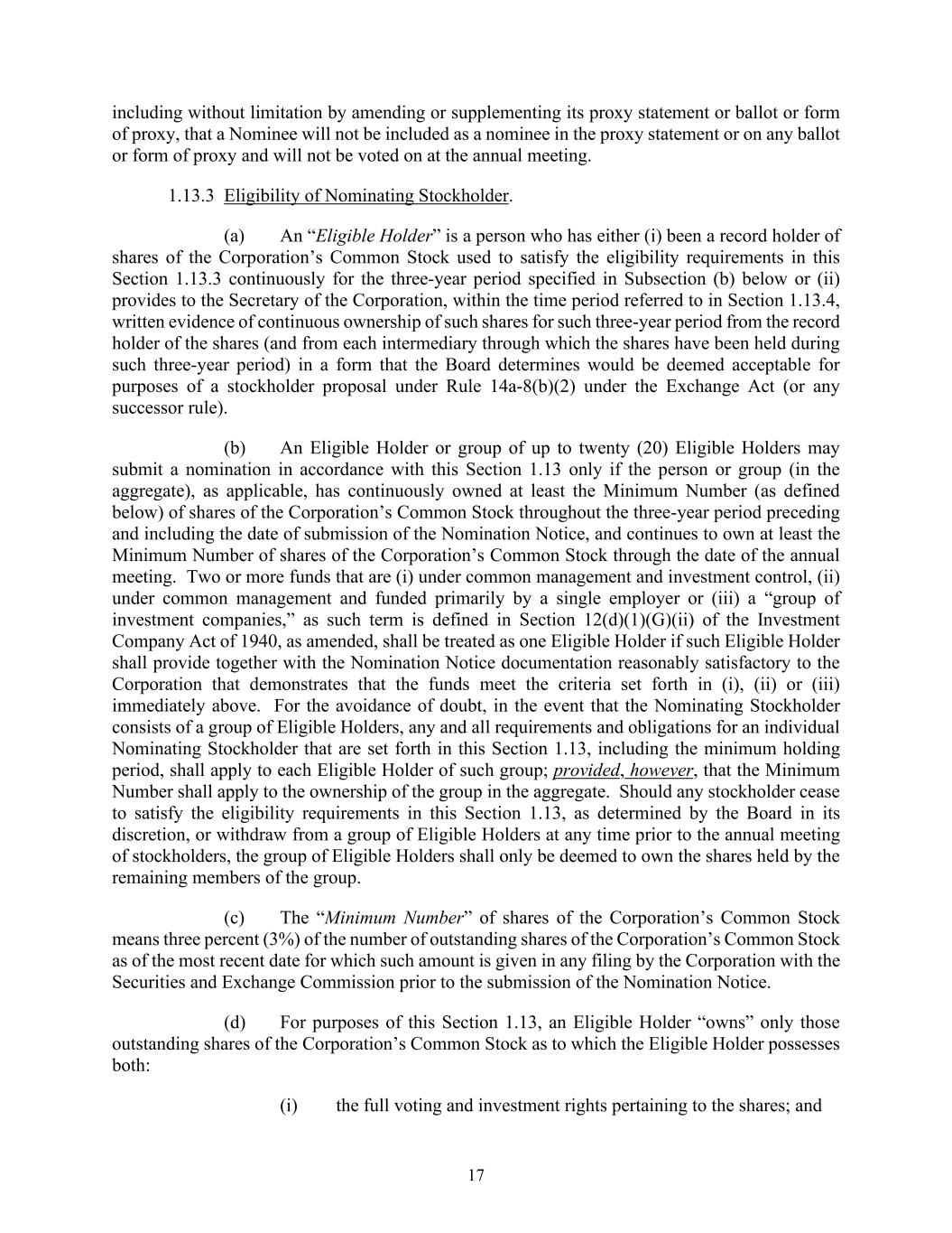 17 including without limitation by amending or supplementing its proxy statement or ballot or form of proxy, that a Nominee will not be included as a nominee in the proxy statement or on any ballot or form of proxy and will not be voted on at the annual meeting. 1.13.3 Eligibility of Nominating Stockholder. (a) An “Eligible Holder” is a person who has either (i) been a record holder of shares of the Corporation’s Common Stock used to satisfy the eligibility requirements in this Section 1.13.3 continuously for the three-year period specified in Subsection (b) below or (ii) provides to the Secretary of the Corporation, within the time period referred to in Section 1.13.4, written evidence of continuous ownership of such shares for such three-year period from the record holder of the shares (and from each intermediary through which the shares have been held during such three-year period) in a form that the Board determines would be deemed acceptable for purposes of a stockholder proposal under Rule 14a-8(b)(2) under the Exchange Act (or any successor rule). (b) An Eligible Holder or group of up to twenty (20) Eligible Holders may submit a nomination in accordance with this Section 1.13 only if the person or group (in the aggregate), as applicable, has continuously owned at least the Minimum Number (as defined below) of shares of the Corporation’s Common Stock throughout the three-year period preceding and including the date of submission of the Nomination Notice, and continues to own at least the Minimum Number of shares of the Corporation’s Common Stock through the date of the annual meeting. Two or more funds that are (i) under common management and investment control, (ii) under common management and funded primarily by a single employer or (iii) a “group of investment companies,” as such term is defined in Section 12(d)(1)(G)(ii) of the Investment Company Act of 1940, as amended, shall be treated as one Eligible Holder if such Eligible Holder shall provide together with the Nomination Notice documentation reasonably satisfactory to the Corporation that demonstrates that the funds meet the criteria set forth in (i), (ii) or (iii) immediately above. For the avoidance of doubt, in the event that the Nominating Stockholder consists of a group of Eligible Holders, any and all requirements and obligations for an individual Nominating Stockholder that are set forth in this Section 1.13, including the minimum holding period, shall apply to each Eligible Holder of such group; provided, however, that the Minimum Number shall apply to the ownership of the group in the aggregate. Should any stockholder cease to satisfy the eligibility requirements in this Section 1.13, as determined by the Board in its discretion, or withdraw from a group of Eligible Holders at any time prior to the annual meeting of stockholders, the group of Eligible Holders shall only be deemed to own the shares held by the remaining members of the group. (c) The “Minimum Number” of shares of the Corporation’s Common Stock means three percent (3%) of the number of outstanding shares of the Corporation’s Common Stock as of the most recent date for which such amount is given in any filing by the Corporation with the Securities and Exchange Commission prior to the submission of the Nomination Notice. (d) For purposes of this Section 1.13, an Eligible Holder “owns” only those outstanding shares of the Corporation’s Common Stock as to which the Eligible Holder possesses both: (i) the full voting and investment rights pertaining to the shares; and