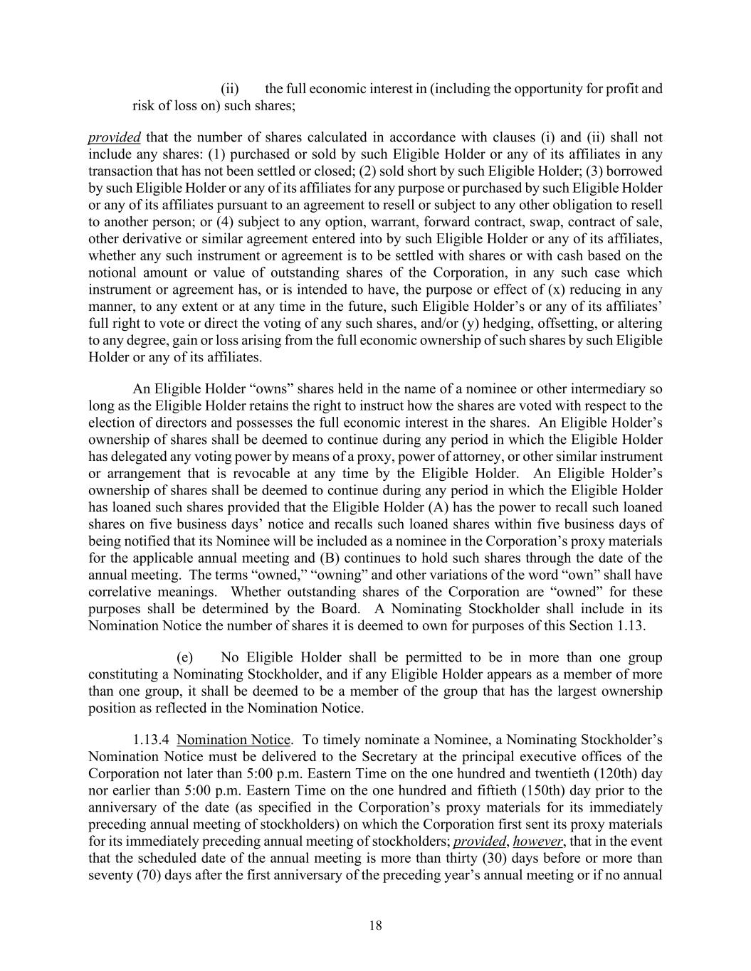 18 (ii) the full economic interest in (including the opportunity for profit and risk of loss on) such shares; provided that the number of shares calculated in accordance with clauses (i) and (ii) shall not include any shares: (1) purchased or sold by such Eligible Holder or any of its affiliates in any transaction that has not been settled or closed; (2) sold short by such Eligible Holder; (3) borrowed by such Eligible Holder or any of its affiliates for any purpose or purchased by such Eligible Holder or any of its affiliates pursuant to an agreement to resell or subject to any other obligation to resell to another person; or (4) subject to any option, warrant, forward contract, swap, contract of sale, other derivative or similar agreement entered into by such Eligible Holder or any of its affiliates, whether any such instrument or agreement is to be settled with shares or with cash based on the notional amount or value of outstanding shares of the Corporation, in any such case which instrument or agreement has, or is intended to have, the purpose or effect of (x) reducing in any manner, to any extent or at any time in the future, such Eligible Holder’s or any of its affiliates’ full right to vote or direct the voting of any such shares, and/or (y) hedging, offsetting, or altering to any degree, gain or loss arising from the full economic ownership of such shares by such Eligible Holder or any of its affiliates. An Eligible Holder “owns” shares held in the name of a nominee or other intermediary so long as the Eligible Holder retains the right to instruct how the shares are voted with respect to the election of directors and possesses the full economic interest in the shares. An Eligible Holder’s ownership of shares shall be deemed to continue during any period in which the Eligible Holder has delegated any voting power by means of a proxy, power of attorney, or other similar instrument or arrangement that is revocable at any time by the Eligible Holder. An Eligible Holder’s ownership of shares shall be deemed to continue during any period in which the Eligible Holder has loaned such shares provided that the Eligible Holder (A) has the power to recall such loaned shares on five business days’ notice and recalls such loaned shares within five business days of being notified that its Nominee will be included as a nominee in the Corporation’s proxy materials for the applicable annual meeting and (B) continues to hold such shares through the date of the annual meeting. The terms “owned,” “owning” and other variations of the word “own” shall have correlative meanings. Whether outstanding shares of the Corporation are “owned” for these purposes shall be determined by the Board. A Nominating Stockholder shall include in its Nomination Notice the number of shares it is deemed to own for purposes of this Section 1.13. (e) No Eligible Holder shall be permitted to be in more than one group constituting a Nominating Stockholder, and if any Eligible Holder appears as a member of more than one group, it shall be deemed to be a member of the group that has the largest ownership position as reflected in the Nomination Notice. 1.13.4 Nomination Notice. To timely nominate a Nominee, a Nominating Stockholder’s Nomination Notice must be delivered to the Secretary at the principal executive offices of the Corporation not later than 5:00 p.m. Eastern Time on the one hundred and twentieth (120th) day nor earlier than 5:00 p.m. Eastern Time on the one hundred and fiftieth (150th) day prior to the anniversary of the date (as specified in the Corporation’s proxy materials for its immediately preceding annual meeting of stockholders) on which the Corporation first sent its proxy materials for its immediately preceding annual meeting of stockholders; provided, however, that in the event that the scheduled date of the annual meeting is more than thirty (30) days before or more than seventy (70) days after the first anniversary of the preceding year’s annual meeting or if no annual