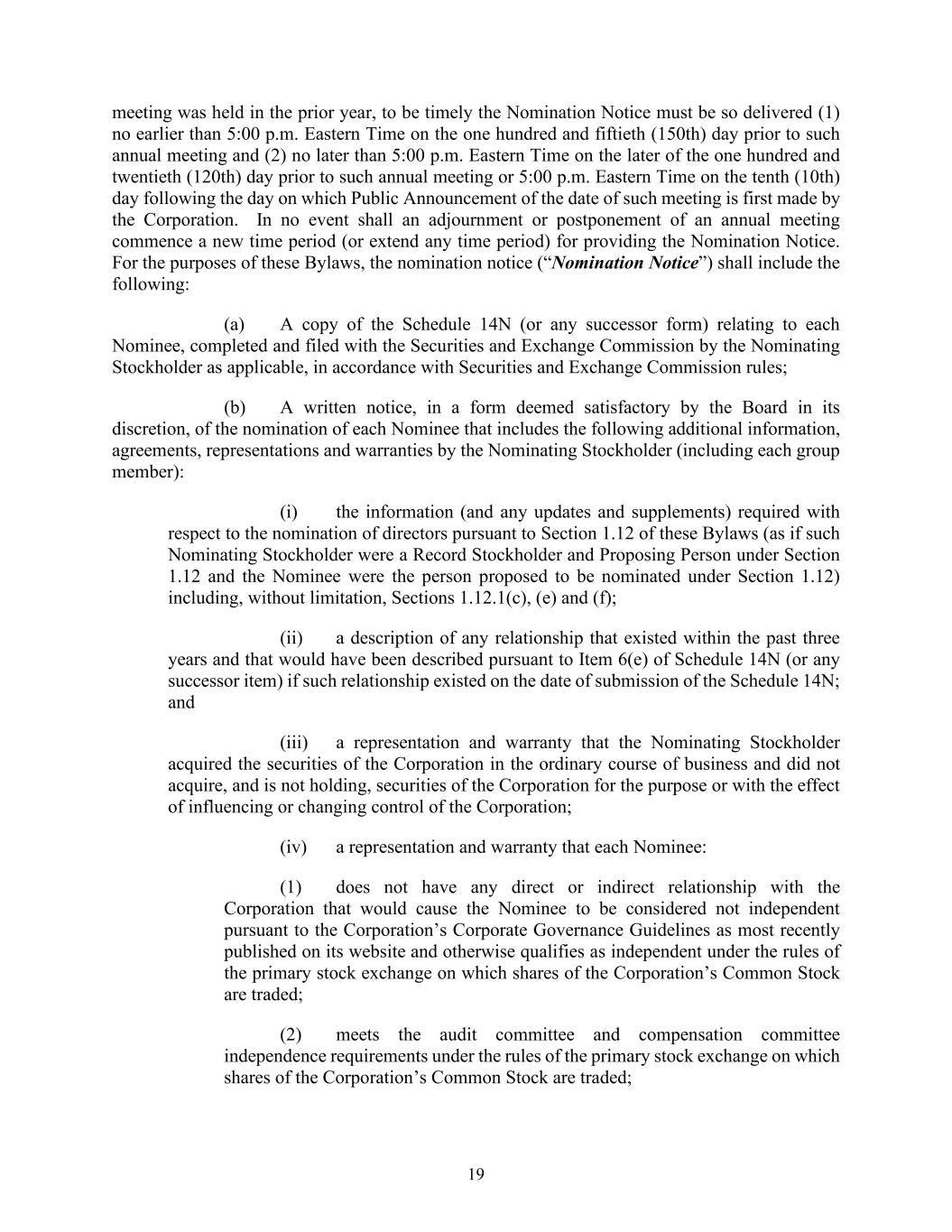 19 meeting was held in the prior year, to be timely the Nomination Notice must be so delivered (1) no earlier than 5:00 p.m. Eastern Time on the one hundred and fiftieth (150th) day prior to such annual meeting and (2) no later than 5:00 p.m. Eastern Time on the later of the one hundred and twentieth (120th) day prior to such annual meeting or 5:00 p.m. Eastern Time on the tenth (10th) day following the day on which Public Announcement of the date of such meeting is first made by the Corporation. In no event shall an adjournment or postponement of an annual meeting commence a new time period (or extend any time period) for providing the Nomination Notice. For the purposes of these Bylaws, the nomination notice (“Nomination Notice”) shall include the following: (a) A copy of the Schedule 14N (or any successor form) relating to each Nominee, completed and filed with the Securities and Exchange Commission by the Nominating Stockholder as applicable, in accordance with Securities and Exchange Commission rules; (b) A written notice, in a form deemed satisfactory by the Board in its discretion, of the nomination of each Nominee that includes the following additional information, agreements, representations and warranties by the Nominating Stockholder (including each group member): (i) the information (and any updates and supplements) required with respect to the nomination of directors pursuant to Section 1.12 of these Bylaws (as if such Nominating Stockholder were a Record Stockholder and Proposing Person under Section 1.12 and the Nominee were the person proposed to be nominated under Section 1.12) including, without limitation, Sections 1.12.1(c), (e) and (f); (ii) a description of any relationship that existed within the past three years and that would have been described pursuant to Item 6(e) of Schedule 14N (or any successor item) if such relationship existed on the date of submission of the Schedule 14N; and (iii) a representation and warranty that the Nominating Stockholder acquired the securities of the Corporation in the ordinary course of business and did not acquire, and is not holding, securities of the Corporation for the purpose or with the effect of influencing or changing control of the Corporation; (iv) a representation and warranty that each Nominee: (1) does not have any direct or indirect relationship with the Corporation that would cause the Nominee to be considered not independent pursuant to the Corporation’s Corporate Governance Guidelines as most recently published on its website and otherwise qualifies as independent under the rules of the primary stock exchange on which shares of the Corporation’s Common Stock are traded; (2) meets the audit committee and compensation committee independence requirements under the rules of the primary stock exchange on which shares of the Corporation’s Common Stock are traded;
