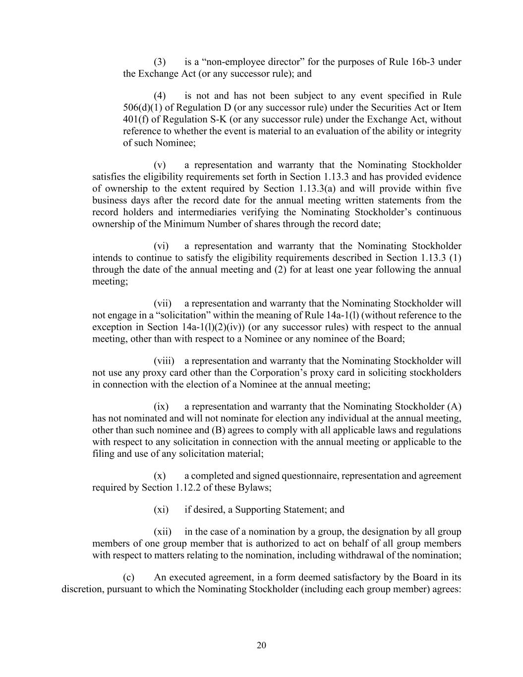 20 (3) is a “non-employee director” for the purposes of Rule 16b-3 under the Exchange Act (or any successor rule); and (4) is not and has not been subject to any event specified in Rule 506(d)(1) of Regulation D (or any successor rule) under the Securities Act or Item 401(f) of Regulation S-K (or any successor rule) under the Exchange Act, without reference to whether the event is material to an evaluation of the ability or integrity of such Nominee; (v) a representation and warranty that the Nominating Stockholder satisfies the eligibility requirements set forth in Section 1.13.3 and has provided evidence of ownership to the extent required by Section 1.13.3(a) and will provide within five business days after the record date for the annual meeting written statements from the record holders and intermediaries verifying the Nominating Stockholder’s continuous ownership of the Minimum Number of shares through the record date; (vi) a representation and warranty that the Nominating Stockholder intends to continue to satisfy the eligibility requirements described in Section 1.13.3 (1) through the date of the annual meeting and (2) for at least one year following the annual meeting; (vii) a representation and warranty that the Nominating Stockholder will not engage in a “solicitation” within the meaning of Rule 14a-1(l) (without reference to the exception in Section 14a-1(l)(2)(iv)) (or any successor rules) with respect to the annual meeting, other than with respect to a Nominee or any nominee of the Board; (viii) a representation and warranty that the Nominating Stockholder will not use any proxy card other than the Corporation’s proxy card in soliciting stockholders in connection with the election of a Nominee at the annual meeting; (ix) a representation and warranty that the Nominating Stockholder (A) has not nominated and will not nominate for election any individual at the annual meeting, other than such nominee and (B) agrees to comply with all applicable laws and regulations with respect to any solicitation in connection with the annual meeting or applicable to the filing and use of any solicitation material; (x) a completed and signed questionnaire, representation and agreement required by Section 1.12.2 of these Bylaws; (xi) if desired, a Supporting Statement; and (xii) in the case of a nomination by a group, the designation by all group members of one group member that is authorized to act on behalf of all group members with respect to matters relating to the nomination, including withdrawal of the nomination; (c) An executed agreement, in a form deemed satisfactory by the Board in its discretion, pursuant to which the Nominating Stockholder (including each group member) agrees: