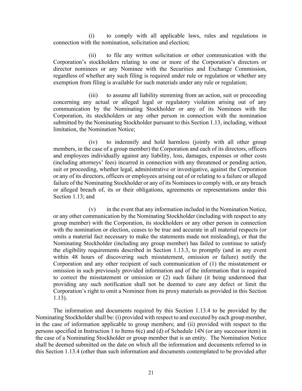 21 (i) to comply with all applicable laws, rules and regulations in connection with the nomination, solicitation and election; (ii) to file any written solicitation or other communication with the Corporation’s stockholders relating to one or more of the Corporation’s directors or director nominees or any Nominee with the Securities and Exchange Commission, regardless of whether any such filing is required under rule or regulation or whether any exemption from filing is available for such materials under any rule or regulation; (iii) to assume all liability stemming from an action, suit or proceeding concerning any actual or alleged legal or regulatory violation arising out of any communication by the Nominating Stockholder or any of its Nominees with the Corporation, its stockholders or any other person in connection with the nomination submitted by the Nominating Stockholder pursuant to this Section 1.13, including, without limitation, the Nomination Notice; (iv) to indemnify and hold harmless (jointly with all other group members, in the case of a group member) the Corporation and each of its directors, officers and employees individually against any liability, loss, damages, expenses or other costs (including attorneys’ fees) incurred in connection with any threatened or pending action, suit or proceeding, whether legal, administrative or investigative, against the Corporation or any of its directors, officers or employees arising out of or relating to a failure or alleged failure of the Nominating Stockholder or any of its Nominees to comply with, or any breach or alleged breach of, its or their obligations, agreements or representations under this Section 1.13; and (v) in the event that any information included in the Nomination Notice, or any other communication by the Nominating Stockholder (including with respect to any group member) with the Corporation, its stockholders or any other person in connection with the nomination or election, ceases to be true and accurate in all material respects (or omits a material fact necessary to make the statements made not misleading), or that the Nominating Stockholder (including any group member) has failed to continue to satisfy the eligibility requirements described in Section 1.13.3, to promptly (and in any event within 48 hours of discovering such misstatement, omission or failure) notify the Corporation and any other recipient of such communication of (1) the misstatement or omission in such previously provided information and of the information that is required to correct the misstatement or omission or (2) such failure (it being understood that providing any such notification shall not be deemed to cure any defect or limit the Corporation’s right to omit a Nominee from its proxy materials as provided in this Section 1.13). The information and documents required by this Section 1.13.4 to be provided by the Nominating Stockholder shall be: (i) provided with respect to and executed by each group member, in the case of information applicable to group members; and (ii) provided with respect to the persons specified in Instruction 1 to Items 6(c) and (d) of Schedule 14N (or any successor item) in the case of a Nominating Stockholder or group member that is an entity. The Nomination Notice shall be deemed submitted on the date on which all the information and documents referred to in this Section 1.13.4 (other than such information and documents contemplated to be provided after
