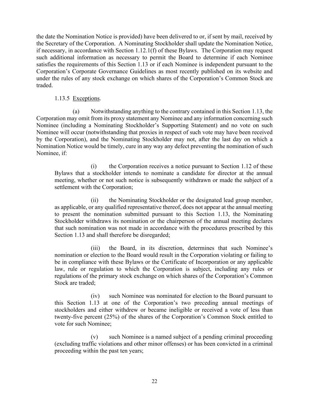 22 the date the Nomination Notice is provided) have been delivered to or, if sent by mail, received by the Secretary of the Corporation. A Nominating Stockholder shall update the Nomination Notice, if necessary, in accordance with Section 1.12.1(f) of these Bylaws. The Corporation may request such additional information as necessary to permit the Board to determine if each Nominee satisfies the requirements of this Section 1.13 or if each Nominee is independent pursuant to the Corporation’s Corporate Governance Guidelines as most recently published on its website and under the rules of any stock exchange on which shares of the Corporation’s Common Stock are traded. 1.13.5 Exceptions. (a) Notwithstanding anything to the contrary contained in this Section 1.13, the Corporation may omit from its proxy statement any Nominee and any information concerning such Nominee (including a Nominating Stockholder’s Supporting Statement) and no vote on such Nominee will occur (notwithstanding that proxies in respect of such vote may have been received by the Corporation), and the Nominating Stockholder may not, after the last day on which a Nomination Notice would be timely, cure in any way any defect preventing the nomination of such Nominee, if: (i) the Corporation receives a notice pursuant to Section 1.12 of these Bylaws that a stockholder intends to nominate a candidate for director at the annual meeting, whether or not such notice is subsequently withdrawn or made the subject of a settlement with the Corporation; (ii) the Nominating Stockholder or the designated lead group member, as applicable, or any qualified representative thereof, does not appear at the annual meeting to present the nomination submitted pursuant to this Section 1.13, the Nominating Stockholder withdraws its nomination or the chairperson of the annual meeting declares that such nomination was not made in accordance with the procedures prescribed by this Section 1.13 and shall therefore be disregarded; (iii) the Board, in its discretion, determines that such Nominee’s nomination or election to the Board would result in the Corporation violating or failing to be in compliance with these Bylaws or the Certificate of Incorporation or any applicable law, rule or regulation to which the Corporation is subject, including any rules or regulations of the primary stock exchange on which shares of the Corporation’s Common Stock are traded; (iv) such Nominee was nominated for election to the Board pursuant to this Section 1.13 at one of the Corporation’s two preceding annual meetings of stockholders and either withdrew or became ineligible or received a vote of less than twenty-five percent (25%) of the shares of the Corporation’s Common Stock entitled to vote for such Nominee; (v) such Nominee is a named subject of a pending criminal proceeding (excluding traffic violations and other minor offenses) or has been convicted in a criminal proceeding within the past ten years;