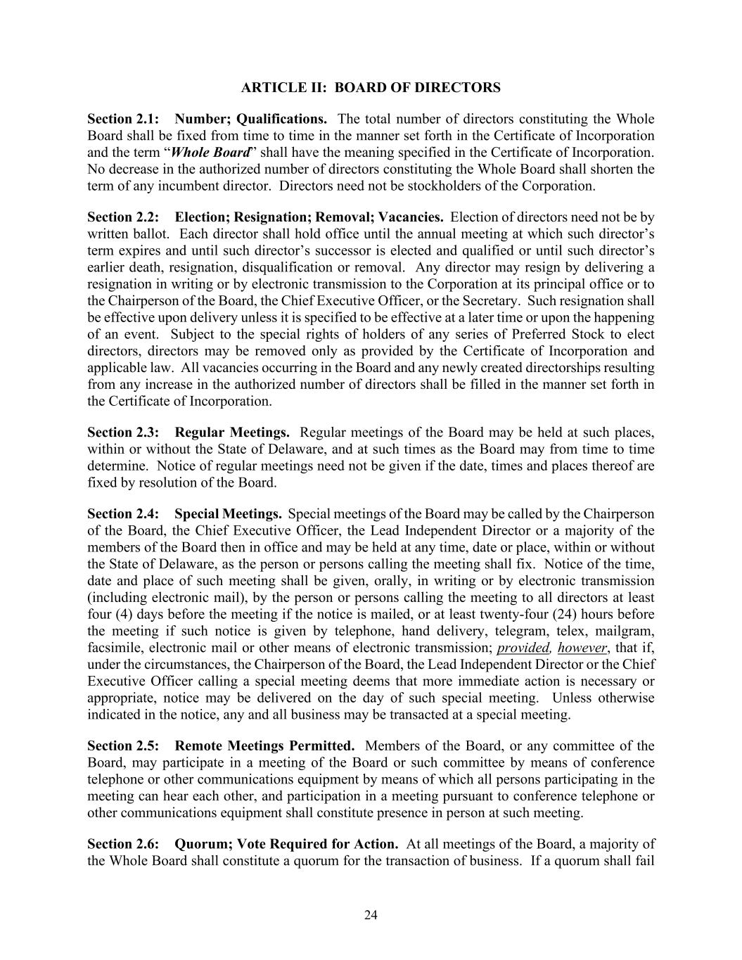 24 ARTICLE II: BOARD OF DIRECTORS Section 2.1: Number; Qualifications. The total number of directors constituting the Whole Board shall be fixed from time to time in the manner set forth in the Certificate of Incorporation and the term “Whole Board” shall have the meaning specified in the Certificate of Incorporation. No decrease in the authorized number of directors constituting the Whole Board shall shorten the term of any incumbent director. Directors need not be stockholders of the Corporation. Section 2.2: Election; Resignation; Removal; Vacancies. Election of directors need not be by written ballot. Each director shall hold office until the annual meeting at which such director’s term expires and until such director’s successor is elected and qualified or until such director’s earlier death, resignation, disqualification or removal. Any director may resign by delivering a resignation in writing or by electronic transmission to the Corporation at its principal office or to the Chairperson of the Board, the Chief Executive Officer, or the Secretary. Such resignation shall be effective upon delivery unless it is specified to be effective at a later time or upon the happening of an event. Subject to the special rights of holders of any series of Preferred Stock to elect directors, directors may be removed only as provided by the Certificate of Incorporation and applicable law. All vacancies occurring in the Board and any newly created directorships resulting from any increase in the authorized number of directors shall be filled in the manner set forth in the Certificate of Incorporation. Section 2.3: Regular Meetings. Regular meetings of the Board may be held at such places, within or without the State of Delaware, and at such times as the Board may from time to time determine. Notice of regular meetings need not be given if the date, times and places thereof are fixed by resolution of the Board. Section 2.4: Special Meetings. Special meetings of the Board may be called by the Chairperson of the Board, the Chief Executive Officer, the Lead Independent Director or a majority of the members of the Board then in office and may be held at any time, date or place, within or without the State of Delaware, as the person or persons calling the meeting shall fix. Notice of the time, date and place of such meeting shall be given, orally, in writing or by electronic transmission (including electronic mail), by the person or persons calling the meeting to all directors at least four (4) days before the meeting if the notice is mailed, or at least twenty-four (24) hours before the meeting if such notice is given by telephone, hand delivery, telegram, telex, mailgram, facsimile, electronic mail or other means of electronic transmission; provided, however, that if, under the circumstances, the Chairperson of the Board, the Lead Independent Director or the Chief Executive Officer calling a special meeting deems that more immediate action is necessary or appropriate, notice may be delivered on the day of such special meeting. Unless otherwise indicated in the notice, any and all business may be transacted at a special meeting. Section 2.5: Remote Meetings Permitted. Members of the Board, or any committee of the Board, may participate in a meeting of the Board or such committee by means of conference telephone or other communications equipment by means of which all persons participating in the meeting can hear each other, and participation in a meeting pursuant to conference telephone or other communications equipment shall constitute presence in person at such meeting. Section 2.6: Quorum; Vote Required for Action. At all meetings of the Board, a majority of the Whole Board shall constitute a quorum for the transaction of business. If a quorum shall fail