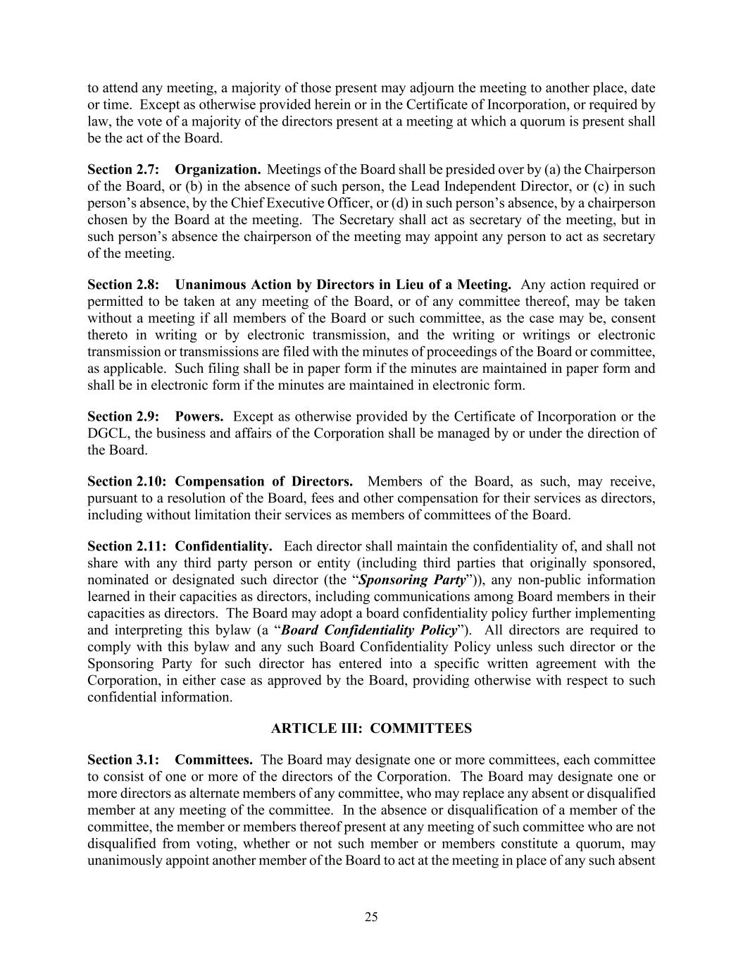25 to attend any meeting, a majority of those present may adjourn the meeting to another place, date or time. Except as otherwise provided herein or in the Certificate of Incorporation, or required by law, the vote of a majority of the directors present at a meeting at which a quorum is present shall be the act of the Board. Section 2.7: Organization. Meetings of the Board shall be presided over by (a) the Chairperson of the Board, or (b) in the absence of such person, the Lead Independent Director, or (c) in such person’s absence, by the Chief Executive Officer, or (d) in such person’s absence, by a chairperson chosen by the Board at the meeting. The Secretary shall act as secretary of the meeting, but in such person’s absence the chairperson of the meeting may appoint any person to act as secretary of the meeting. Section 2.8: Unanimous Action by Directors in Lieu of a Meeting. Any action required or permitted to be taken at any meeting of the Board, or of any committee thereof, may be taken without a meeting if all members of the Board or such committee, as the case may be, consent thereto in writing or by electronic transmission, and the writing or writings or electronic transmission or transmissions are filed with the minutes of proceedings of the Board or committee, as applicable. Such filing shall be in paper form if the minutes are maintained in paper form and shall be in electronic form if the minutes are maintained in electronic form. Section 2.9: Powers. Except as otherwise provided by the Certificate of Incorporation or the DGCL, the business and affairs of the Corporation shall be managed by or under the direction of the Board. Section 2.10: Compensation of Directors. Members of the Board, as such, may receive, pursuant to a resolution of the Board, fees and other compensation for their services as directors, including without limitation their services as members of committees of the Board. Section 2.11: Confidentiality. Each director shall maintain the confidentiality of, and shall not share with any third party person or entity (including third parties that originally sponsored, nominated or designated such director (the “Sponsoring Party”)), any non-public information learned in their capacities as directors, including communications among Board members in their capacities as directors. The Board may adopt a board confidentiality policy further implementing and interpreting this bylaw (a “Board Confidentiality Policy”). All directors are required to comply with this bylaw and any such Board Confidentiality Policy unless such director or the Sponsoring Party for such director has entered into a specific written agreement with the Corporation, in either case as approved by the Board, providing otherwise with respect to such confidential information. ARTICLE III: COMMITTEES Section 3.1: Committees. The Board may designate one or more committees, each committee to consist of one or more of the directors of the Corporation. The Board may designate one or more directors as alternate members of any committee, who may replace any absent or disqualified member at any meeting of the committee. In the absence or disqualification of a member of the committee, the member or members thereof present at any meeting of such committee who are not disqualified from voting, whether or not such member or members constitute a quorum, may unanimously appoint another member of the Board to act at the meeting in place of any such absent