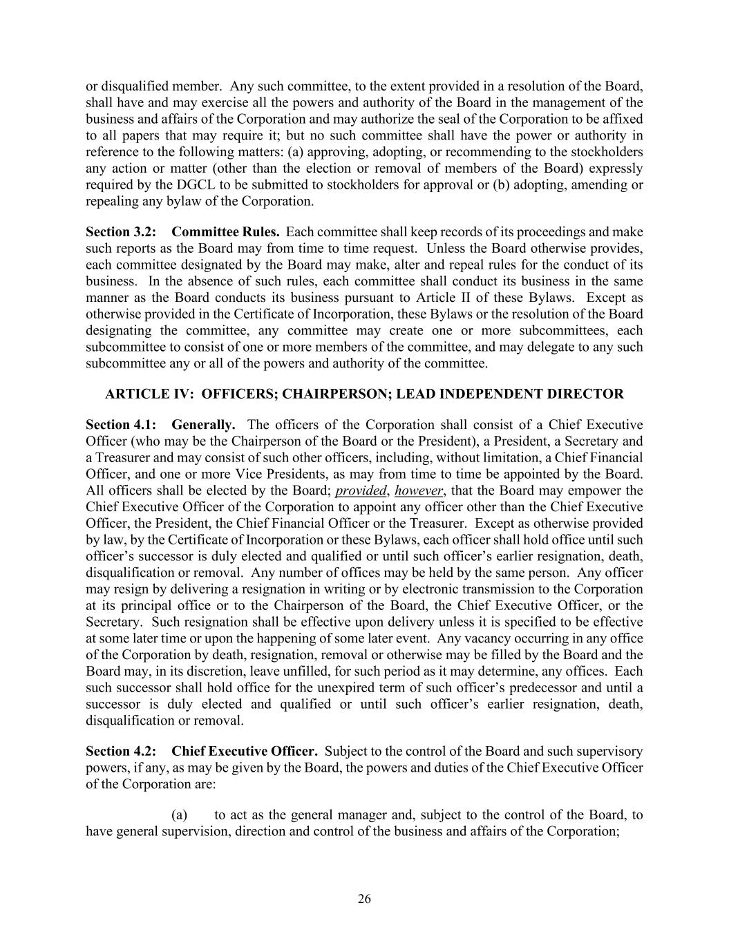 26 or disqualified member. Any such committee, to the extent provided in a resolution of the Board, shall have and may exercise all the powers and authority of the Board in the management of the business and affairs of the Corporation and may authorize the seal of the Corporation to be affixed to all papers that may require it; but no such committee shall have the power or authority in reference to the following matters: (a) approving, adopting, or recommending to the stockholders any action or matter (other than the election or removal of members of the Board) expressly required by the DGCL to be submitted to stockholders for approval or (b) adopting, amending or repealing any bylaw of the Corporation. Section 3.2: Committee Rules. Each committee shall keep records of its proceedings and make such reports as the Board may from time to time request. Unless the Board otherwise provides, each committee designated by the Board may make, alter and repeal rules for the conduct of its business. In the absence of such rules, each committee shall conduct its business in the same manner as the Board conducts its business pursuant to Article II of these Bylaws. Except as otherwise provided in the Certificate of Incorporation, these Bylaws or the resolution of the Board designating the committee, any committee may create one or more subcommittees, each subcommittee to consist of one or more members of the committee, and may delegate to any such subcommittee any or all of the powers and authority of the committee. ARTICLE IV: OFFICERS; CHAIRPERSON; LEAD INDEPENDENT DIRECTOR Section 4.1: Generally. The officers of the Corporation shall consist of a Chief Executive Officer (who may be the Chairperson of the Board or the President), a President, a Secretary and a Treasurer and may consist of such other officers, including, without limitation, a Chief Financial Officer, and one or more Vice Presidents, as may from time to time be appointed by the Board. All officers shall be elected by the Board; provided, however, that the Board may empower the Chief Executive Officer of the Corporation to appoint any officer other than the Chief Executive Officer, the President, the Chief Financial Officer or the Treasurer. Except as otherwise provided by law, by the Certificate of Incorporation or these Bylaws, each officer shall hold office until such officer’s successor is duly elected and qualified or until such officer’s earlier resignation, death, disqualification or removal. Any number of offices may be held by the same person. Any officer may resign by delivering a resignation in writing or by electronic transmission to the Corporation at its principal office or to the Chairperson of the Board, the Chief Executive Officer, or the Secretary. Such resignation shall be effective upon delivery unless it is specified to be effective at some later time or upon the happening of some later event. Any vacancy occurring in any office of the Corporation by death, resignation, removal or otherwise may be filled by the Board and the Board may, in its discretion, leave unfilled, for such period as it may determine, any offices. Each such successor shall hold office for the unexpired term of such officer’s predecessor and until a successor is duly elected and qualified or until such officer’s earlier resignation, death, disqualification or removal. Section 4.2: Chief Executive Officer. Subject to the control of the Board and such supervisory powers, if any, as may be given by the Board, the powers and duties of the Chief Executive Officer of the Corporation are: (a) to act as the general manager and, subject to the control of the Board, to have general supervision, direction and control of the business and affairs of the Corporation;