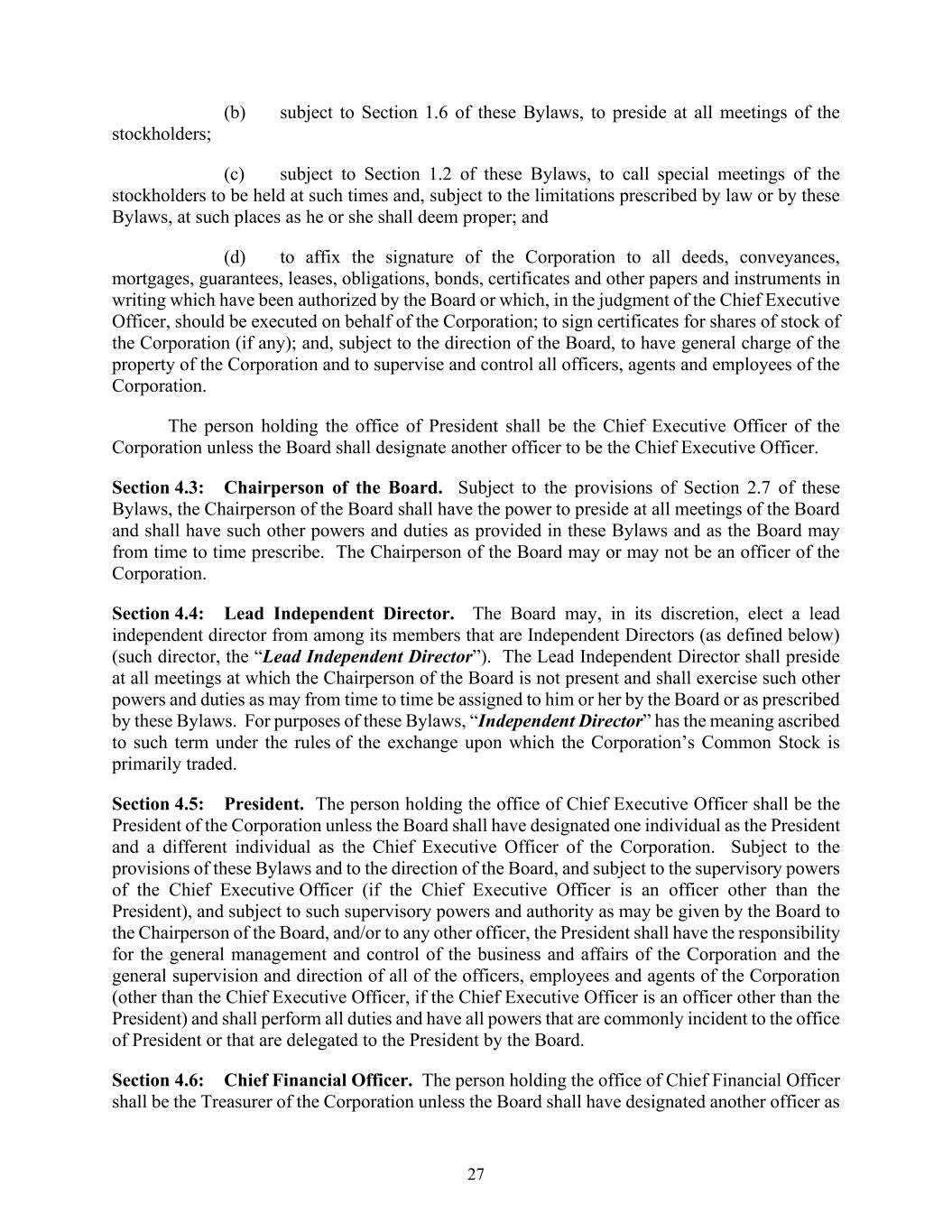 27 (b) subject to Section 1.6 of these Bylaws, to preside at all meetings of the stockholders; (c) subject to Section 1.2 of these Bylaws, to call special meetings of the stockholders to be held at such times and, subject to the limitations prescribed by law or by these Bylaws, at such places as he or she shall deem proper; and (d) to affix the signature of the Corporation to all deeds, conveyances, mortgages, guarantees, leases, obligations, bonds, certificates and other papers and instruments in writing which have been authorized by the Board or which, in the judgment of the Chief Executive Officer, should be executed on behalf of the Corporation; to sign certificates for shares of stock of the Corporation (if any); and, subject to the direction of the Board, to have general charge of the property of the Corporation and to supervise and control all officers, agents and employees of the Corporation. The person holding the office of President shall be the Chief Executive Officer of the Corporation unless the Board shall designate another officer to be the Chief Executive Officer. Section 4.3: Chairperson of the Board. Subject to the provisions of Section 2.7 of these Bylaws, the Chairperson of the Board shall have the power to preside at all meetings of the Board and shall have such other powers and duties as provided in these Bylaws and as the Board may from time to time prescribe. The Chairperson of the Board may or may not be an officer of the Corporation. Section 4.4: Lead Independent Director. The Board may, in its discretion, elect a lead independent director from among its members that are Independent Directors (as defined below) (such director, the “Lead Independent Director”). The Lead Independent Director shall preside at all meetings at which the Chairperson of the Board is not present and shall exercise such other powers and duties as may from time to time be assigned to him or her by the Board or as prescribed by these Bylaws. For purposes of these Bylaws, “Independent Director” has the meaning ascribed to such term under the rules of the exchange upon which the Corporation’s Common Stock is primarily traded. Section 4.5: President. The person holding the office of Chief Executive Officer shall be the President of the Corporation unless the Board shall have designated one individual as the President and a different individual as the Chief Executive Officer of the Corporation. Subject to the provisions of these Bylaws and to the direction of the Board, and subject to the supervisory powers of the Chief Executive Officer (if the Chief Executive Officer is an officer other than the President), and subject to such supervisory powers and authority as may be given by the Board to the Chairperson of the Board, and/or to any other officer, the President shall have the responsibility for the general management and control of the business and affairs of the Corporation and the general supervision and direction of all of the officers, employees and agents of the Corporation (other than the Chief Executive Officer, if the Chief Executive Officer is an officer other than the President) and shall perform all duties and have all powers that are commonly incident to the office of President or that are delegated to the President by the Board. Section 4.6: Chief Financial Officer. The person holding the office of Chief Financial Officer shall be the Treasurer of the Corporation unless the Board shall have designated another officer as