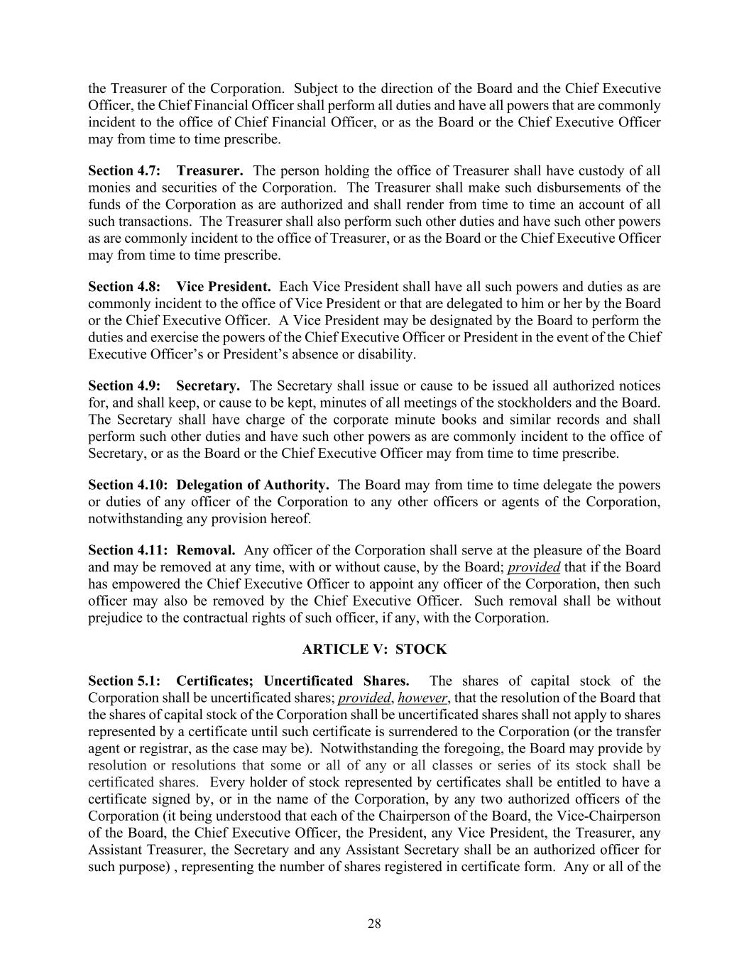 28 the Treasurer of the Corporation. Subject to the direction of the Board and the Chief Executive Officer, the Chief Financial Officer shall perform all duties and have all powers that are commonly incident to the office of Chief Financial Officer, or as the Board or the Chief Executive Officer may from time to time prescribe. Section 4.7: Treasurer. The person holding the office of Treasurer shall have custody of all monies and securities of the Corporation. The Treasurer shall make such disbursements of the funds of the Corporation as are authorized and shall render from time to time an account of all such transactions. The Treasurer shall also perform such other duties and have such other powers as are commonly incident to the office of Treasurer, or as the Board or the Chief Executive Officer may from time to time prescribe. Section 4.8: Vice President. Each Vice President shall have all such powers and duties as are commonly incident to the office of Vice President or that are delegated to him or her by the Board or the Chief Executive Officer. A Vice President may be designated by the Board to perform the duties and exercise the powers of the Chief Executive Officer or President in the event of the Chief Executive Officer’s or President’s absence or disability. Section 4.9: Secretary. The Secretary shall issue or cause to be issued all authorized notices for, and shall keep, or cause to be kept, minutes of all meetings of the stockholders and the Board. The Secretary shall have charge of the corporate minute books and similar records and shall perform such other duties and have such other powers as are commonly incident to the office of Secretary, or as the Board or the Chief Executive Officer may from time to time prescribe. Section 4.10: Delegation of Authority. The Board may from time to time delegate the powers or duties of any officer of the Corporation to any other officers or agents of the Corporation, notwithstanding any provision hereof. Section 4.11: Removal. Any officer of the Corporation shall serve at the pleasure of the Board and may be removed at any time, with or without cause, by the Board; provided that if the Board has empowered the Chief Executive Officer to appoint any officer of the Corporation, then such officer may also be removed by the Chief Executive Officer. Such removal shall be without prejudice to the contractual rights of such officer, if any, with the Corporation. ARTICLE V: STOCK Section 5.1: Certificates; Uncertificated Shares. The shares of capital stock of the Corporation shall be uncertificated shares; provided, however, that the resolution of the Board that the shares of capital stock of the Corporation shall be uncertificated shares shall not apply to shares represented by a certificate until such certificate is surrendered to the Corporation (or the transfer agent or registrar, as the case may be). Notwithstanding the foregoing, the Board may provide by resolution or resolutions that some or all of any or all classes or series of its stock shall be certificated shares. Every holder of stock represented by certificates shall be entitled to have a certificate signed by, or in the name of the Corporation, by any two authorized officers of the Corporation (it being understood that each of the Chairperson of the Board, the Vice-Chairperson of the Board, the Chief Executive Officer, the President, any Vice President, the Treasurer, any Assistant Treasurer, the Secretary and any Assistant Secretary shall be an authorized officer for such purpose) , representing the number of shares registered in certificate form. Any or all of the