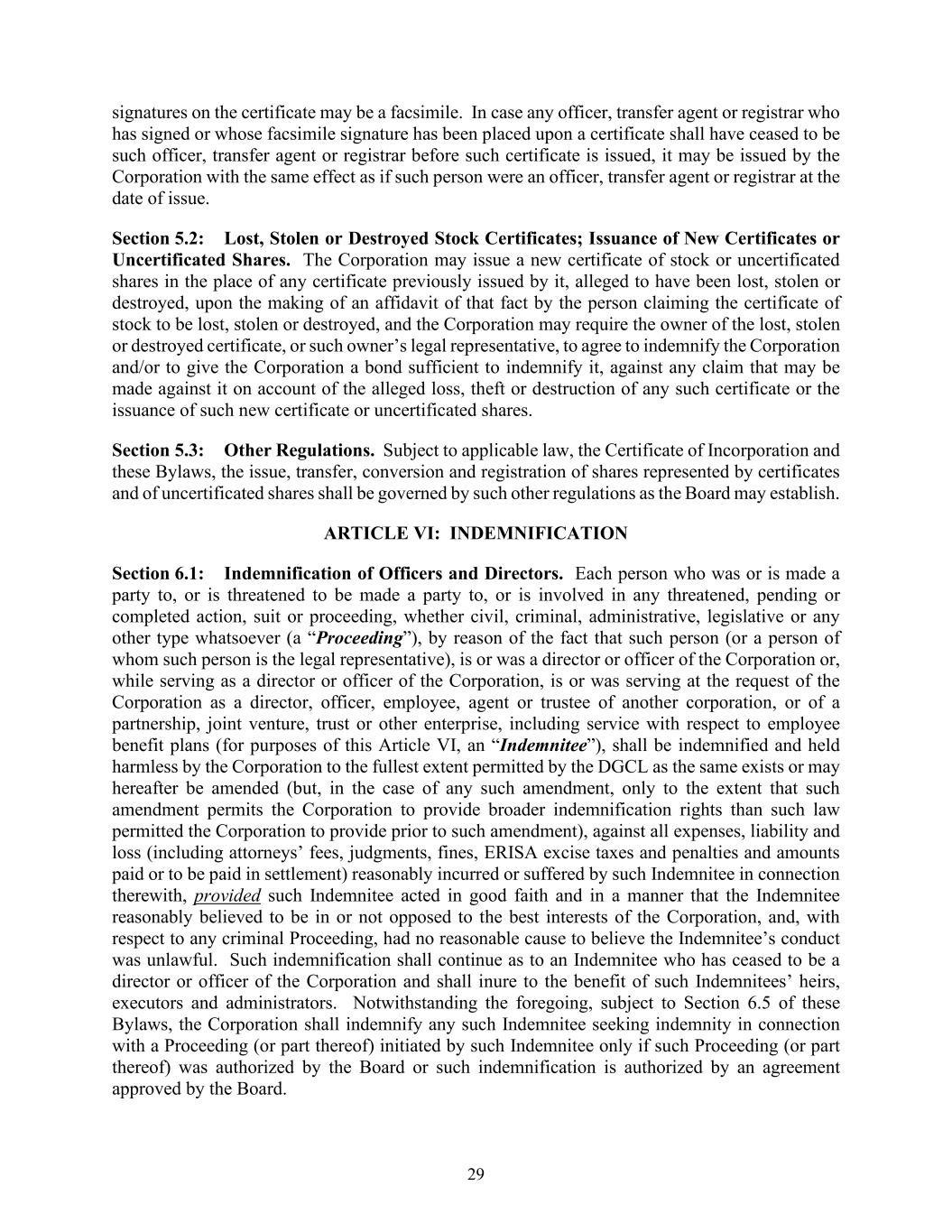 29 signatures on the certificate may be a facsimile. In case any officer, transfer agent or registrar who has signed or whose facsimile signature has been placed upon a certificate shall have ceased to be such officer, transfer agent or registrar before such certificate is issued, it may be issued by the Corporation with the same effect as if such person were an officer, transfer agent or registrar at the date of issue. Section 5.2: Lost, Stolen or Destroyed Stock Certificates; Issuance of New Certificates or Uncertificated Shares. The Corporation may issue a new certificate of stock or uncertificated shares in the place of any certificate previously issued by it, alleged to have been lost, stolen or destroyed, upon the making of an affidavit of that fact by the person claiming the certificate of stock to be lost, stolen or destroyed, and the Corporation may require the owner of the lost, stolen or destroyed certificate, or such owner’s legal representative, to agree to indemnify the Corporation and/or to give the Corporation a bond sufficient to indemnify it, against any claim that may be made against it on account of the alleged loss, theft or destruction of any such certificate or the issuance of such new certificate or uncertificated shares. Section 5.3: Other Regulations. Subject to applicable law, the Certificate of Incorporation and these Bylaws, the issue, transfer, conversion and registration of shares represented by certificates and of uncertificated shares shall be governed by such other regulations as the Board may establish. ARTICLE VI: INDEMNIFICATION Section 6.1: Indemnification of Officers and Directors. Each person who was or is made a party to, or is threatened to be made a party to, or is involved in any threatened, pending or completed action, suit or proceeding, whether civil, criminal, administrative, legislative or any other type whatsoever (a “Proceeding”), by reason of the fact that such person (or a person of whom such person is the legal representative), is or was a director or officer of the Corporation or, while serving as a director or officer of the Corporation, is or was serving at the request of the Corporation as a director, officer, employee, agent or trustee of another corporation, or of a partnership, joint venture, trust or other enterprise, including service with respect to employee benefit plans (for purposes of this Article VI, an “Indemnitee”), shall be indemnified and held harmless by the Corporation to the fullest extent permitted by the DGCL as the same exists or may hereafter be amended (but, in the case of any such amendment, only to the extent that such amendment permits the Corporation to provide broader indemnification rights than such law permitted the Corporation to provide prior to such amendment), against all expenses, liability and loss (including attorneys’ fees, judgments, fines, ERISA excise taxes and penalties and amounts paid or to be paid in settlement) reasonably incurred or suffered by such Indemnitee in connection therewith, provided such Indemnitee acted in good faith and in a manner that the Indemnitee reasonably believed to be in or not opposed to the best interests of the Corporation, and, with respect to any criminal Proceeding, had no reasonable cause to believe the Indemnitee’s conduct was unlawful. Such indemnification shall continue as to an Indemnitee who has ceased to be a director or officer of the Corporation and shall inure to the benefit of such Indemnitees’ heirs, executors and administrators. Notwithstanding the foregoing, subject to Section 6.5 of these Bylaws, the Corporation shall indemnify any such Indemnitee seeking indemnity in connection with a Proceeding (or part thereof) initiated by such Indemnitee only if such Proceeding (or part thereof) was authorized by the Board or such indemnification is authorized by an agreement approved by the Board.