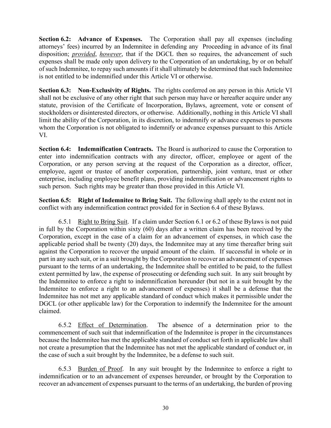 30 Section 6.2: Advance of Expenses. The Corporation shall pay all expenses (including attorneys’ fees) incurred by an Indemnitee in defending any Proceeding in advance of its final disposition; provided, however, that if the DGCL then so requires, the advancement of such expenses shall be made only upon delivery to the Corporation of an undertaking, by or on behalf of such Indemnitee, to repay such amounts if it shall ultimately be determined that such Indemnitee is not entitled to be indemnified under this Article VI or otherwise. Section 6.3: Non-Exclusivity of Rights. The rights conferred on any person in this Article VI shall not be exclusive of any other right that such person may have or hereafter acquire under any statute, provision of the Certificate of Incorporation, Bylaws, agreement, vote or consent of stockholders or disinterested directors, or otherwise. Additionally, nothing in this Article VI shall limit the ability of the Corporation, in its discretion, to indemnify or advance expenses to persons whom the Corporation is not obligated to indemnify or advance expenses pursuant to this Article VI. Section 6.4: Indemnification Contracts. The Board is authorized to cause the Corporation to enter into indemnification contracts with any director, officer, employee or agent of the Corporation, or any person serving at the request of the Corporation as a director, officer, employee, agent or trustee of another corporation, partnership, joint venture, trust or other enterprise, including employee benefit plans, providing indemnification or advancement rights to such person. Such rights may be greater than those provided in this Article VI. Section 6.5: Right of Indemnitee to Bring Suit. The following shall apply to the extent not in conflict with any indemnification contract provided for in Section 6.4 of these Bylaws. 6.5.1 Right to Bring Suit. If a claim under Section 6.1 or 6.2 of these Bylaws is not paid in full by the Corporation within sixty (60) days after a written claim has been received by the Corporation, except in the case of a claim for an advancement of expenses, in which case the applicable period shall be twenty (20) days, the Indemnitee may at any time thereafter bring suit against the Corporation to recover the unpaid amount of the claim. If successful in whole or in part in any such suit, or in a suit brought by the Corporation to recover an advancement of expenses pursuant to the terms of an undertaking, the Indemnitee shall be entitled to be paid, to the fullest extent permitted by law, the expense of prosecuting or defending such suit. In any suit brought by the Indemnitee to enforce a right to indemnification hereunder (but not in a suit brought by the Indemnitee to enforce a right to an advancement of expenses) it shall be a defense that the Indemnitee has not met any applicable standard of conduct which makes it permissible under the DGCL (or other applicable law) for the Corporation to indemnify the Indemnitee for the amount claimed. 6.5.2 Effect of Determination. The absence of a determination prior to the commencement of such suit that indemnification of the Indemnitee is proper in the circumstances because the Indemnitee has met the applicable standard of conduct set forth in applicable law shall not create a presumption that the Indemnitee has not met the applicable standard of conduct or, in the case of such a suit brought by the Indemnitee, be a defense to such suit. 6.5.3 Burden of Proof. In any suit brought by the Indemnitee to enforce a right to indemnification or to an advancement of expenses hereunder, or brought by the Corporation to recover an advancement of expenses pursuant to the terms of an undertaking, the burden of proving