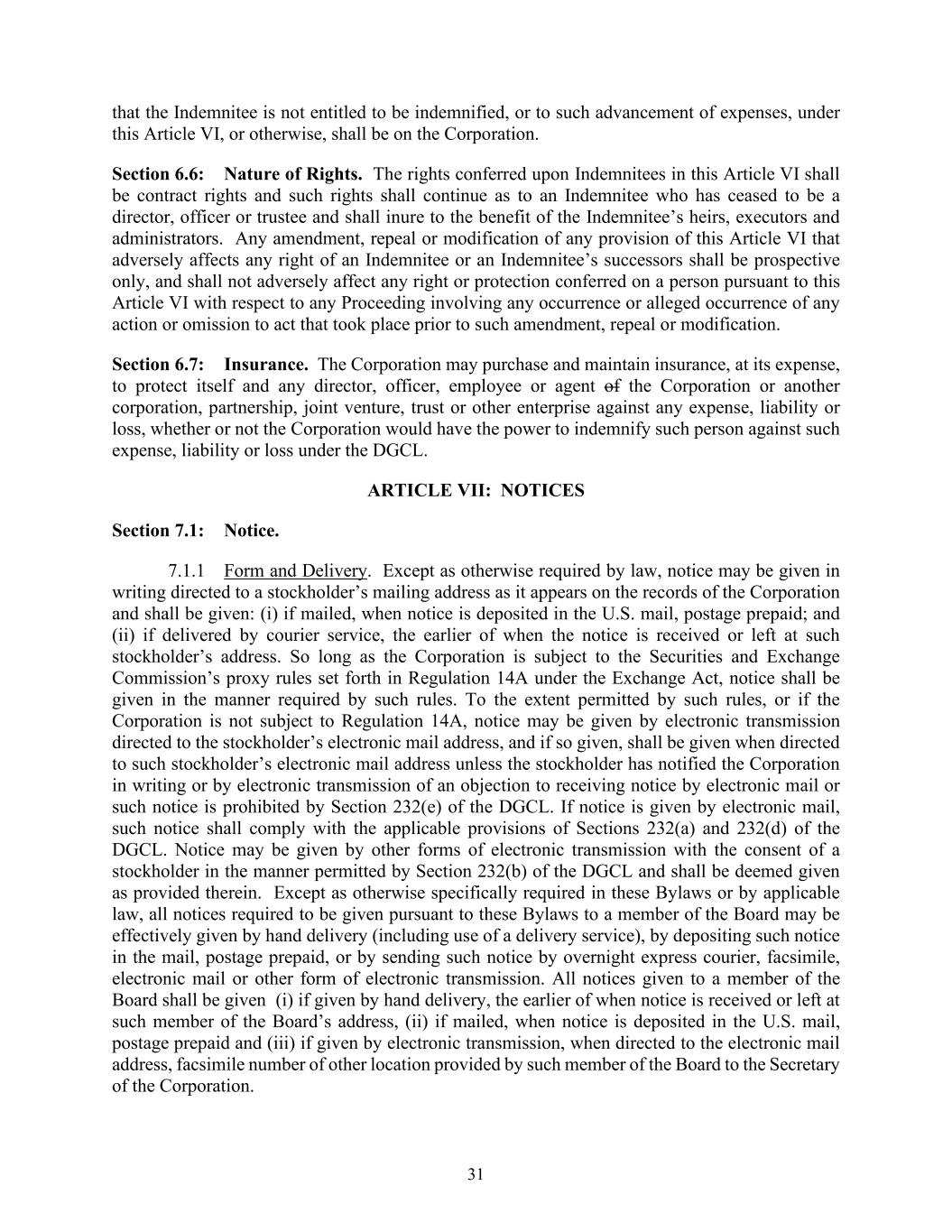 31 that the Indemnitee is not entitled to be indemnified, or to such advancement of expenses, under this Article VI, or otherwise, shall be on the Corporation. Section 6.6: Nature of Rights. The rights conferred upon Indemnitees in this Article VI shall be contract rights and such rights shall continue as to an Indemnitee who has ceased to be a director, officer or trustee and shall inure to the benefit of the Indemnitee’s heirs, executors and administrators. Any amendment, repeal or modification of any provision of this Article VI that adversely affects any right of an Indemnitee or an Indemnitee’s successors shall be prospective only, and shall not adversely affect any right or protection conferred on a person pursuant to this Article VI with respect to any Proceeding involving any occurrence or alleged occurrence of any action or omission to act that took place prior to such amendment, repeal or modification. Section 6.7: Insurance. The Corporation may purchase and maintain insurance, at its expense, to protect itself and any director, officer, employee or agent of the Corporation or another corporation, partnership, joint venture, trust or other enterprise against any expense, liability or loss, whether or not the Corporation would have the power to indemnify such person against such expense, liability or loss under the DGCL. ARTICLE VII: NOTICES Section 7.1: Notice. 7.1.1 Form and Delivery. Except as otherwise required by law, notice may be given in writing directed to a stockholder’s mailing address as it appears on the records of the Corporation and shall be given: (i) if mailed, when notice is deposited in the U.S. mail, postage prepaid; and (ii) if delivered by courier service, the earlier of when the notice is received or left at such stockholder’s address. So long as the Corporation is subject to the Securities and Exchange Commission’s proxy rules set forth in Regulation 14A under the Exchange Act, notice shall be given in the manner required by such rules. To the extent permitted by such rules, or if the Corporation is not subject to Regulation 14A, notice may be given by electronic transmission directed to the stockholder’s electronic mail address, and if so given, shall be given when directed to such stockholder’s electronic mail address unless the stockholder has notified the Corporation in writing or by electronic transmission of an objection to receiving notice by electronic mail or such notice is prohibited by Section 232(e) of the DGCL. If notice is given by electronic mail, such notice shall comply with the applicable provisions of Sections 232(a) and 232(d) of the DGCL. Notice may be given by other forms of electronic transmission with the consent of a stockholder in the manner permitted by Section 232(b) of the DGCL and shall be deemed given as provided therein. Except as otherwise specifically required in these Bylaws or by applicable law, all notices required to be given pursuant to these Bylaws to a member of the Board may be effectively given by hand delivery (including use of a delivery service), by depositing such notice in the mail, postage prepaid, or by sending such notice by overnight express courier, facsimile, electronic mail or other form of electronic transmission. All notices given to a member of the Board shall be given (i) if given by hand delivery, the earlier of when notice is received or left at such member of the Board’s address, (ii) if mailed, when notice is deposited in the U.S. mail, postage prepaid and (iii) if given by electronic transmission, when directed to the electronic mail address, facsimile number of other location provided by such member of the Board to the Secretary of the Corporation.