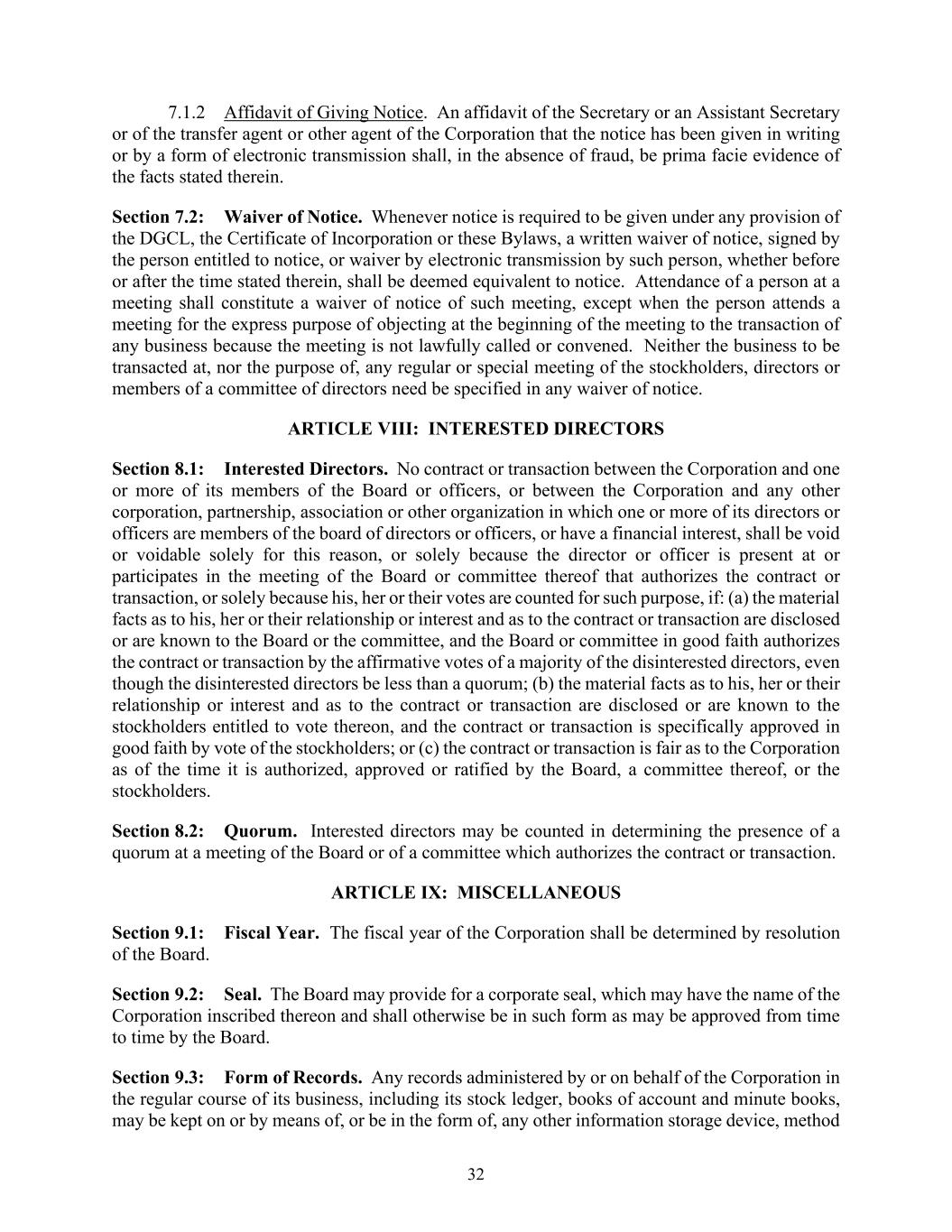 32 7.1.2 Affidavit of Giving Notice. An affidavit of the Secretary or an Assistant Secretary or of the transfer agent or other agent of the Corporation that the notice has been given in writing or by a form of electronic transmission shall, in the absence of fraud, be prima facie evidence of the facts stated therein. Section 7.2: Waiver of Notice. Whenever notice is required to be given under any provision of the DGCL, the Certificate of Incorporation or these Bylaws, a written waiver of notice, signed by the person entitled to notice, or waiver by electronic transmission by such person, whether before or after the time stated therein, shall be deemed equivalent to notice. Attendance of a person at a meeting shall constitute a waiver of notice of such meeting, except when the person attends a meeting for the express purpose of objecting at the beginning of the meeting to the transaction of any business because the meeting is not lawfully called or convened. Neither the business to be transacted at, nor the purpose of, any regular or special meeting of the stockholders, directors or members of a committee of directors need be specified in any waiver of notice. ARTICLE VIII: INTERESTED DIRECTORS Section 8.1: Interested Directors. No contract or transaction between the Corporation and one or more of its members of the Board or officers, or between the Corporation and any other corporation, partnership, association or other organization in which one or more of its directors or officers are members of the board of directors or officers, or have a financial interest, shall be void or voidable solely for this reason, or solely because the director or officer is present at or participates in the meeting of the Board or committee thereof that authorizes the contract or transaction, or solely because his, her or their votes are counted for such purpose, if: (a) the material facts as to his, her or their relationship or interest and as to the contract or transaction are disclosed or are known to the Board or the committee, and the Board or committee in good faith authorizes the contract or transaction by the affirmative votes of a majority of the disinterested directors, even though the disinterested directors be less than a quorum; (b) the material facts as to his, her or their relationship or interest and as to the contract or transaction are disclosed or are known to the stockholders entitled to vote thereon, and the contract or transaction is specifically approved in good faith by vote of the stockholders; or (c) the contract or transaction is fair as to the Corporation as of the time it is authorized, approved or ratified by the Board, a committee thereof, or the stockholders. Section 8.2: Quorum. Interested directors may be counted in determining the presence of a quorum at a meeting of the Board or of a committee which authorizes the contract or transaction. ARTICLE IX: MISCELLANEOUS Section 9.1: Fiscal Year. The fiscal year of the Corporation shall be determined by resolution of the Board. Section 9.2: Seal. The Board may provide for a corporate seal, which may have the name of the Corporation inscribed thereon and shall otherwise be in such form as may be approved from time to time by the Board. Section 9.3: Form of Records. Any records administered by or on behalf of the Corporation in the regular course of its business, including its stock ledger, books of account and minute books, may be kept on or by means of, or be in the form of, any other information storage device, method
