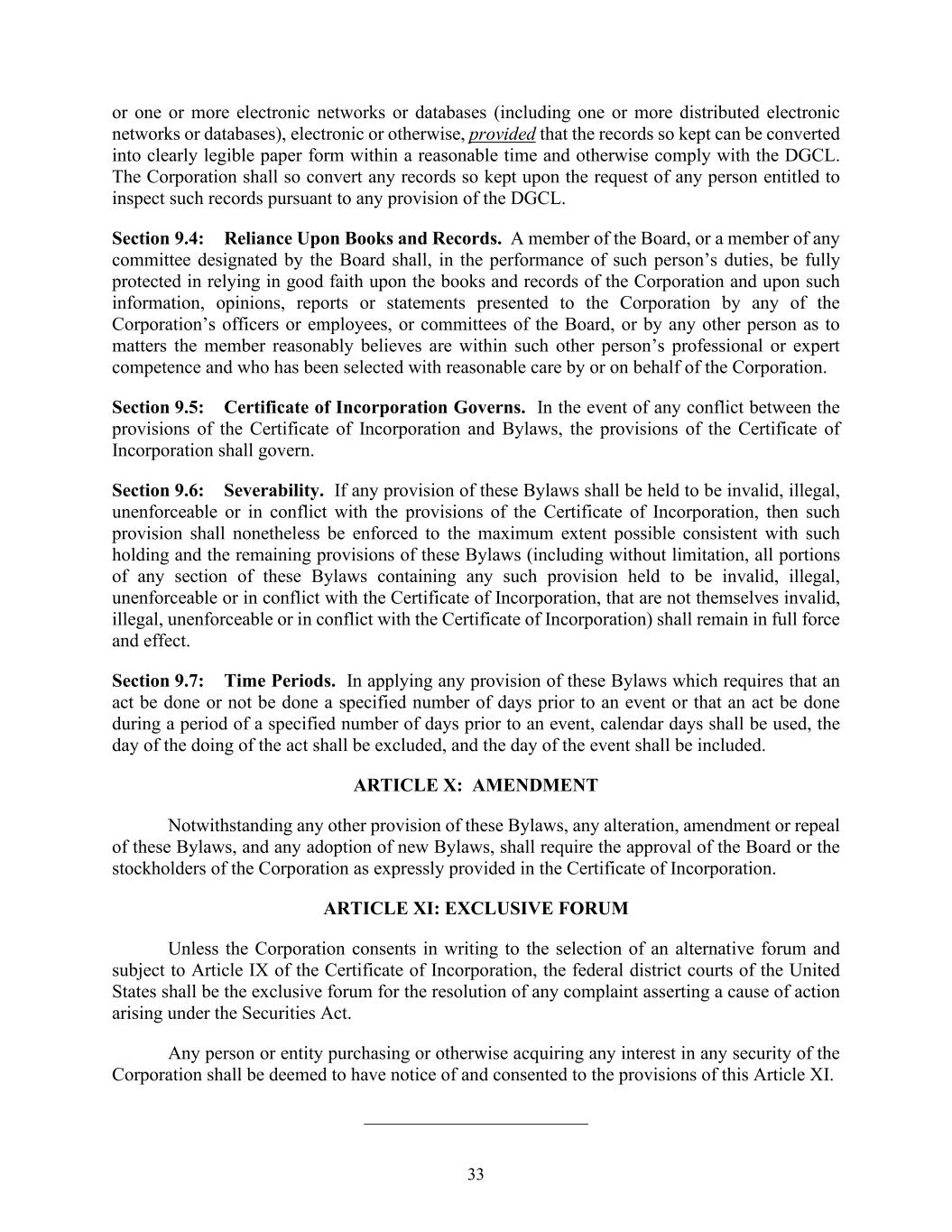 33 or one or more electronic networks or databases (including one or more distributed electronic networks or databases), electronic or otherwise, provided that the records so kept can be converted into clearly legible paper form within a reasonable time and otherwise comply with the DGCL. The Corporation shall so convert any records so kept upon the request of any person entitled to inspect such records pursuant to any provision of the DGCL. Section 9.4: Reliance Upon Books and Records. A member of the Board, or a member of any committee designated by the Board shall, in the performance of such person’s duties, be fully protected in relying in good faith upon the books and records of the Corporation and upon such information, opinions, reports or statements presented to the Corporation by any of the Corporation’s officers or employees, or committees of the Board, or by any other person as to matters the member reasonably believes are within such other person’s professional or expert competence and who has been selected with reasonable care by or on behalf of the Corporation. Section 9.5: Certificate of Incorporation Governs. In the event of any conflict between the provisions of the Certificate of Incorporation and Bylaws, the provisions of the Certificate of Incorporation shall govern. Section 9.6: Severability. If any provision of these Bylaws shall be held to be invalid, illegal, unenforceable or in conflict with the provisions of the Certificate of Incorporation, then such provision shall nonetheless be enforced to the maximum extent possible consistent with such holding and the remaining provisions of these Bylaws (including without limitation, all portions of any section of these Bylaws containing any such provision held to be invalid, illegal, unenforceable or in conflict with the Certificate of Incorporation, that are not themselves invalid, illegal, unenforceable or in conflict with the Certificate of Incorporation) shall remain in full force and effect. Section 9.7: Time Periods. In applying any provision of these Bylaws which requires that an act be done or not be done a specified number of days prior to an event or that an act be done during a period of a specified number of days prior to an event, calendar days shall be used, the day of the doing of the act shall be excluded, and the day of the event shall be included. ARTICLE X: AMENDMENT Notwithstanding any other provision of these Bylaws, any alteration, amendment or repeal of these Bylaws, and any adoption of new Bylaws, shall require the approval of the Board or the stockholders of the Corporation as expressly provided in the Certificate of Incorporation. ARTICLE XI: EXCLUSIVE FORUM Unless the Corporation consents in writing to the selection of an alternative forum and subject to Article IX of the Certificate of Incorporation, the federal district courts of the United States shall be the exclusive forum for the resolution of any complaint asserting a cause of action arising under the Securities Act. Any person or entity purchasing or otherwise acquiring any interest in any security of the Corporation shall be deemed to have notice of and consented to the provisions of this Article XI. ________________________