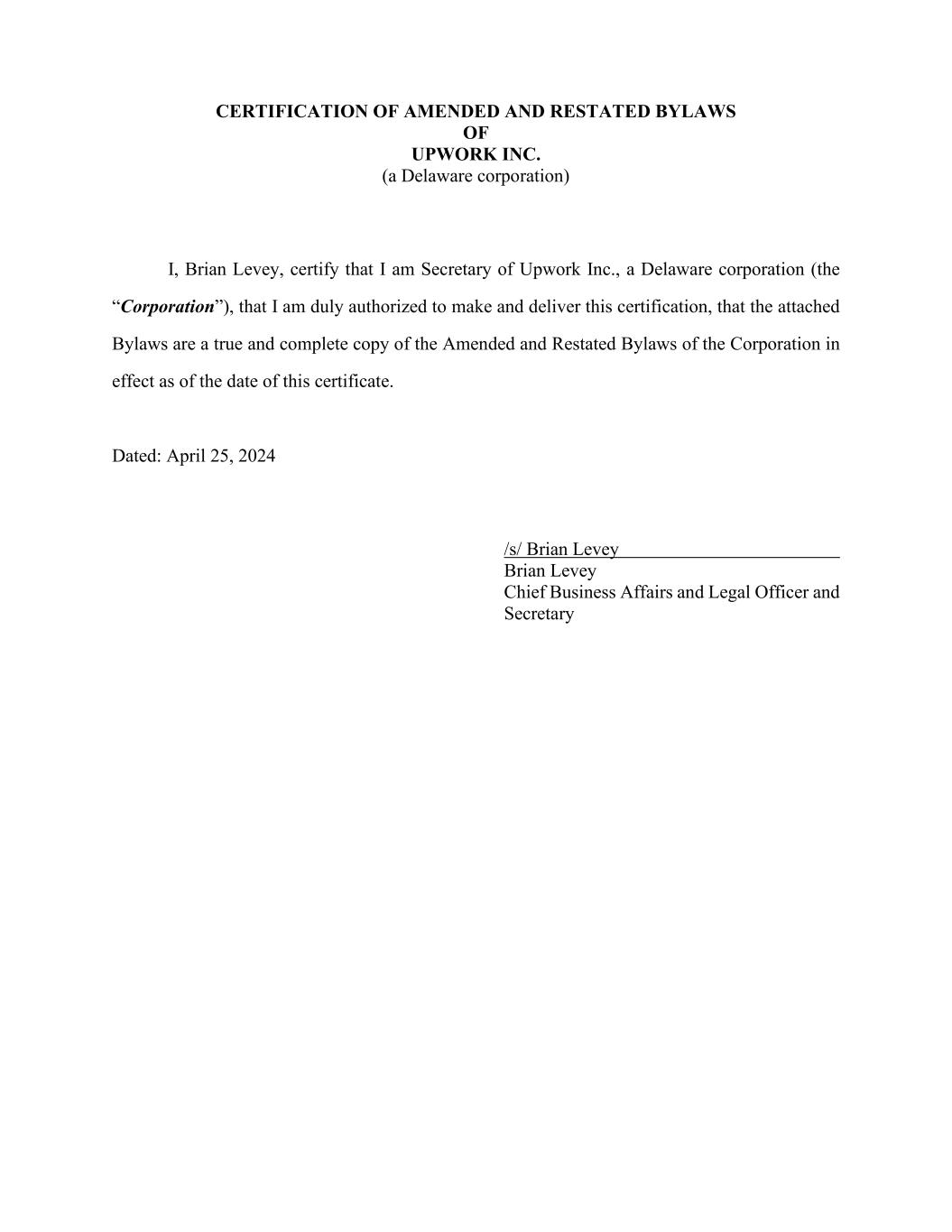 CERTIFICATION OF AMENDED AND RESTATED BYLAWS OF UPWORK INC. (a Delaware corporation) I, Brian Levey, certify that I am Secretary of Upwork Inc., a Delaware corporation (the “Corporation”), that I am duly authorized to make and deliver this certification, that the attached Bylaws are a true and complete copy of the Amended and Restated Bylaws of the Corporation in effect as of the date of this certificate. Dated: April 25, 2024 /s/ Brian Levey Brian Levey Chief Business Affairs and Legal Officer and Secretary