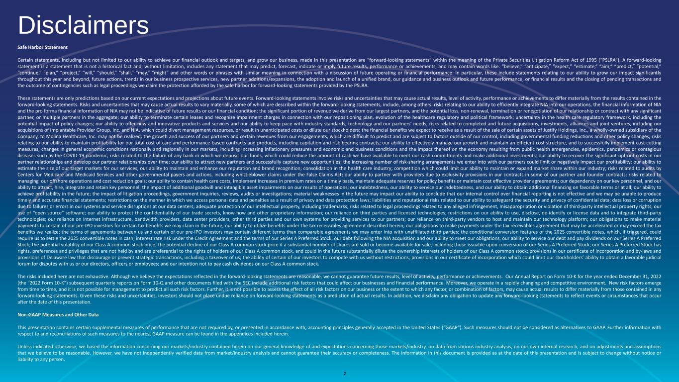 Disclaimers 2 Safe Harbor Statement ​ Certain statements, including but not limited to our ability to achieve our financial outlook and targets, and grow our business, made in this presentation are “forward-looking statements” within the meaning of the Private Securities Litigation Reform Act of 1995 (“PSLRA”). A forward-looking statement is a statement that is not a historical fact and, without limitation, includes any statement that may predict, forecast, indicate or imply future results, performance or achievements, and may contain words like: “believe,” “anticipate,” “expect,” “estimate,” “aim,” “predict,” “potential,” “continue,” “plan,” “project,” “will,” “should,” “shall,” “may,” “might” and other words or phrases with similar meaning in connection with a discussion of future operating or financial performance. In particular, these include statements relating to our ability to grow our impact significantly throughout this year and beyond, future actions, trends in our business prospective services, new partner additions/expansions, the adoption and launch of a unified brand, our guidance and business outlook and future performance, or financial results and the closing of pending transactions and the outcome of contingencies such as legal proceedings we claim the protection afforded by the safe harbor for forward-looking statements provided by the PSLRA. These statements are only predictions based on our current expectations and projections about future events. Forward-looking statements involve risks and uncertainties that may cause actual results, level of activity, performance or achievements to differ materially from the results contained in the forward-looking statements. Risks and uncertainties that may cause actual results to vary materially, some of which are described within the forward-looking statements, include, among others: risks relating to our ability to efficiently integrate NIA into our operations, the financial information of NIA and the pro forma financial information of NIA may not be indicative of future results or our financial condition; the significant portion of revenue we derive from our largest partners, and the potential loss, non-renewal, termination or renegotiation of our relationship or contract with any significant partner, or multiple partners in the aggregate; our ability to terminate certain leases and recognize impairment charges in connection with our repositioning plan, evolution of the healthcare regulatory and political framework; uncertainty in the health care regulatory framework, including the potential impact of policy changes; our ability to offer new and innovative products and services and our ability to keep pace with industry standards, technology and our partners’ needs; risks related to completed and future acquisitions, investments, alliances and joint ventures, including our acquisitions of Implantable Provider Group, Inc. and NIA, which could divert management resources, or result in unanticipated costs or dilute our stockholders; the financial benefits we expect to receive as a result of the sale of certain assets of Justify Holdings, Inc., a wholly-owned subsidiary of the Company, to Molina Healthcare, Inc. may not be realized; the growth and success of our partners and certain revenues from our engagements, which are difficult to predict and are subject to factors outside of our control, including governmental funding reductions and other policy changes; risks relating to our ability to maintain profitability for our total cost of care and performance-based contracts and products, including capitation and risk-bearing contracts; our ability to effectively manage our growth and maintain an efficient cost structure, and to successfully implement cost cutting measures; changes in general economic conditions nationally and regionally in our markets, including increasing inflationary pressures and economic and business conditions and the impact thereof on the economy resulting from public health emergencies, epidemics, pandemics or contagious diseases such as the COVID-19 pandemic, risks related to the failure of any bank in which we deposit our funds, which could reduce the amount of cash we have available to meet our cash commitments and make additional investments; our ability to recover the significant upfront costs in our partner relationships and develop our partner relationships over time; our ability to attract new partners and successfully capture new opportunities; the increasing number of risk-sharing arrangements we enter into with our partners could limit or negatively impact our profitability; our ability to estimate the size of our target markets for our services; our ability to maintain and enhance our reputation and brand recognition; consolidation in the health care industry; competition which could limit our ability to maintain or expand market share within our industry; risks related to audits by Centers for Medicare and Medicaid Services and other governmental payers and actions, including whistleblower claims under the False Claims Act; our ability to partner with providers due to exclusivity provisions in our contracts in some of our partner and founder contracts; risks related to managing our offshore operations and cost reduction goals; our ability to contain health care costs, implement increases in premium rates on a timely basis, maintain adequate reserves for policy benefits or maintain cost effective provider agreements; our dependency on our key personnel, and our ability to attract, hire, integrate and retain key personnel; the impact of additional goodwill and intangible asset impairments on our results of operations; our indebtedness, our ability to service our indebtedness, and our ability to obtain additional financing on favorable terms or at all; our ability to achieve profitability in the future; the impact of litigatio