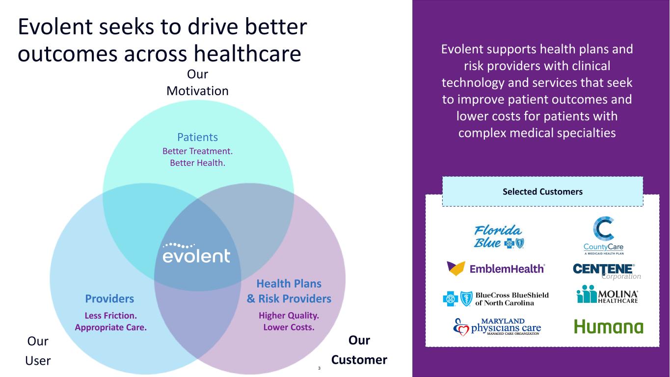Evolent | 3 Evolent seeks to drive better outcomes across healthcare Patients Health Plans & Risk ProvidersProviders Our User Our Customer Our Motivation Less Friction. Appropriate Care. Higher Quality. Lower Costs. Better Treatment. Better Health. Selected Customers Evolent supports health plans and risk providers with clinical technology and services that seek to improve patient outcomes and lower costs for patients with complex medical specialties 3