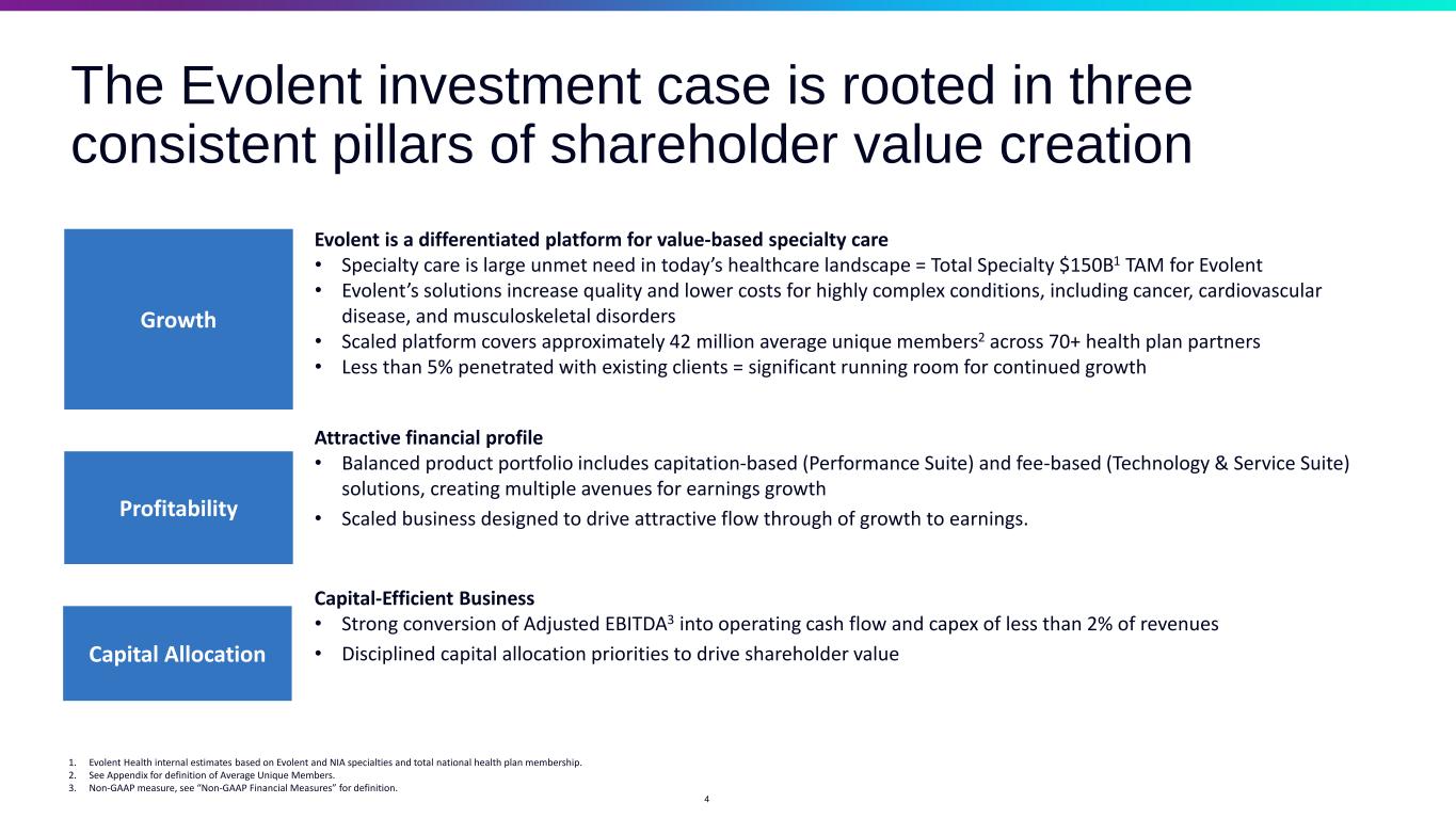 Evolent is a differentiated platform for value-based specialty care • Specialty care is large unmet need in today’s healthcare landscape = Total Specialty $150B1 TAM for Evolent • Evolent’s solutions increase quality and lower costs for highly complex conditions, including cancer, cardiovascular disease, and musculoskeletal disorders • Scaled platform covers approximately 42 million average unique members2 across 70+ health plan partners • Less than 5% penetrated with existing clients = significant running room for continued growth Attractive financial profile • Balanced product portfolio includes capitation-based (Performance Suite) and fee-based (Technology & Service Suite) solutions, creating multiple avenues for earnings growth • Scaled business designed to drive attractive flow through of growth to earnings. Capital-Efficient Business • Strong conversion of Adjusted EBITDA3 into operating cash flow and capex of less than 2% of revenues • Disciplined capital allocation priorities to drive shareholder value The Evolent investment case is rooted in three consistent pillars of shareholder value creation Growth Profitability Capital Allocation 1. Evolent Health internal estimates based on Evolent and NIA specialties and total national health plan membership. 2. See Appendix for definition of Average Unique Members. 3. Non-GAAP measure, see “Non-GAAP Financial Measures” for definition. 4