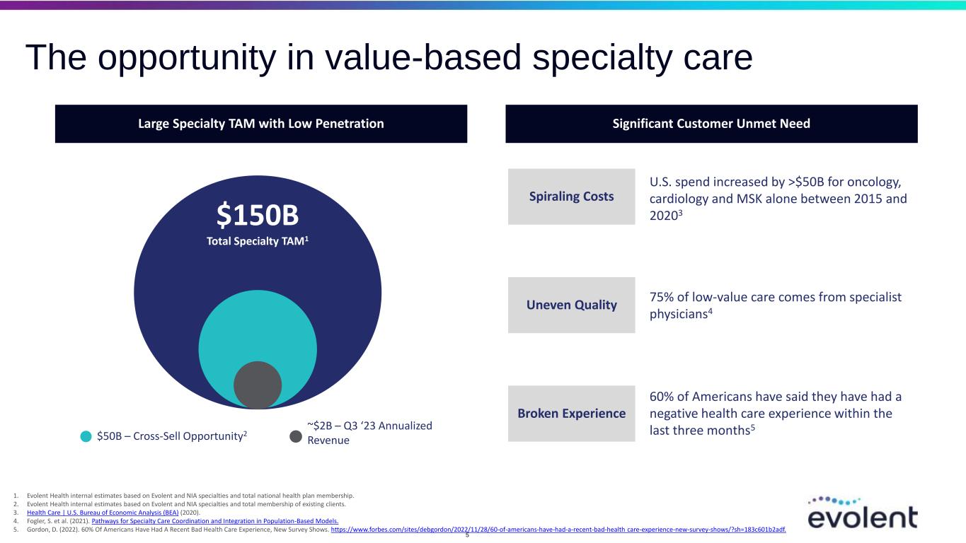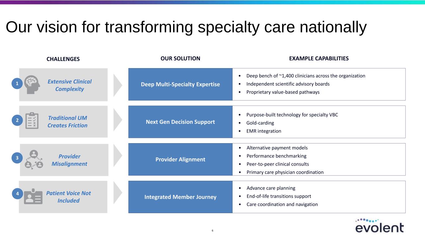 The opportunity in value-based specialty care Large Specialty TAM with Low Penetration Significant Customer Unmet Need Uneven Quality Spiraling Costs Broken Experience U.S. spend increased by >$50B for oncology, cardiology and MSK alone between 2015 and 20203 75% of low-value care comes from specialist physicians4 60% of Americans have said they have had a negative health care experience within the last three months5 $150B Total Specialty TAM1 $50B – Cross-Sell Opportunity2 ~$2B – Q3 ‘23 Annualized Revenue 1. Evolent Health internal estimates based on Evolent and NIA specialties and total national health plan membership. 2. Evolent Health internal estimates based on Evolent and NIA specialties and total membership of existing clients. 3. Health Care | U.S. Bureau of Economic Analysis (BEA) (2020). 4. Fogler, S. et al. (2021). Pathways for Specialty Care Coordination and Integration in Population-Based Models. 5. Gordon, D. (2022). 60% Of Americans Have Had A Recent Bad Health Care Experience, New Survey Shows. https://www.forbes.com/sites/debgordon/2022/11/28/60-of-americans-have-had-a-recent-bad-health care-experience-new-survey-shows/?sh=183c601b2adf. 5