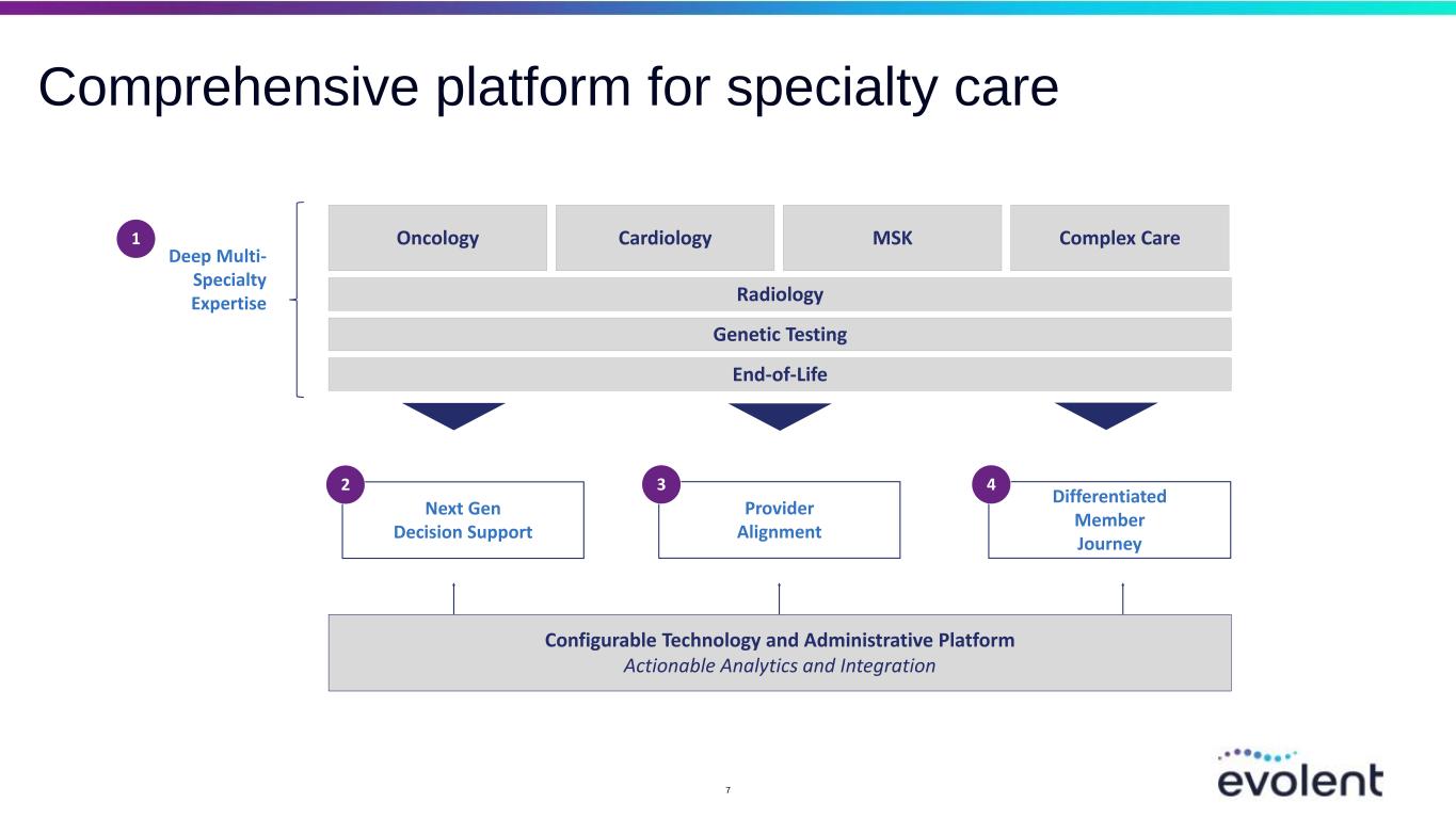 Our vision for transforming specialty care nationally Extensive Clinical Complexity Traditional UM Creates Friction Provider Misalignment Patient Voice Not Included 1 2 3 4 CHALLENGES OUR SOLUTION • Deep bench of ~1,400 clinicians across the organization • Independent scientific advisory boards • Proprietary value-based pathways Deep Multi-Specialty Expertise Next Gen Decision Support Provider Alignment Integrated Member Journey EXAMPLE CAPABILITIES • Purpose-built technology for specialty VBC • Gold-carding • EMR integration • Alternative payment models • Performance benchmarking • Peer-to-peer clinical consults • Primary care physician coordination • Advance care planning • End-of-life transitions support • Care coordination and navigation 6