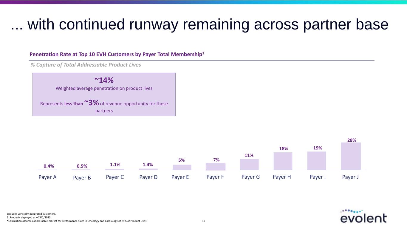 ... with continued runway remaining across partner base Payer A Payer D Payer HPayer B Payer E Payer GPayer C Payer I Penetration Rate at Top 10 EVH Customers by Payer Total Membership1 % Capture of Total Addressable Product Lives 0.4% 0.5% 1.1% 1.4% 5% 7% 11% 18% 19% 28% ~14% Weighted average penetration on product lives Represents less than ~3% of revenue opportunity for these partners 10 Excludes vertically integrated customers.​ 1. Products deployed as of 3/1/2023.​ *Calculation assumes addressable market for Performance Suite in Oncology and Cardiology of 75% of Product Lives.​ Payer F Payer J