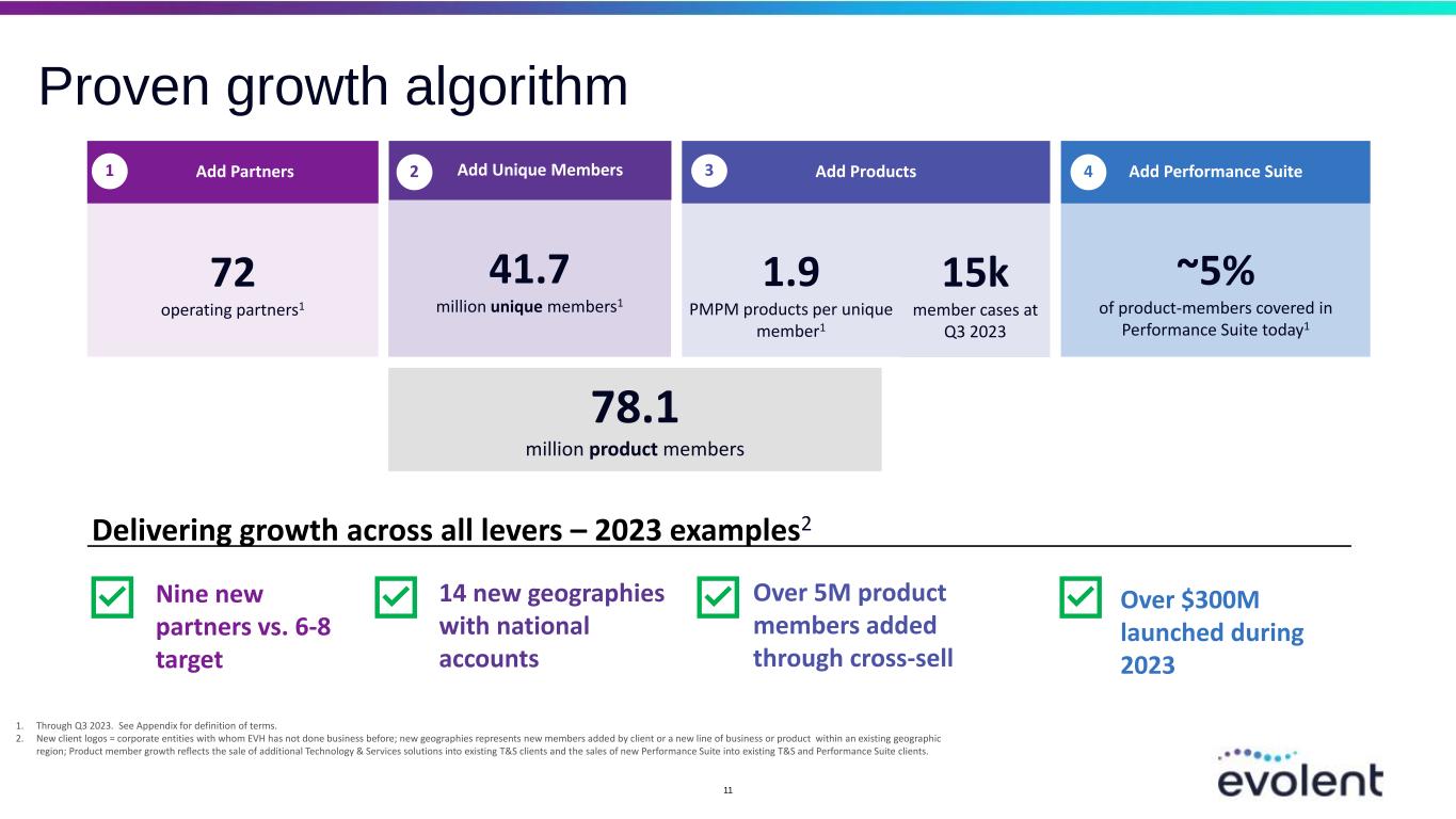 72 operating partners1 Add Partners 41.7 million unique members1 Add Unique Members 1.9 PMPM products per unique member1 Add Products ~5% of product-members covered in Performance Suite today1 Add Performance Suite 78.1 million product members 1 2 3 4 Proven growth algorithm 15k member cases at Q3 2023 1. Through Q3 2023. See Appendix for definition of terms. 2. New client logos = corporate entities with whom EVH has not done business before; new geographies represents new members added by client or a new line of business or product within an existing geographic region; Product member growth reflects the sale of additional Technology & Services solutions into existing T&S clients and the sales of new Performance Suite into existing T&S and Performance Suite clients. 11 Delivering growth across all levers – 2023 examples2 Nine new partners vs. 6-8 target Over $300M launched during 2023 14 new geographies with national accounts Over 5M product members added through cross-sell