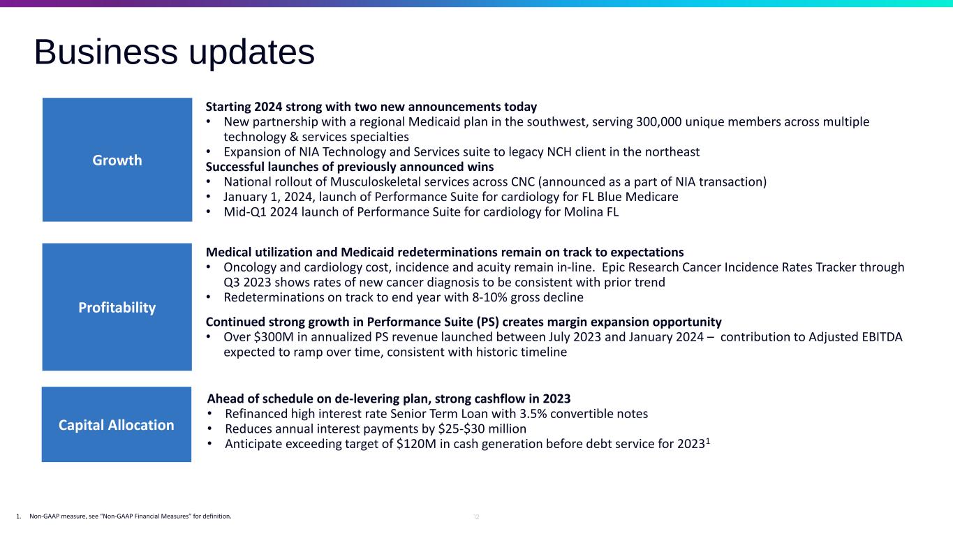 Starting 2024 strong with two new announcements today • New partnership with a regional Medicaid plan in the southwest, serving 300,000 unique members across multiple technology & services specialties • Expansion of NIA Technology and Services suite to legacy NCH client in the northeast Successful launches of previously announced wins • National rollout of Musculoskeletal services across CNC (announced as a part of NIA transaction) • January 1, 2024, launch of Performance Suite for cardiology for FL Blue Medicare • Mid-Q1 2024 launch of Performance Suite for cardiology for Molina FL Business updates Growth Profitability Capital Allocation Medical utilization and Medicaid redeterminations remain on track to expectations • Oncology and cardiology cost, incidence and acuity remain in-line. Epic Research Cancer Incidence Rates Tracker through Q3 2023 shows rates of new cancer diagnosis to be consistent with prior trend • Redeterminations on track to end year with 8-10% gross decline Continued strong growth in Performance Suite (PS) creates margin expansion opportunity • Over $300M in annualized PS revenue launched between July 2023 and January 2024 – contribution to Adjusted EBITDA expected to ramp over time, consistent with historic timeline Ahead of schedule on de-levering plan, strong cashflow in 2023 • Refinanced high interest rate Senior Term Loan with 3.5% convertible notes • Reduces annual interest payments by $25-$30 million • Anticipate exceeding target of $120M in cash generation before debt service for 20231 121. Non-GAAP measure, see “Non-GAAP Financial Measures” for definition.