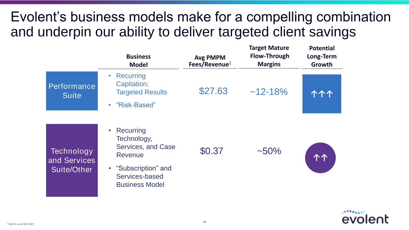 Evolent’s business models make for a compelling combination and underpin our ability to deliver targeted client savings Performance Suite Technology and Services Suite/Other Business Model Target Mature Flow-Through Margins Avg PMPM Fees/Revenue1 Potential Long-Term Growth • Recurring Capitation; Targeted Results • “Risk-Based” • Recurring Technology, Services, and Case Revenue • “Subscription” and Services-based Business Model $27.63 $0.37 ↑↑↑ ↑↑ 1 Metric as of Q3 2023 ~12-18% ~50% 13