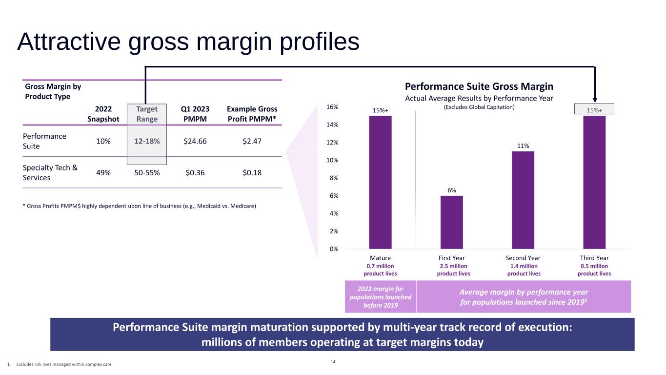 2022 margin for populations launched before 2019 Average margin by performance year for populations launched since 20191 Attractive gross margin profiles * Gross Profits PMPM$ highly dependent upon line of business (e.g., Medicaid vs. Medicare) Performance Suite margin maturation supported by multi-year track record of execution: millions of members operating at target margins today Gross Margin by Product Type 2022 Snapshot Target Range Q1 2023 PMPM Example Gross Profit PMPM* Performance Suite 10% 12-18% $24.66 $2.47 Specialty Tech & Services 49% 50-55% $0.36 $0.18 15%+ 6% 11% 15%+ 0% 2% 4% 6% 8% 10% 12% 14% 16% Mature First Year Second Year Third Year Performance Suite Gross Margin Actual Average Results by Performance Year (Excludes Global Capitation) 0.7 million product lives 2.5 million product lives 1.4 million product lives 0.5 million product lives 1. Excludes risk lives managed within complex care. 14