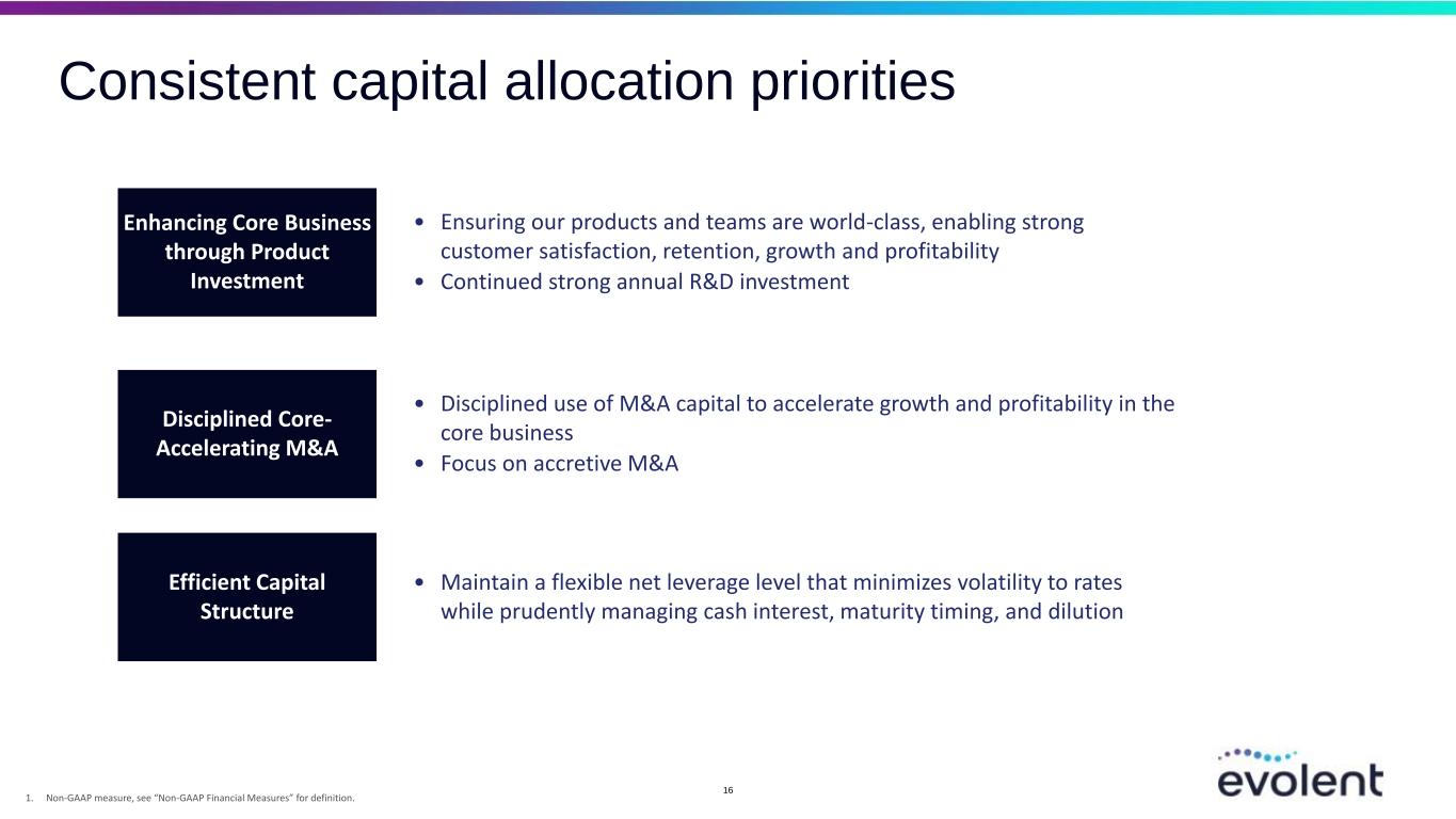 Consistent capital allocation priorities Enhancing Core Business through Product Investment • Ensuring our products and teams are world-class, enabling strong customer satisfaction, retention, growth and profitability • Continued strong annual R&D investment Disciplined Core- Accelerating M&A • Disciplined use of M&A capital to accelerate growth and profitability in the core business • Focus on accretive M&A 1. Non-GAAP measure, see “Non-GAAP Financial Measures” for definition. 16 Efficient Capital Structure • Maintain a flexible net leverage level that minimizes volatility to rates while prudently managing cash interest, maturity timing, and dilution