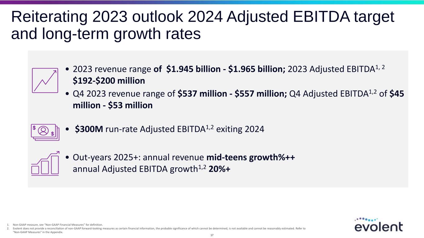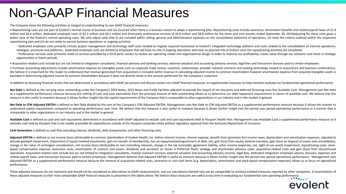 Non-GAAP Financial Measures The Company views the following activities as integral to understanding its non-GAAP financial measures: • Repositioning costs are not part of Evolent’s normal course of business and are incurred when there is a business reason to adopt a repositioning plan. Repositioning costs include severance, termination benefits and related payroll taxes of $1.8 million and $6.6 million, dedicated employee costs of $2.3 million and $4.1 million and third-party professional services of $4.0 million and $8.8 million for the three and nine months ended September 30, 2023Adjusting for these costs gives a better view of the Evolent’s normal operating costs. We only adjust costs that (i) are included within selling, general and administrative expenses on the consolidated statement of operations, (ii) meet the criteria outlined within the respective repositioning plan and (iii) do not relate to normal business operations or ongoing activities. ◦ Dedicated employee costs primarily include project management and technology staff costs needed to migrate acquired businesses to Evolent’s integrated technology platform and costs related to the consolidation of internal operations, strategies, processes and platforms. Dedicated employee costs are limited to employees that will have no role in ongoing operations and have no planned role at Evolent once the repositioning activities are completed. ◦ Professional services costs primarily relate to services provided by a third-party vendor to review our operating model and organizational design in order to improve our profitability, create value through our solutions and invest in strategic opportunities in future periods. • Acquisition-related costs include but are not limited to integration consultants, financial advisory and banking services, external valuation and accounting advisory services, legal fees and transaction bonuses paid to certain employees. • Purchase accounting adjustments include amortization expense on intangible assets such as corporate trade names, customer, relationships, provider network contracts and existing technology related to acquisitions and business combinations. We believe it is important for the reader to understand that revenue generated from acquisitions is included within revenue in calculating adjusted income to common shareholders however amortization expense from acquired intangible assets is excluded in determining adjusted income to common shareholders because it does not directly relate to the services performed for the Company’s customers. In addition to disclosing financial results that are determined in accordance with GAAP, we present and discuss certain non-GAAP financial measures, as supplemental measures to help investors evaluate our fundamental operational performance. Net Debt is defined as the carrying value outstanding under the Company’s 2024 Notes, 2025 Notes and Credit Facilities adjusted to exclude the impact of net discounts and deferred financing costs less Available Cash. Management uses Net Debt as a supplemental performance measure because the netting of cash and cash equivalents from the principal amount of debt outstanding allows us to determine our debt repayment requirements in excess of available cash. We believe that this measure is also useful to investors because it allows further insight into the capital requirements of the Company that is comparable to other organizations in our industry and in the market in general. Net Debt to LTM Adjusted EBITDA is defined as Net Debt divided by the sum of the Company's LTM Adjusted EBITDA. Management uses Net Debt to LTM Adjusted EBITDA as a supplemental performance measure because it allows the investor to understand capital requirements compared to operating performance over time. We believe that this measure is also useful to investors because it allows further insight into the period over period operational performance in a manner that is comparable to other organizations in our industry and in the market in general. Available Cash is defined as cash and cash equivalents determined in accordance with GAAP adjusted to exclude cash and cash equivalents held at Passport Health Plan. Management uses Available Cash a supplemental performance measure as it excludes cash held by Passport that is not readily accessible for expenditures outside of the Passport corporate entity without regulatory approval from the Kentucky Department of Insurance. Cash Generation is defined as cash flow excluding interest, dividends, debt prepayments, and other financing costs. Adjusted EBITDA is defined as net income (loss) attributable to common shareholders of Evolent Health, Inc. before interest income, interest expense, benefit from (provision for) income taxes, depreciation and amortization expenses, adjusted to exclude goodwill impairment, impairment of equity method investments, gain on transfer of membership, loss on repayment/extinguishment of debt, net, gain (loss) from equity method investees, gain (loss) on disposal of assets and consolidation, change in fair value of contingent consideration, net income (loss) attributable to non-controlling interests, change in the tax receivable agreement liability, other income (expense), net, right-of-use assets impairment, repositioning costs, stock- based compensation expense, severance costs, amortization of contract cost assets, dividends and accretion on Series A Preferred Stock, strategy and shareholder advisory costs, acquisition-related costs and gain (loss) from discontinued operations. Acquisition-related costs include but are not limited to integration consultants, investor outreach services, external valuation and accounting advisory services, legal fees, dedicated integration employee salaries, bonuses, expenses and related payroll taxes, and transaction bonuses paid to certain employees. Management believes that Adjusted EBITDA is useful to investors because it allows