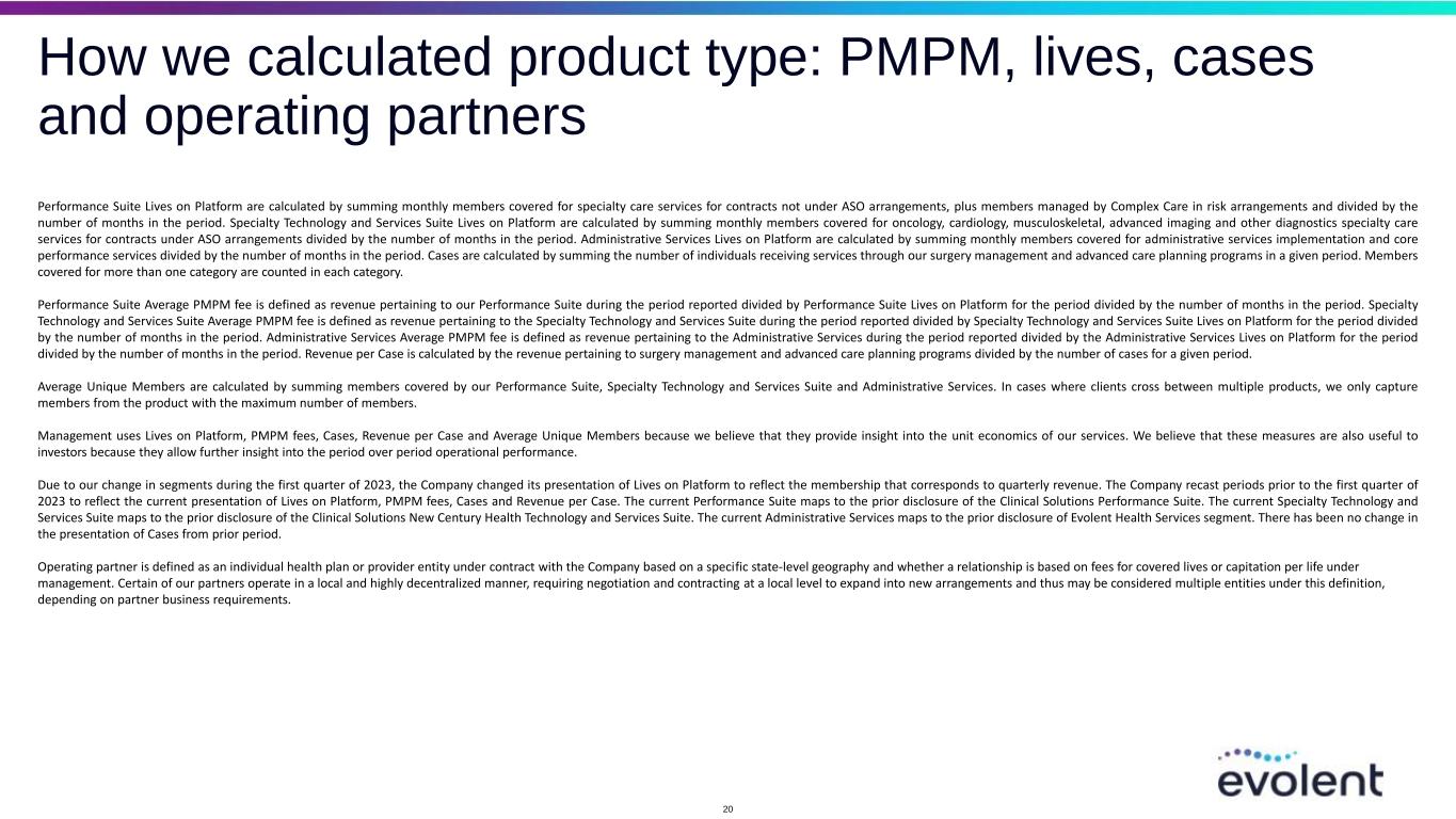 How we calculated product type: PMPM, lives, cases and operating partners Performance Suite Lives on Platform are calculated by summing monthly members covered for specialty care services for contracts not under ASO arrangements, plus members managed by Complex Care in risk arrangements and divided by the number of months in the period. Specialty Technology and Services Suite Lives on Platform are calculated by summing monthly members covered for oncology, cardiology, musculoskeletal, advanced imaging and other diagnostics specialty care services for contracts under ASO arrangements divided by the number of months in the period. Administrative Services Lives on Platform are calculated by summing monthly members covered for administrative services implementation and core performance services divided by the number of months in the period. Cases are calculated by summing the number of individuals receiving services through our surgery management and advanced care planning programs in a given period. Members covered for more than one category are counted in each category. Performance Suite Average PMPM fee is defined as revenue pertaining to our Performance Suite during the period reported divided by Performance Suite Lives on Platform for the period divided by the number of months in the period. Specialty Technology and Services Suite Average PMPM fee is defined as revenue pertaining to the Specialty Technology and Services Suite during the period reported divided by Specialty Technology and Services Suite Lives on Platform for the period divided by the number of months in the period. Administrative Services Average PMPM fee is defined as revenue pertaining to the Administrative Services during the period reported divided by the Administrative Services Lives on Platform for the period divided by the number of months in the period. Revenue per Case is calculated by the revenue pertaining to surgery management and advanced care planning programs divided by the number of cases for a given period. Average Unique Members are calculated by summing members covered by our Performance Suite, Specialty Technology and Services Suite and Administrative Services. In cases where clients cross between multiple products, we only capture members from the product with the maximum number of members. Management uses Lives on Platform, PMPM fees, Cases, Revenue per Case and Average Unique Members because we believe that they provide insight into the unit economics of our services. We believe that these measures are also useful to investors because they allow further insight into the period over period operational performance. Due to our change in segments during the first quarter of 2023, the Company changed its presentation of Lives on Platform to reflect the membership that corresponds to quarterly revenue. The Company recast periods prior to the first quarter of 2023 to reflect the current presentation of Lives on Platform, PMPM fees, Cases and Revenue per Case. The current Performance Suite maps to the prior disclosure of the Clinical Solutions Performance Suite. The current Specialty Technology and Services Suite maps to the prior disclosure of the Clinical Solutions New Century Health Technology and Services Suite. The current Administrative Services maps to the prior disclosure of Evolent Health Services segment. There has been no change in the presentation of Cases from prior period. Operating partner is defined as an individual health plan or provider entity under contract with the Company based on a specific state-level geography and whether a relationship is based on fees for covered lives or capitation per life under management. Certain of our partners operate in a local and highly decentralized manner, requiring negotiation and contracting at a local level to expand into new arrangements and thus may be considered multiple entities under this definition, depending on partner business requirements. 20