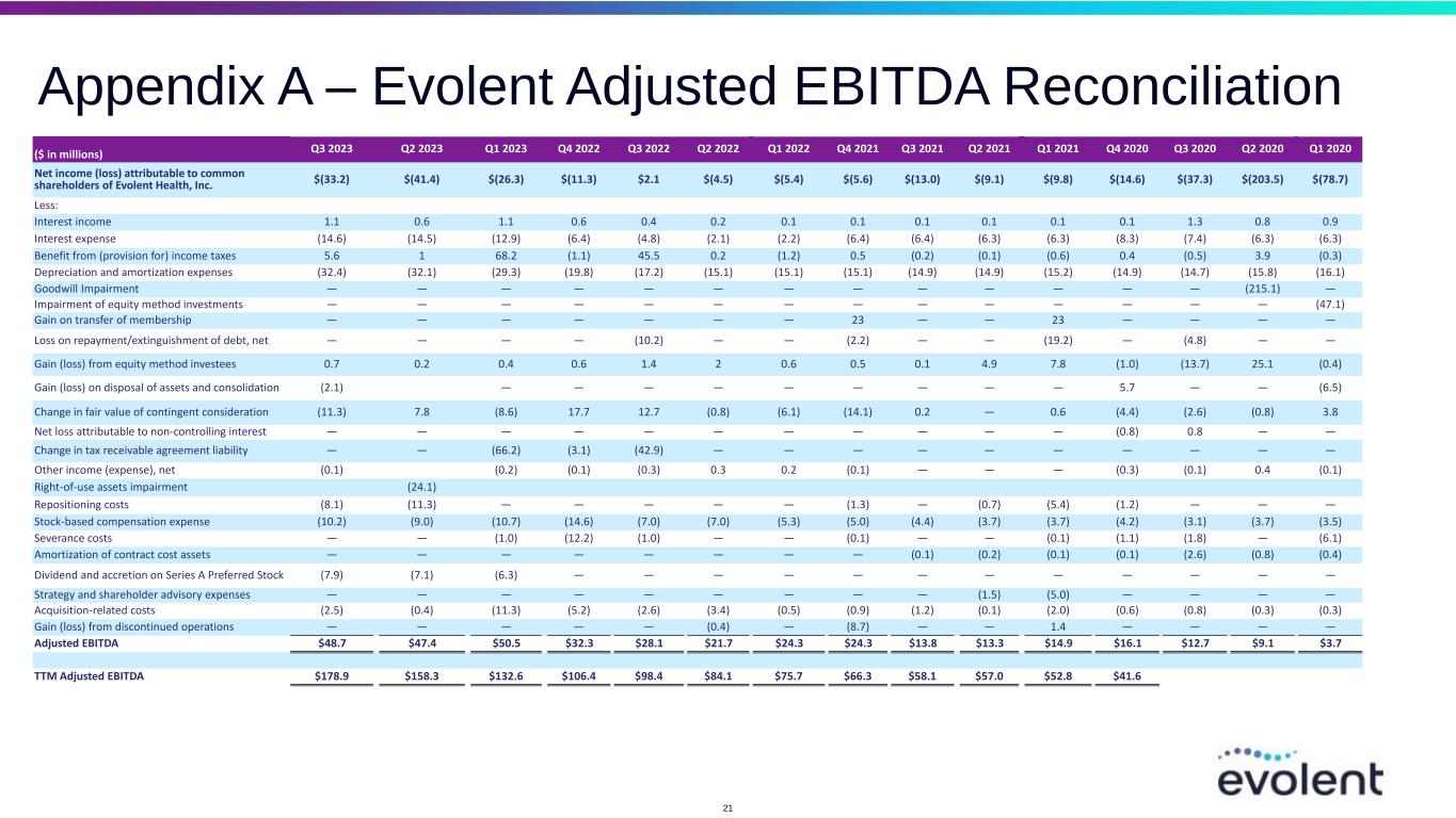 Appendix A – Evolent Adjusted EBITDA Reconciliation ($ in millions) Q3 2023 Q2 2023 Q1 2023 Q4 2022 Q3 2022 Q2 2022 Q1 2022 Q4 2021 Q3 2021 Q2 2021 Q1 2021 Q4 2020 Q3 2020 Q2 2020 Q1 2020 Net income (loss) attributable to common shareholders of Evolent Health, Inc. $(33.2) $(41.4) $(26.3) $(11.3) $2.1 $(4.5) $(5.4) $(5.6) $(13.0) $(9.1) $(9.8) $(14.6) $(37.3) $(203.5) $(78.7) Less: Interest income 1.1 0.6 1.1 0.6 0.4 0.2 0.1 0.1 0.1 0.1 0.1 0.1 1.3 0.8 0.9 Interest expense (14.6) (14.5) (12.9) (6.4) (4.8) (2.1) (2.2) (6.4) (6.4) (6.3) (6.3) (8.3) (7.4) (6.3) (6.3) Benefit from (provision for) income taxes 5.6 1 68.2 (1.1) 45.5 0.2 (1.2) 0.5 (0.2) (0.1) (0.6) 0.4 (0.5) 3.9 (0.3) Depreciation and amortization expenses (32.4) (32.1) (29.3) (19.8) (17.2) (15.1) (15.1) (15.1) (14.9) (14.9) (15.2) (14.9) (14.7) (15.8) (16.1) Goodwill Impairment — — — — — — — — — — — — — (215.1) — Impairment of equity method investments — — — — — — — — — — — — — — (47.1) Gain on transfer of membership — — — — — — — 23 — — 23 — — — — Loss on repayment/extinguishment of debt, net — — — — (10.2) — — (2.2) — — (19.2) — (4.8) — — Gain (loss) from equity method investees 0.7 0.2 0.4 0.6 1.4 2 0.6 0.5 0.1 4.9 7.8 (1.0) (13.7) 25.1 (0.4) Gain (loss) on disposal of assets and consolidation (2.1) — — — — — — — — — 5.7 — — (6.5) Change in fair value of contingent consideration (11.3) 7.8 (8.6) 17.7 12.7 (0.8) (6.1) (14.1) 0.2 — 0.6 (4.4) (2.6) (0.8) 3.8 Net loss attributable to non-controlling interest — — — — — — — — — — — (0.8) 0.8 — — Change in tax receivable agreement liability — — (66.2) (3.1) (42.9) — — — — — — — — — — Other income (expense), net (0.1) (0.2) (0.1) (0.3) 0.3 0.2 (0.1) — — — (0.3) (0.1) 0.4 (0.1) Right-of-use assets impairment (24.1) Repositioning costs (8.1) (11.3) — — — — — (1.3) — (0.7) (5.4) (1.2) — — — Stock-based compensation expense (10.2) (9.0) (10.7) (14.6) (7.0) (7.0) (5.3) (5.0) (4.4) (3.7) (3.7) (4.2) (3.1) (3.7) (3.5) Severance costs — — (1.0) (12.2) (1.0) — — (0.1) — — (0.1) (1.1) (1.8) — (6.1) Amortization of contract cost assets — — — — — — — — (0.1) (0.2) (0.1) (0.1) (2.6) (0.8) (0.4) Dividend and accretion on Series A Preferred Stock (7.9) (7.1) (6.3) — — — — — — — — — — — — Strategy and shareholder advisory expenses — — — — — — — — — (1.5) (5.0) — — — — Acquisition-related costs (2.5) (0.4) (11.3) (5.2) (2.6) (3.4) (0.5) (0.9) (1.2) (0.1) (2.0) (0.6) (0.8) (0.3) (0.3) Gain (loss) from discontinued operations — — — — — (0.4) — (8.7) — — 1.4 — — — — Adjusted EBITDA $48.7 $47.4 $50.5 $32.3 $28.1 $21.7 $24.3 $24.3 $13.8 $13.3 $14.9 $16.1 $12.7 $9.1 $3.7 TTM Adjusted EBITDA $178.9 $158.3 $132.6 $106.4 $98.4 $84.1 $75.7 $66.3 $58.1 $57.0 $52.8 $41.6 21