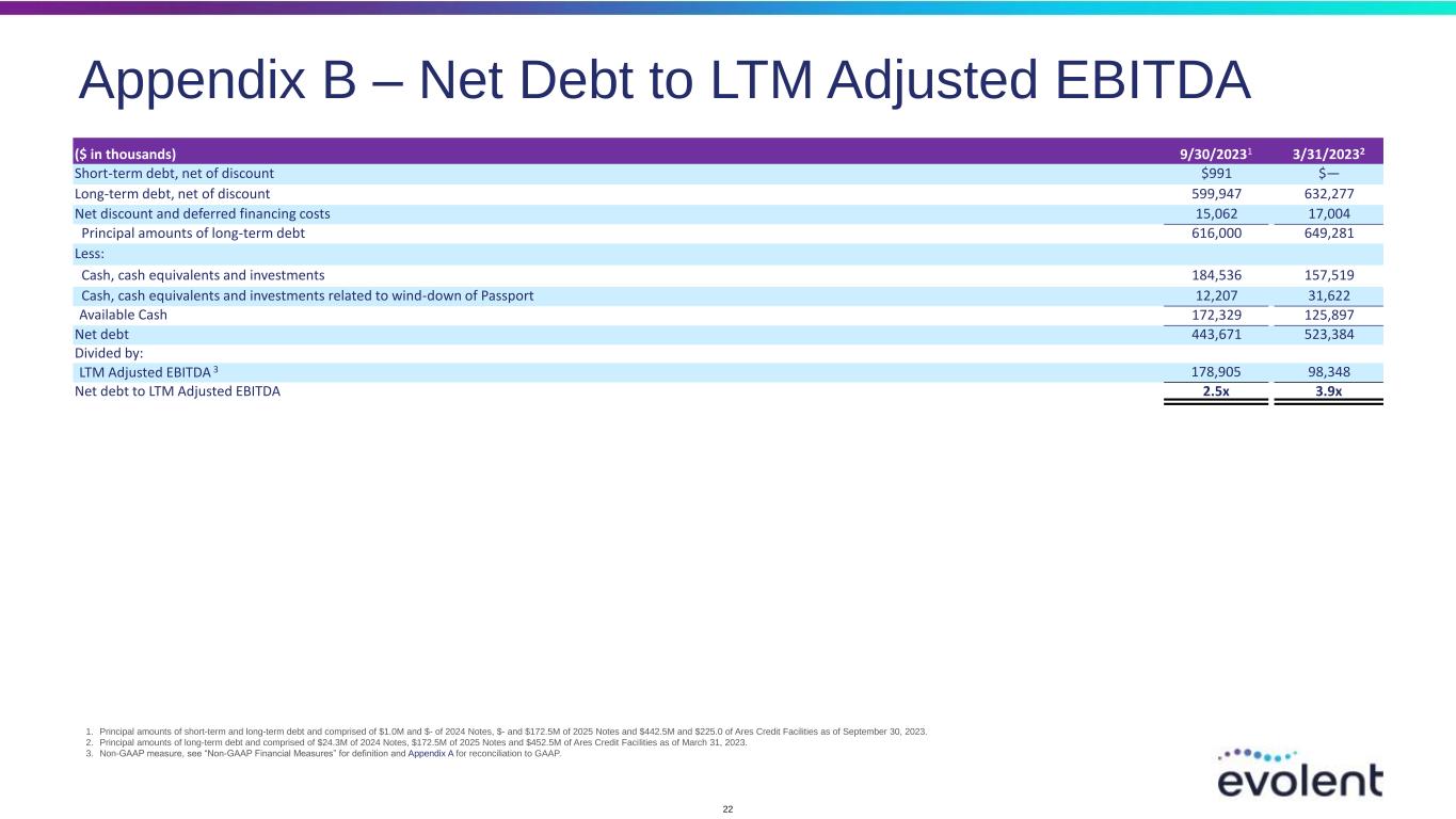 Appendix B – Net Debt to LTM Adjusted EBITDA 1. Principal amounts of short-term and long-term debt and comprised of $1.0M and $- of 2024 Notes, $- and $172.5M of 2025 Notes and $442.5M and $225.0 of Ares Credit Facilities as of September 30, 2023. 2. Principal amounts of long-term debt and comprised of $24.3M of 2024 Notes, $172.5M of 2025 Notes and $452.5M of Ares Credit Facilities as of March 31, 2023. 3. Non-GAAP measure, see “Non-GAAP Financial Measures” for definition and Appendix A for reconciliation to GAAP. ($ in thousands) 9/30/20231 3/31/20232 Short-term debt, net of discount $991 $— Long-term debt, net of discount 599,947 632,277 Net discount and deferred financing costs 15,062 17,004 Principal amounts of long-term debt 616,000 649,281 Less: Cash, cash equivalents and investments 184,536 157,519 Cash, cash equivalents and investments related to wind-down of Passport 12,207 31,622 Available Cash 172,329 125,897 Net debt 443,671 523,384 Divided by: LTM Adjusted EBITDA 3 178,905 98,348 Net debt to LTM Adjusted EBITDA 2.5x 3.9x 22
