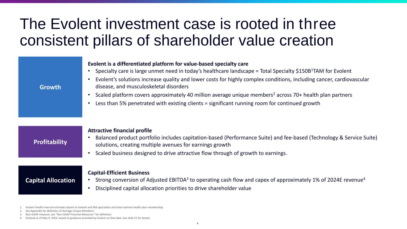 Evolent | 3 Evolent seeks to drive better outcomes across healthcare Patients Health Plans & Risk ProvidersProviders Our User Our Customer Our Motivation Less Friction. Appropriate Care. Higher Quality. Lower Costs. Better Treatment. Better Health. Selected Customers Evolent supports health plans and risk providers with clinical technology and services that seek to improve patient outcomes and lower costs for patients with complex medical specialties 3