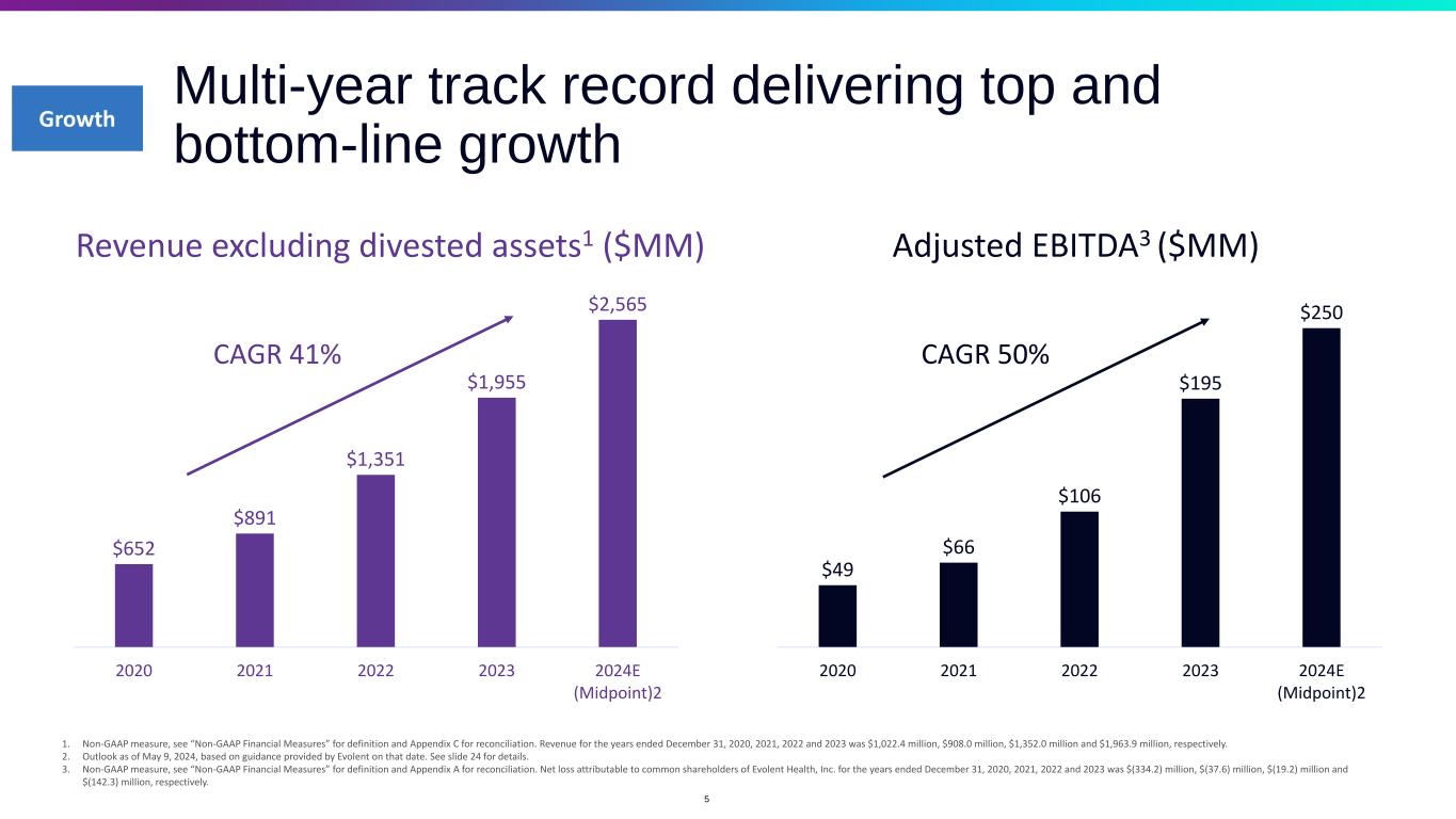 Evolent is a differentiated platform for value-based specialty care • Specialty care is large unmet need in today’s healthcare landscape = Total Specialty $150B1TAM for Evolent • Evolent’s solutions increase quality and lower costs for highly complex conditions, including cancer, cardiovascular disease, and musculoskeletal disorders • Scaled platform covers approximately 40 million average unique members2 across 70+ health plan partners • Less than 5% penetrated with existing clients = significant running room for continued growth The Evolent investment case is rooted in three consistent pillars of shareholder value creation Growth Profitability Capital Allocation 1. Evolent Health internal estimates based on Evolent and NIA specialties and total national health plan membership. 2. See Appendix for definition of Average Unique Members. 3. Non-GAAP measure, see “Non-GAAP Financial Measures” for definition. 4. Outlook as of May 9, 2024, based on guidance provided by Evolent on that date. See slide 21 for details. 4 Attractive financial profile • Balanced product portfolio includes capitation-based (Performance Suite) and fee-based (Technology & Service Suite) solutions, creating multiple avenues for earnings growth • Scaled business designed to drive attractive flow through of growth to earnings. Capital-Efficient Business • Strong conversion of Adjusted EBITDA3 to operating cash flow and capex of approximately 1% of 2024E revenue4 • Disciplined capital allocation priorities to drive shareholder value