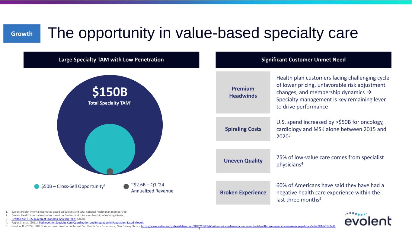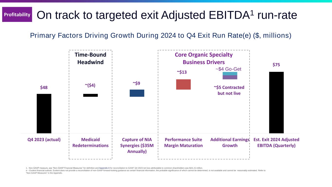 On track to targeted exit Adjusted EBITDA1 run-rate Primary Factors Driving Growth During 2024 to Q4 Exit Run Rate(e) ($, millions) 1. Non-GAAP measure, see “Non-GAAP Financial Measures” for definition and Appendix A for reconciliation to GAAP. Q4 2023 net loss attributable to common shareholders was $(41.4) million. e – Evolent financial outlook. Evolent does not provide a reconciliation of non-GAAP forward-looking guidance as certain financial information, the probable significance of which cannot be determined, is not available and cannot be reasonably estimated. Refer to "Non-GAAP Measures" in the Appendix. Core Organic Specialty Business Drivers Time-Bound Headwind $48 ~($4) ~$9 ~$13 ~$5 Contracted but not live $75 ~$4 Go-Get Q4 2023 (actual) Medicaid Redeterminations Capture of NIA Synergies ($35M Annually) Performance Suite Margin Maturation Additional Earnings Growth Est. Exit 2024 Adjusted EBITDA (Quarterly) Profitability