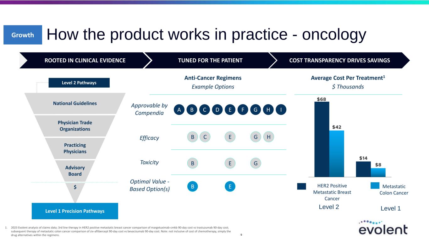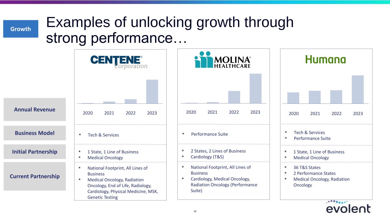 How the product works in practice - oncology Advisory Board $ Practicing Physicians Physician Trade Organizations National Guidelines Level 2 Pathways Level 1 Precision Pathways ROOTED IN CLINICAL EVIDENCE TUNED FOR THE PATIENT COST TRANSPARENCY DRIVES SAVINGS Efficacy Toxicity A B C D E G Optimal Value - Based Option(s) B C E G B E G B E HER2 Positive Metastatic Breast Cancer Metastatic Colon Cancer Level 1Level 2 H H Average Cost Per Treatment1 $ Thousands Anti-Cancer Regimens Example Options IF Approvable by Compendia 1. 2023 Evolent analysis of claims data; 3rd line therapy in HER2 positive metastatic breast cancer comparison of margetuximab-cmkb 90-day cost vs trastuzumab 90-day cost; subsequent therapy of metastatic colon cancer comparison of ziv-aflibercept 90-day cost vs bevacizumab 90-day cost. Note: not inclusive of cost of chemotherapy, simply the drug alternatives within the regimens. 9
