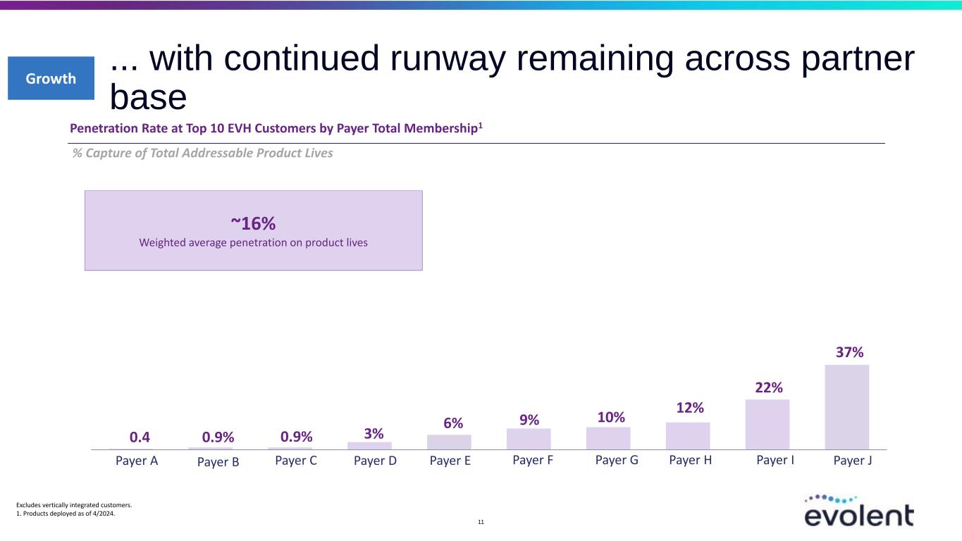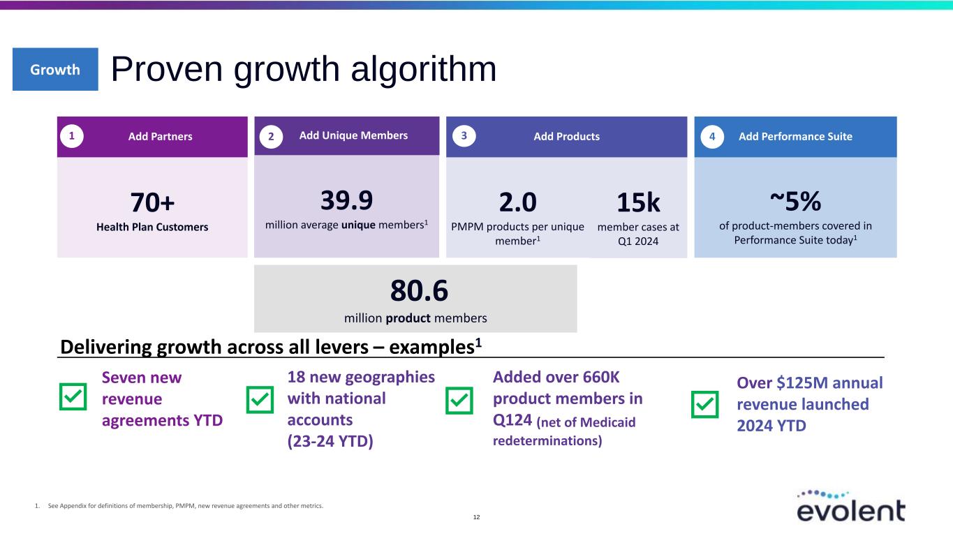 ... with continued runway remaining across partner base Penetration Rate at Top 10 EVH Customers by Payer Total Membership1 % Capture of Total Addressable Product Lives 11 Excludes vertically integrated customers.​ 1. Products deployed as of 4/2024. ~16% Weighted average penetration on product lives Payer A Payer D Payer HPayer B Payer E Payer GPayer C Payer I 0.4 0.9% 0.9% 3% 6% 9% 10% 12% 22% 37% Payer F Payer J